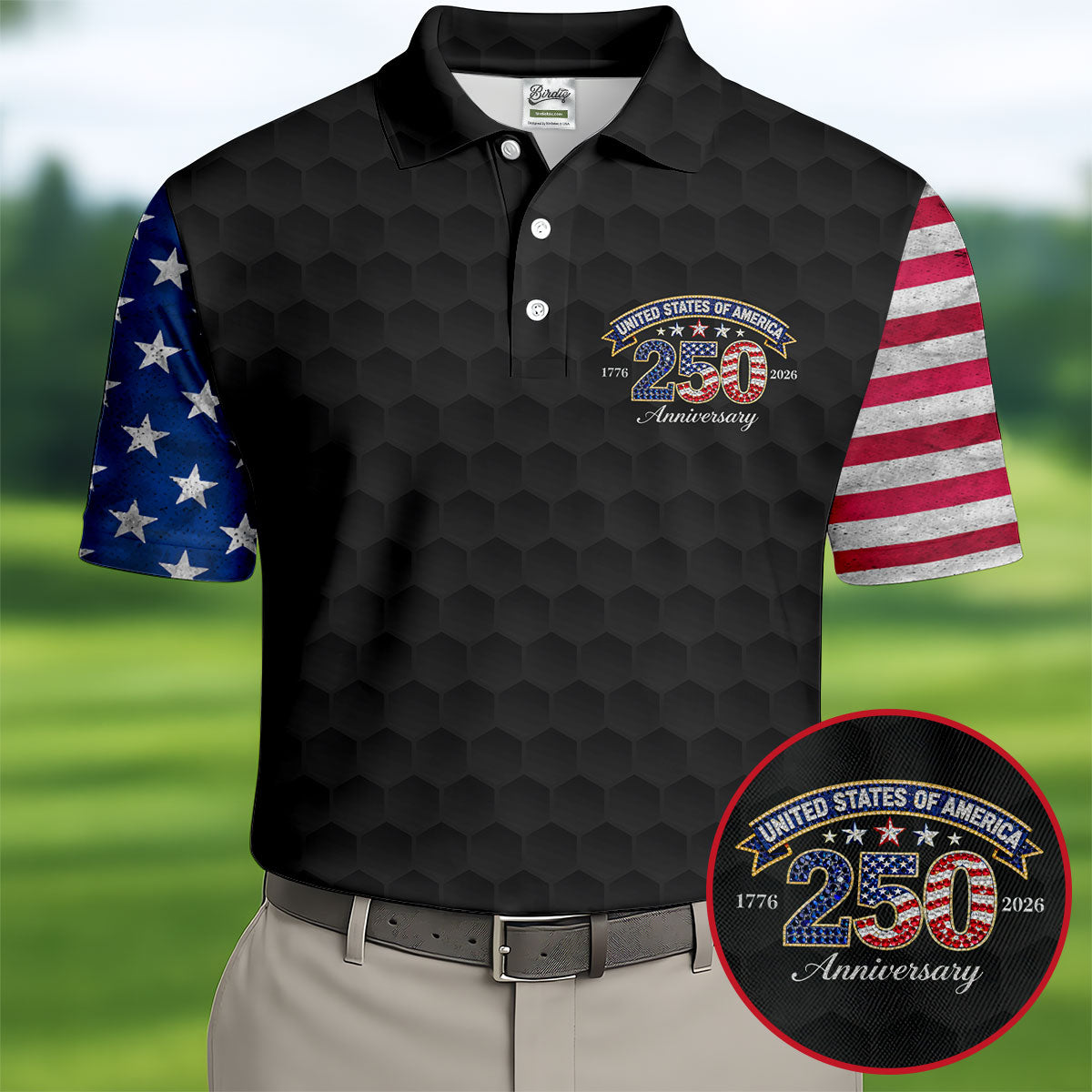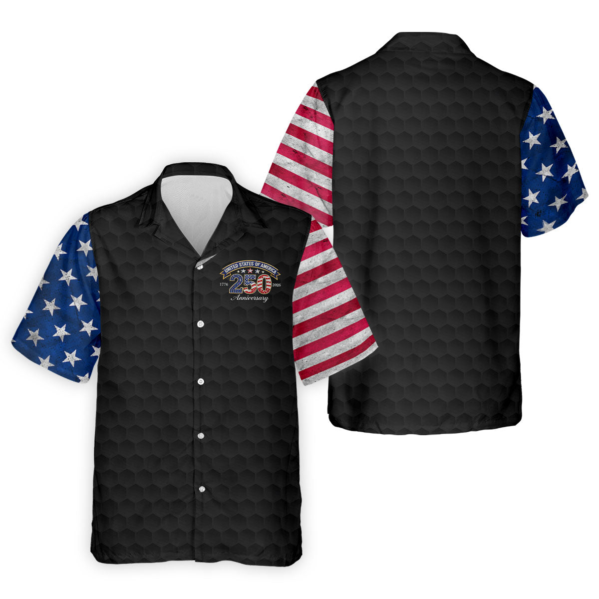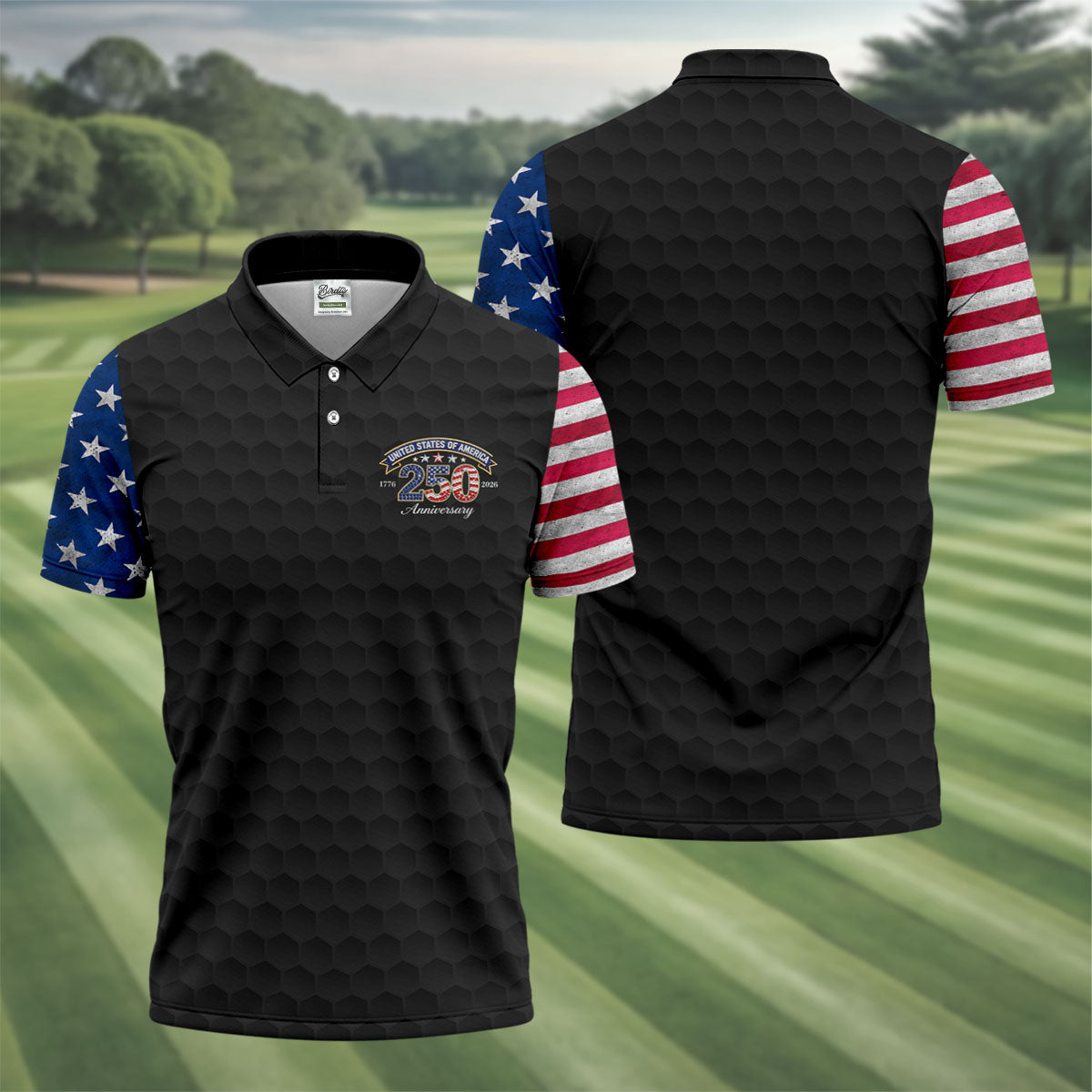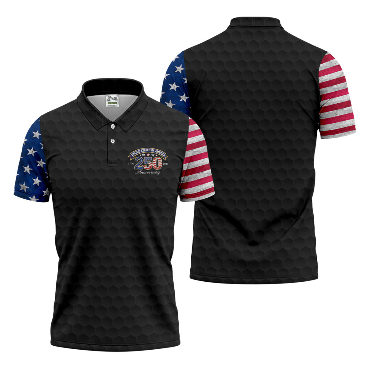 250th Anniversary Golf Ball Pattern Black Golf Shirt, Patriotic 4th Of July Golf Shirt, Golf Shirts For Men