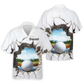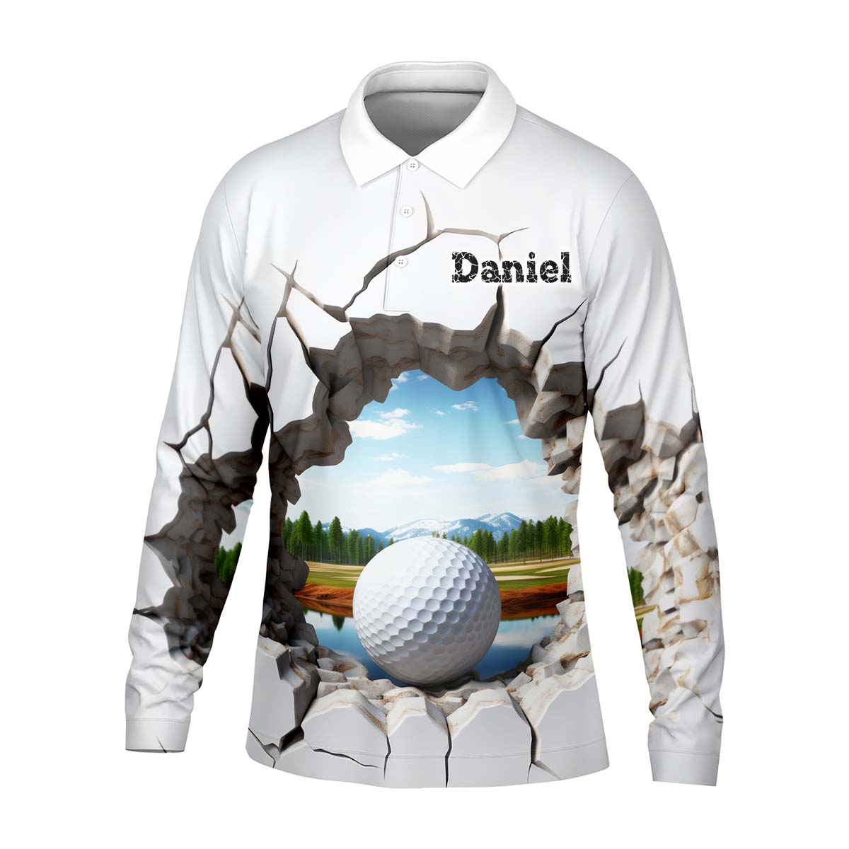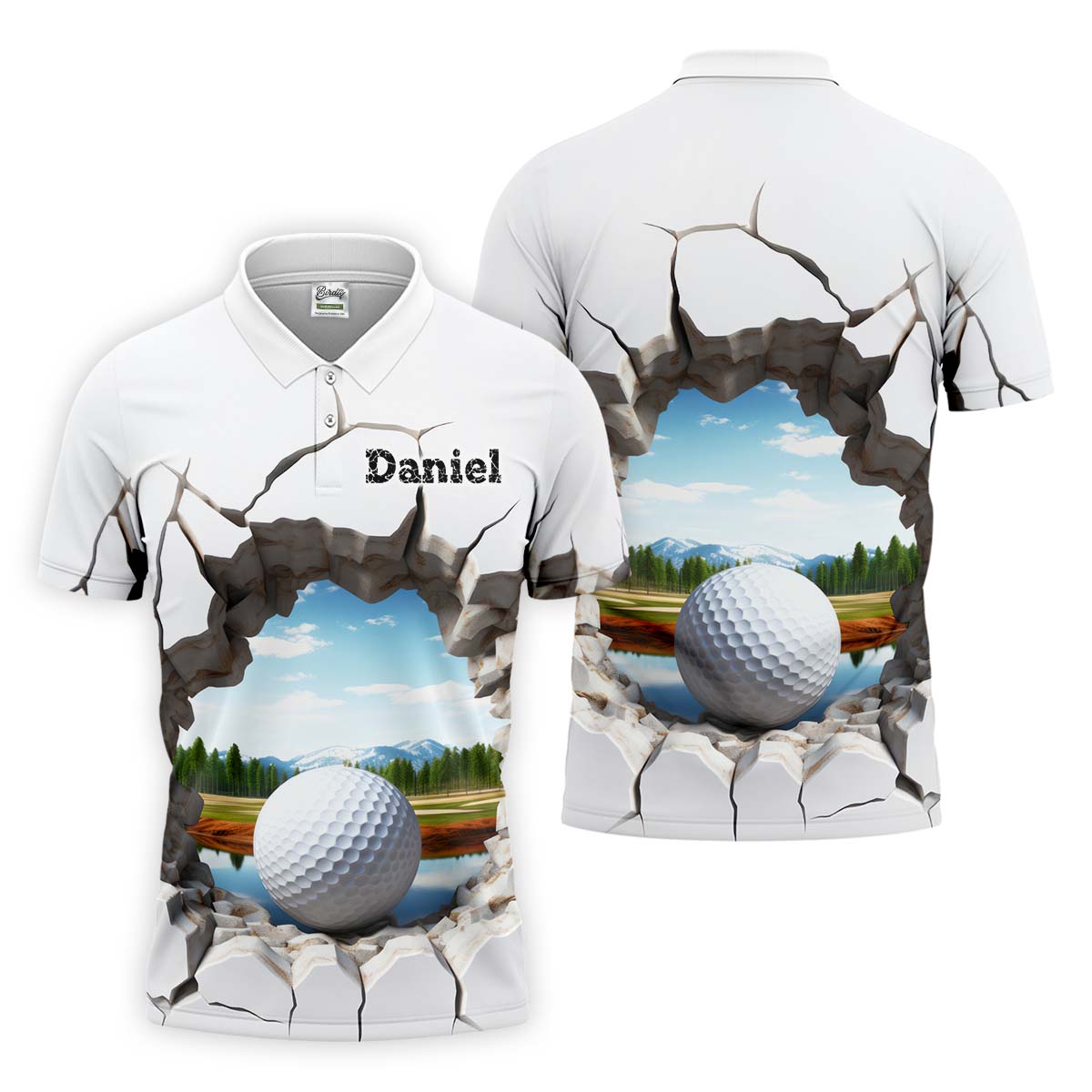 3D Golf Ball Lake Hole In A Wall Fun Men's Golf Polos, Unique Gift For Golfer, Mens White Polo