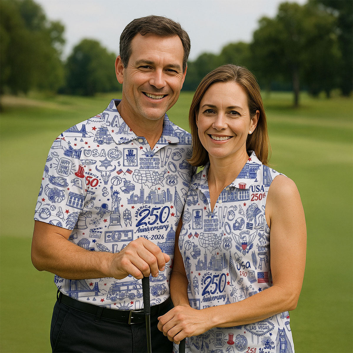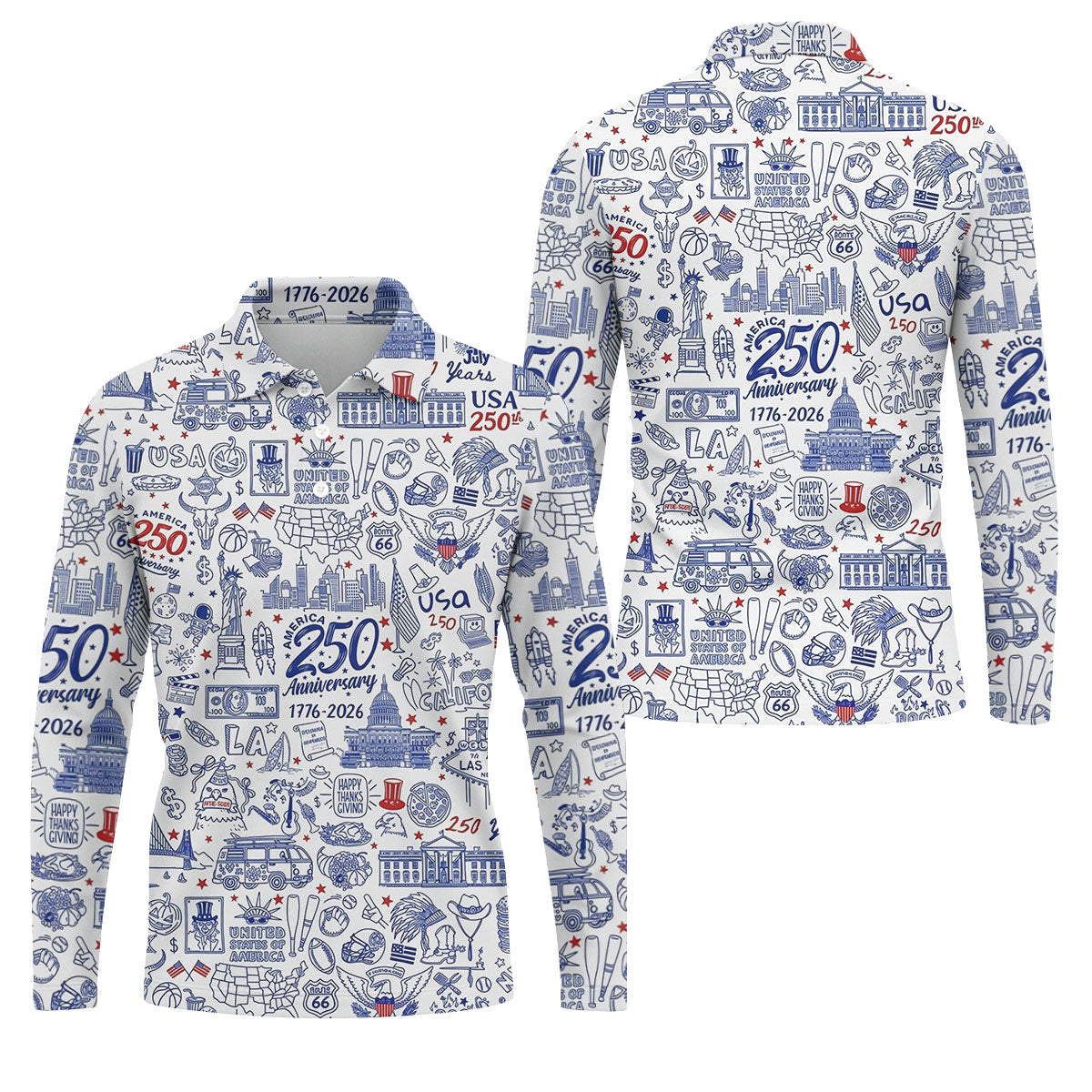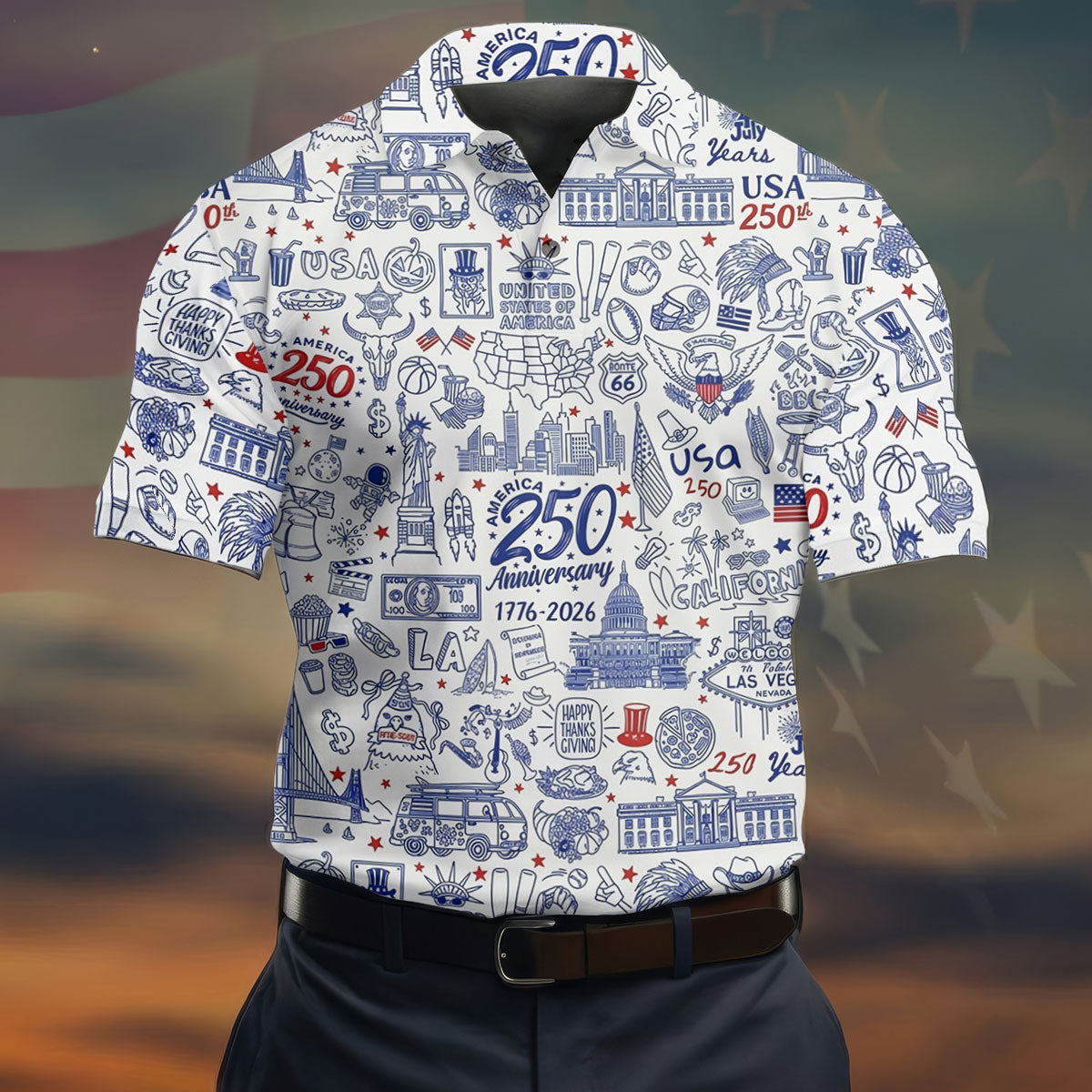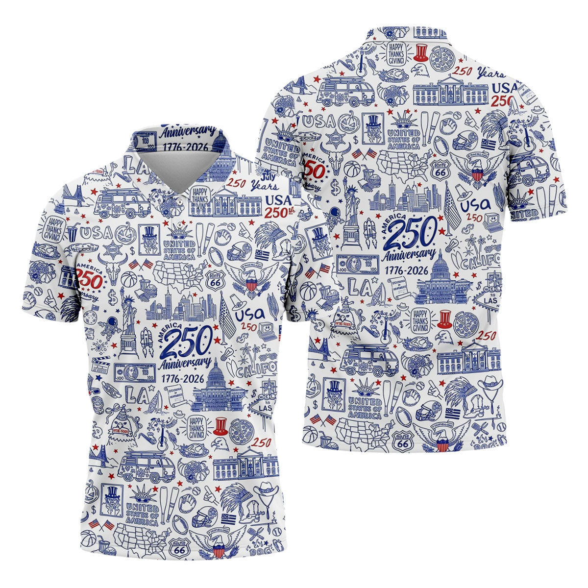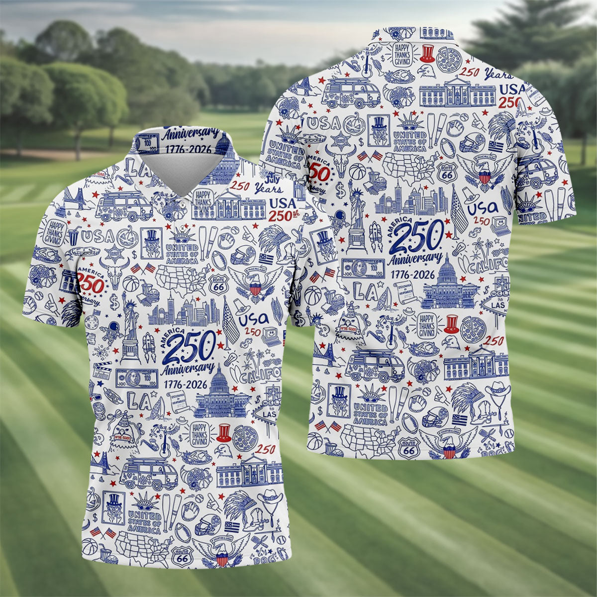 America 250 Anniversary US Symbols Doodle Pattern Patriotic Golf Shirt, 4th Of July Golf Shirts For Men