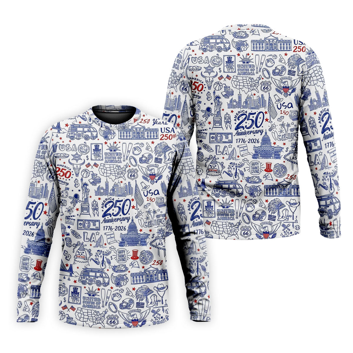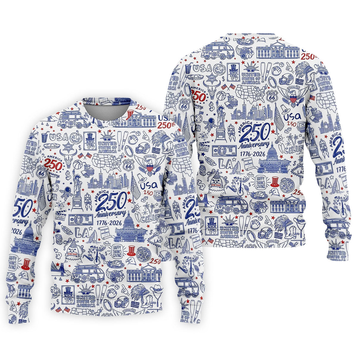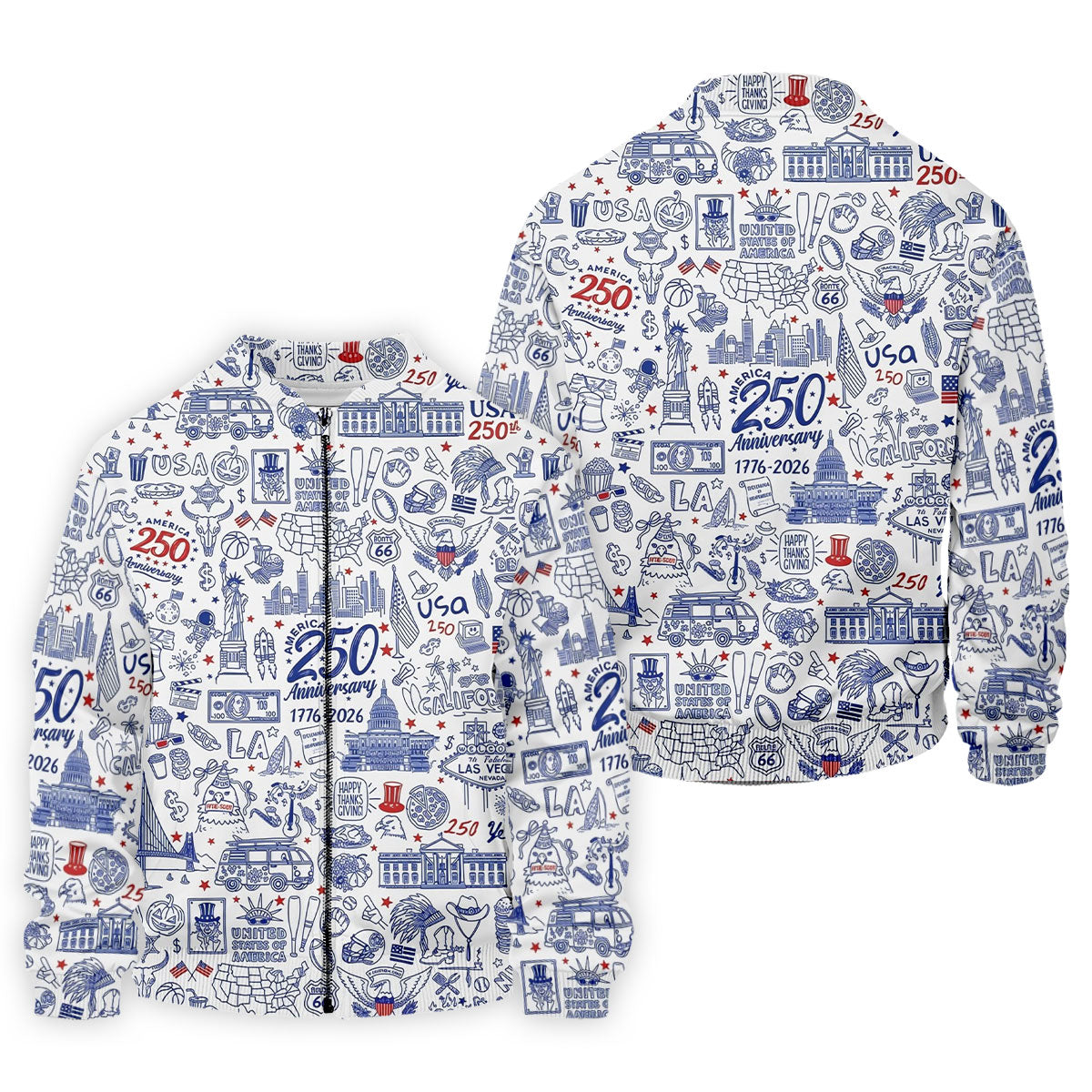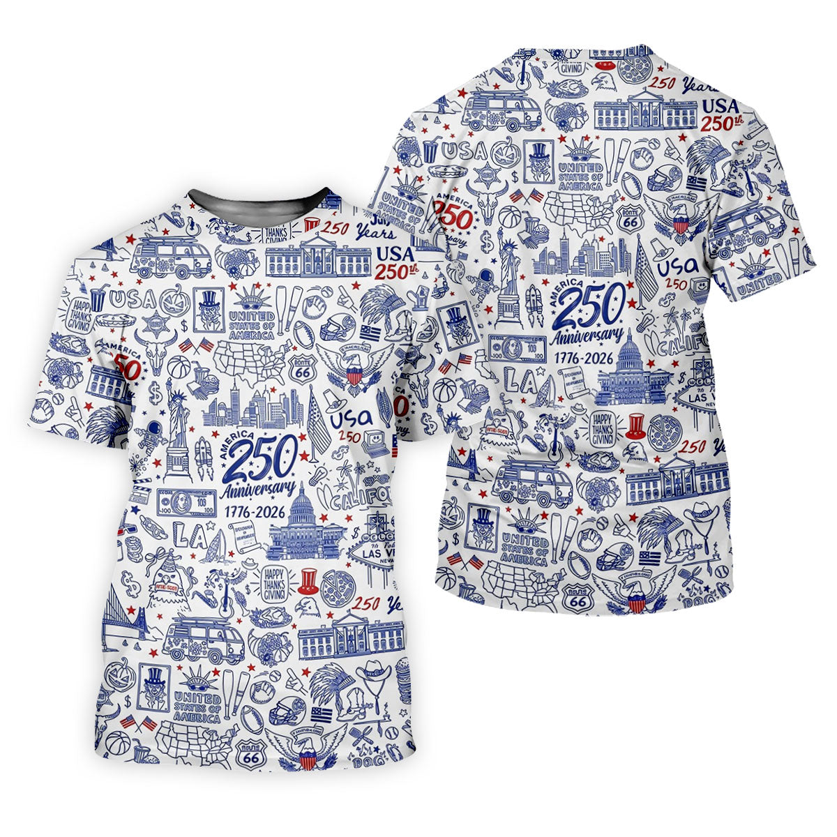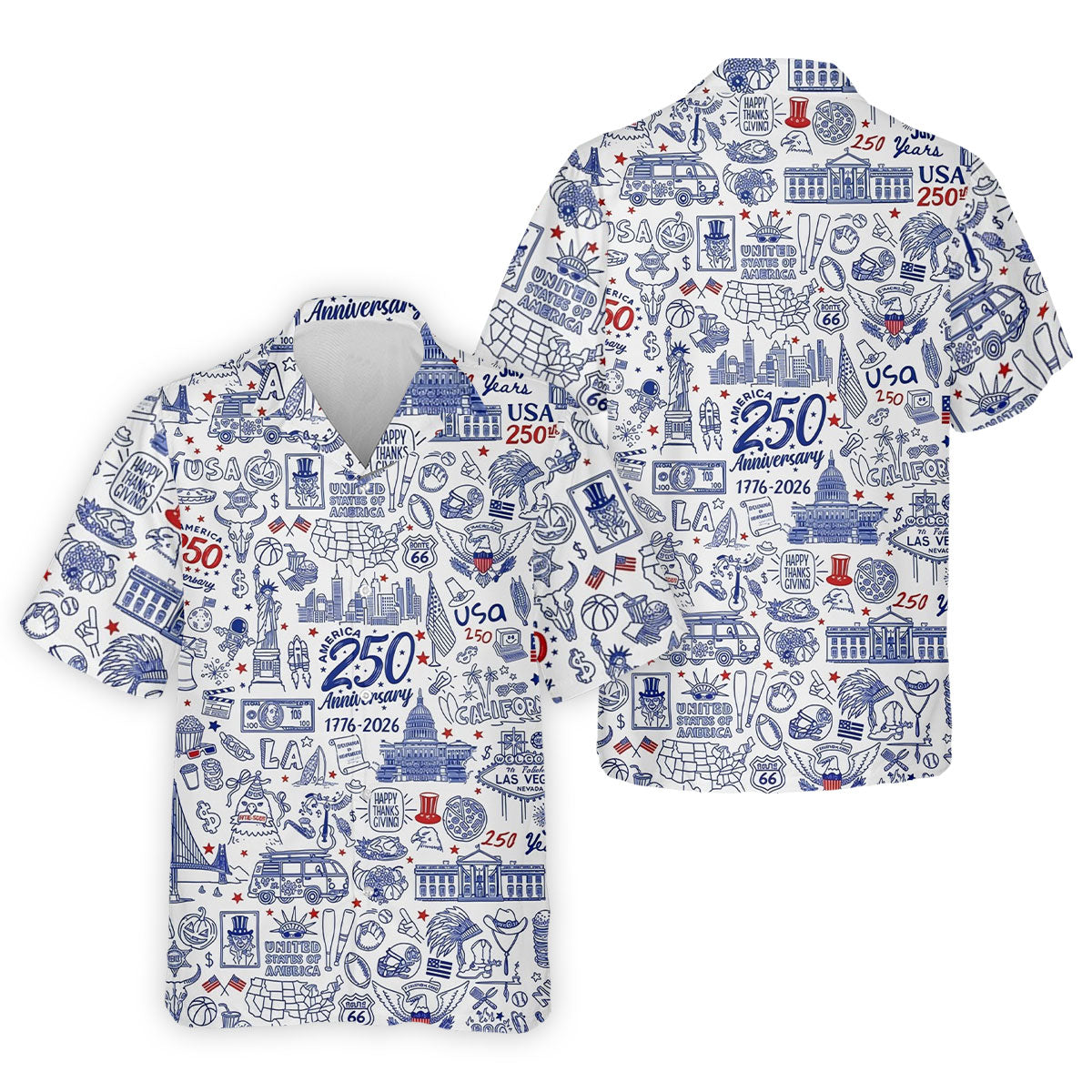 America 250 Anniversary US Symbols Doodle Pattern Patriotic Golf Shirt, 4th Of July Golf Shirts For Men
