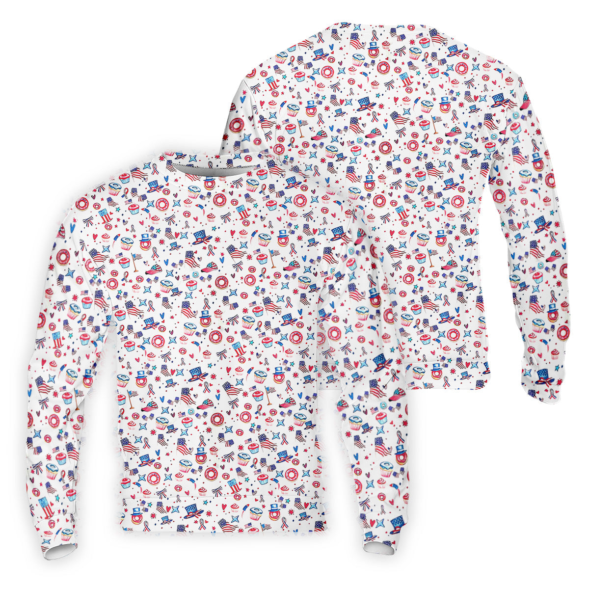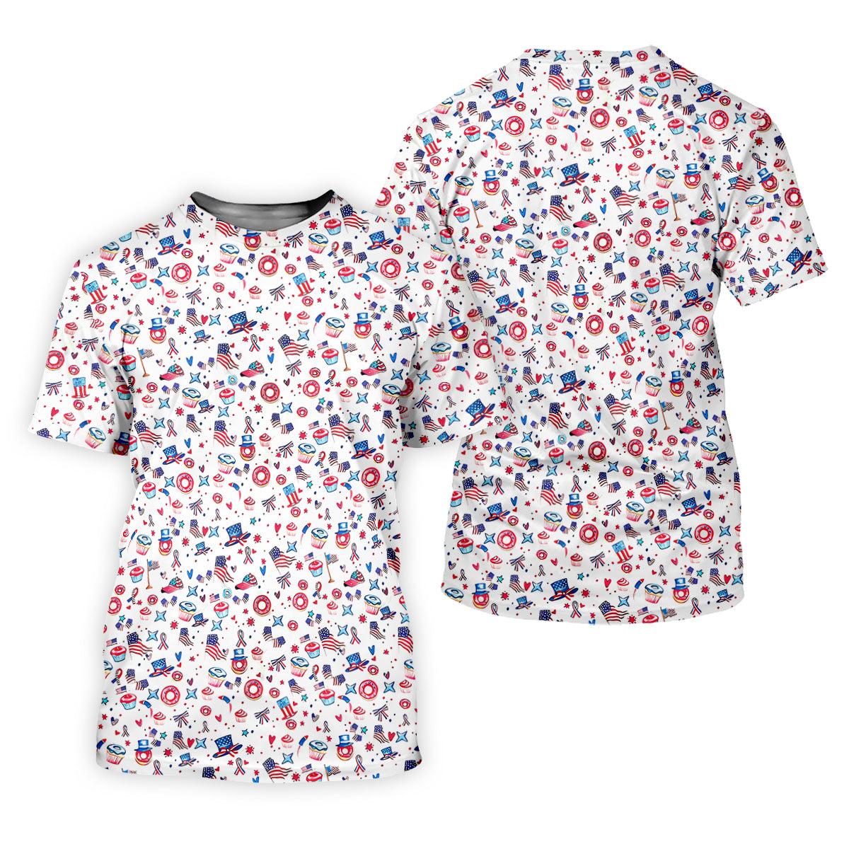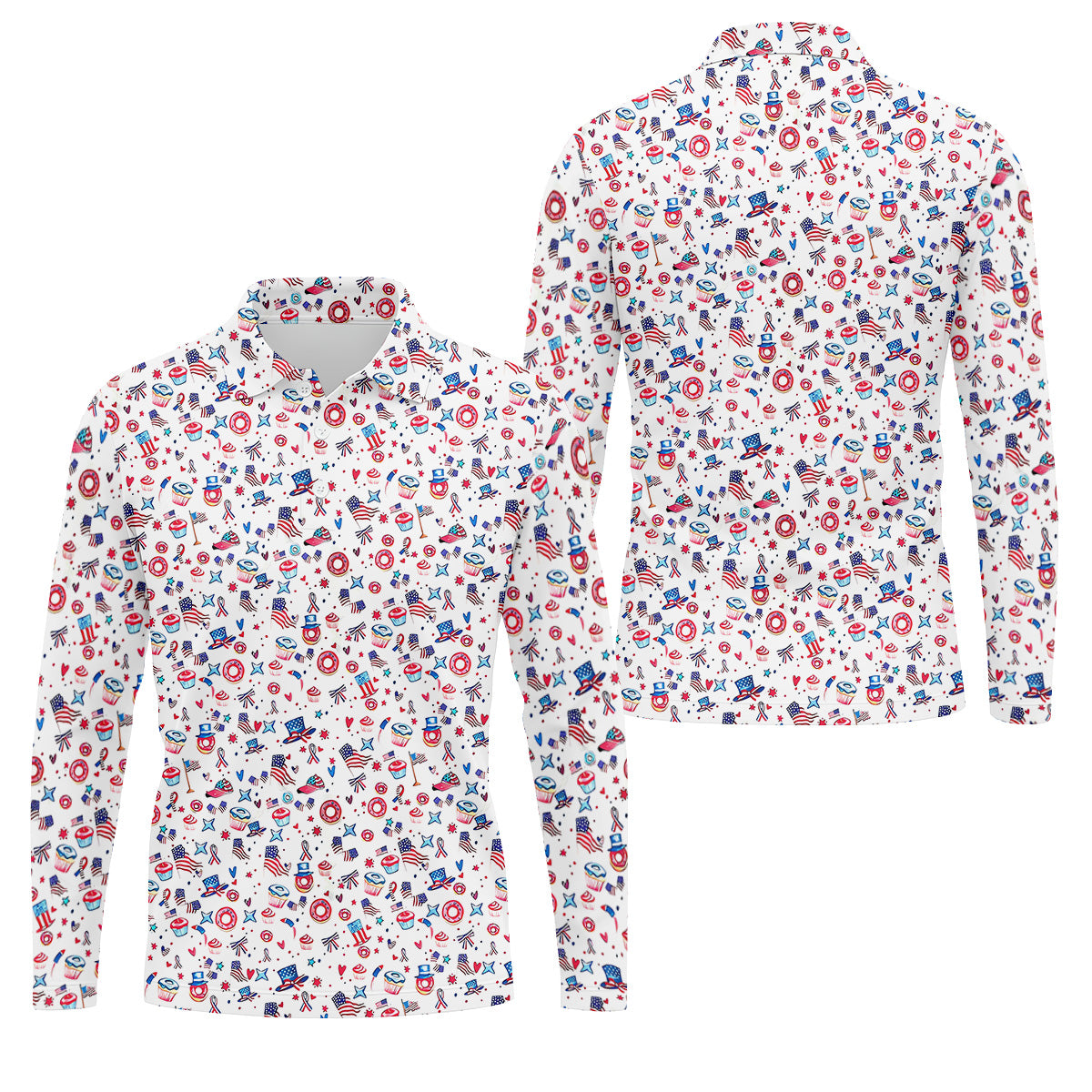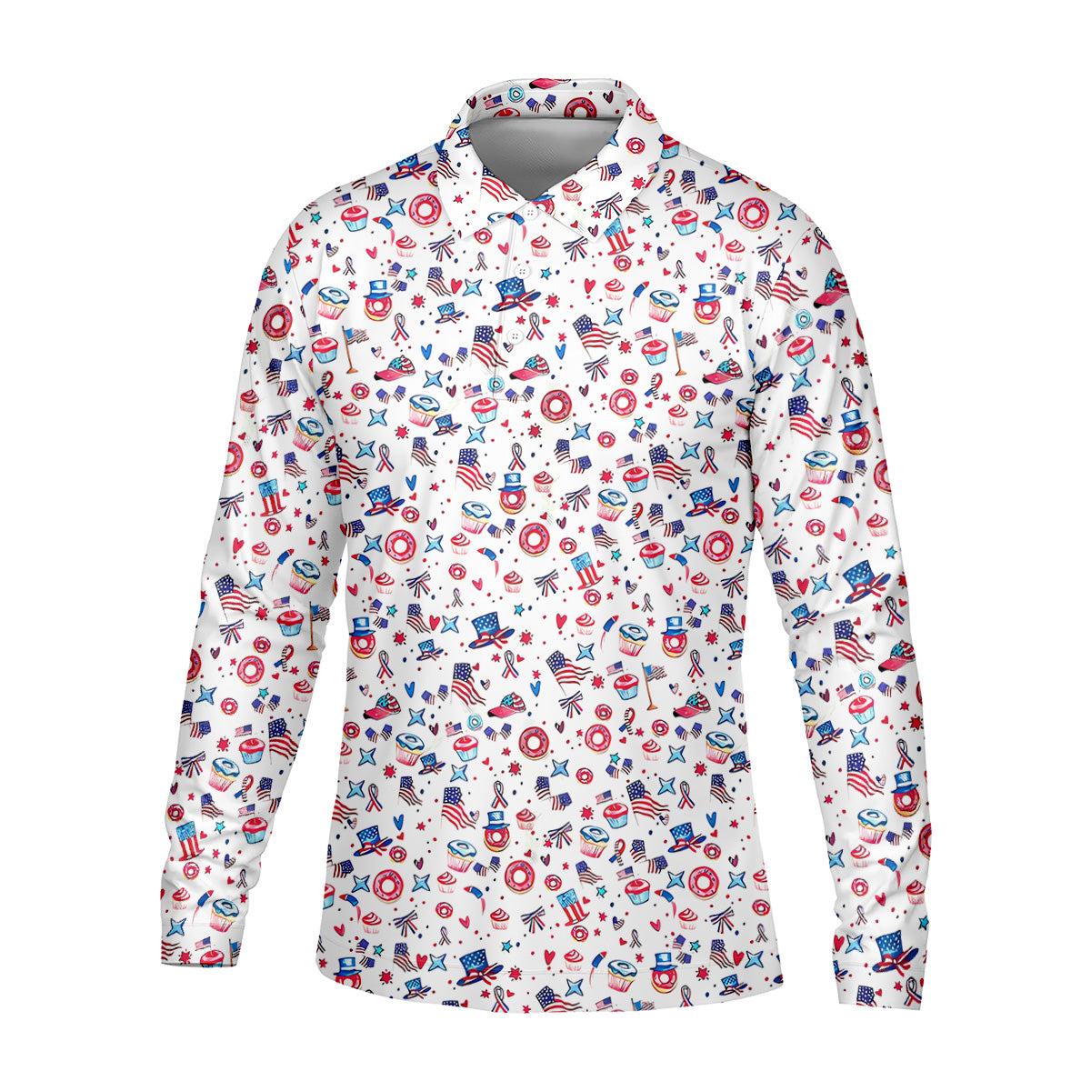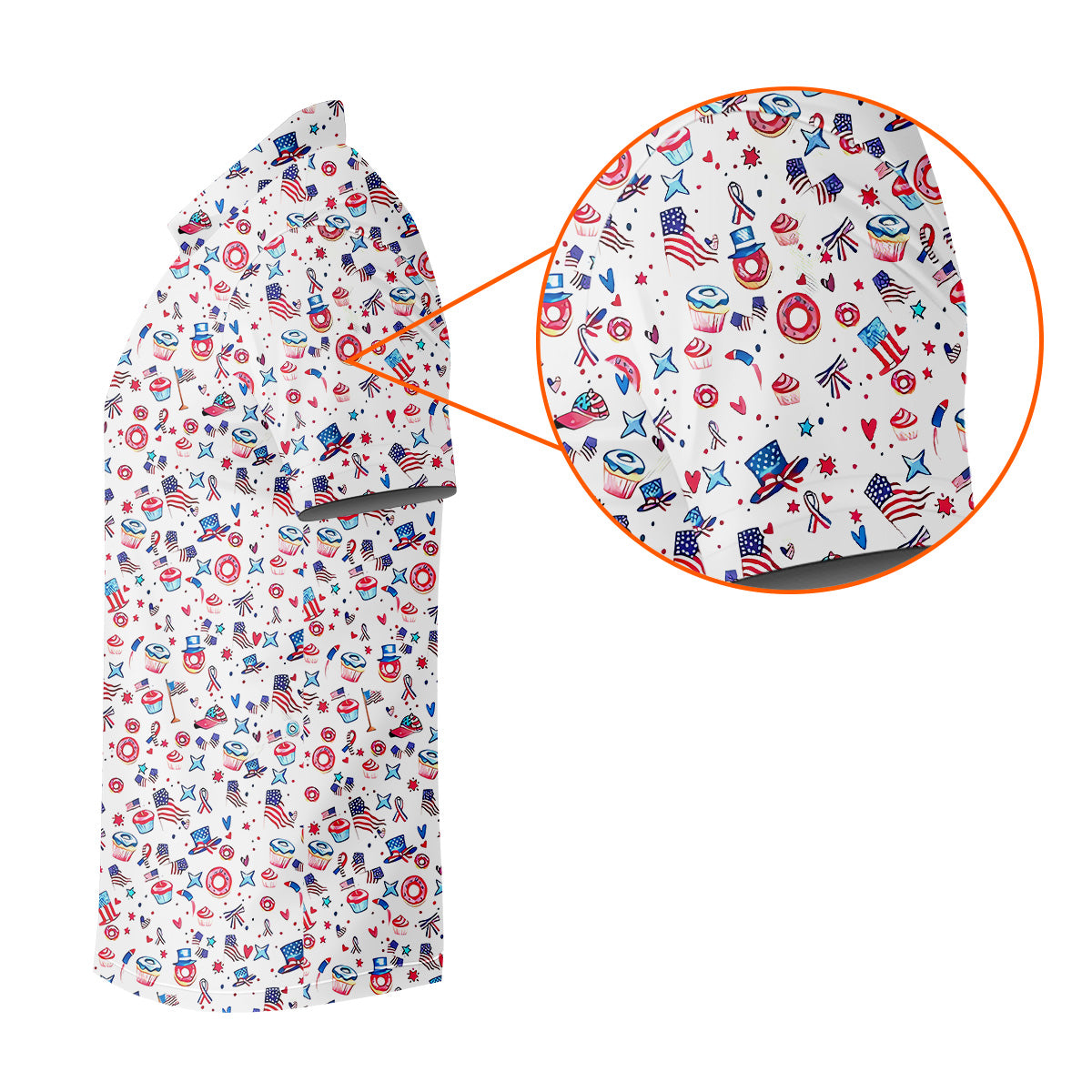 Meet the American Flag Donut Pattern Fun Men's Golf Polos, White Polo Shirt Mens, Golf Shirts For Men, Golfing Apparel – a shirt so bold it makes argyle cry in the corner. Designed for golfers who'd rather make a fashion statement than follow dress codes, this polo is your ticket to turning heads, raising eyebrows, and maybe distracting your buddies just enough to win a few holes. (We’re not saying it’s cheating... we’re saying it’s strategy.)