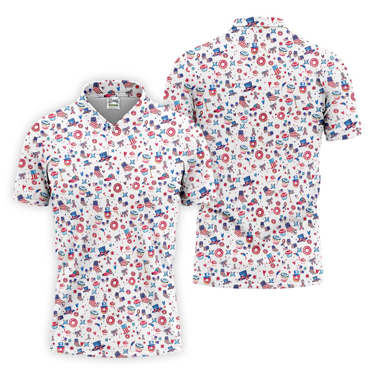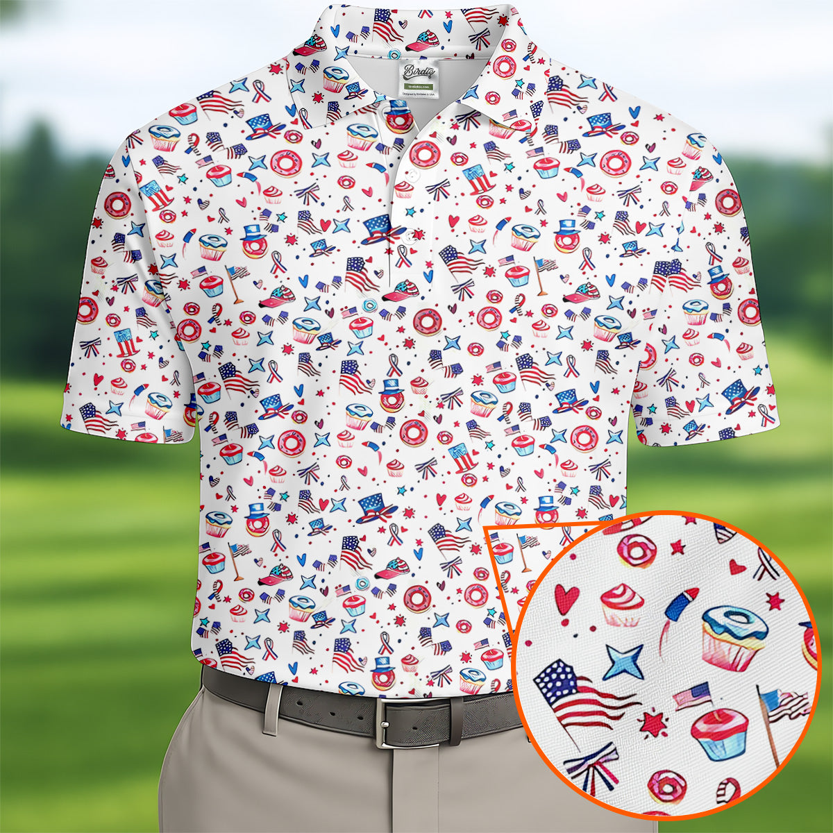 American Flag Donut Pattern Fun Men's Golf Polos, White Polo Shirt Mens, Golf Shirts For Men, Golfing Apparel