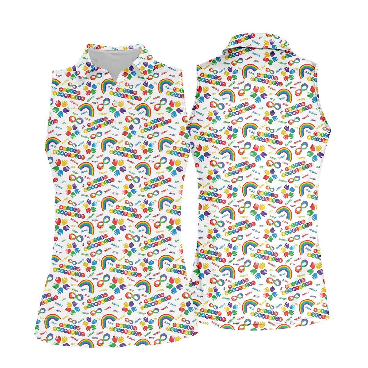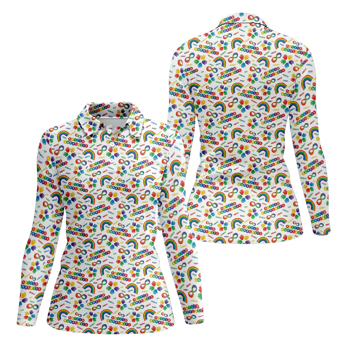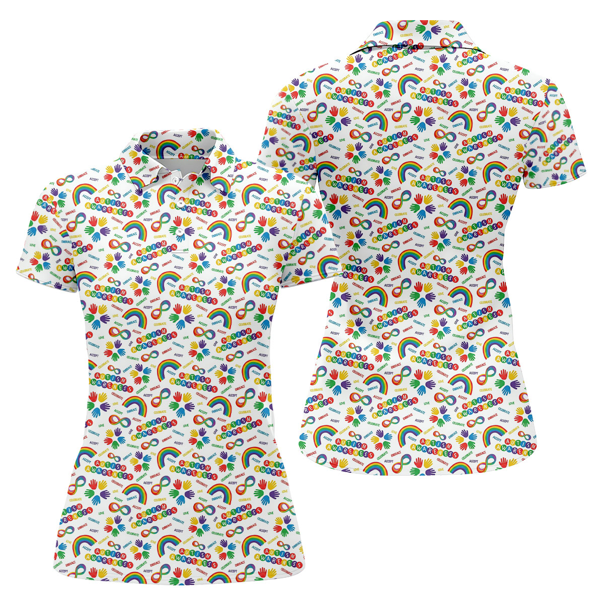 Autism Awareness Rainbow Pattern Colorful Handprints White Golf Shirt, Golf Shirt For Women