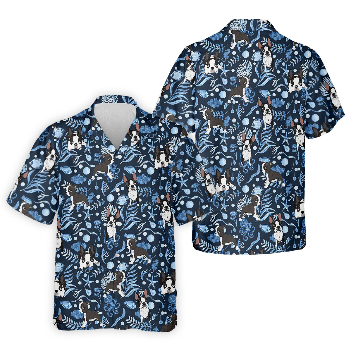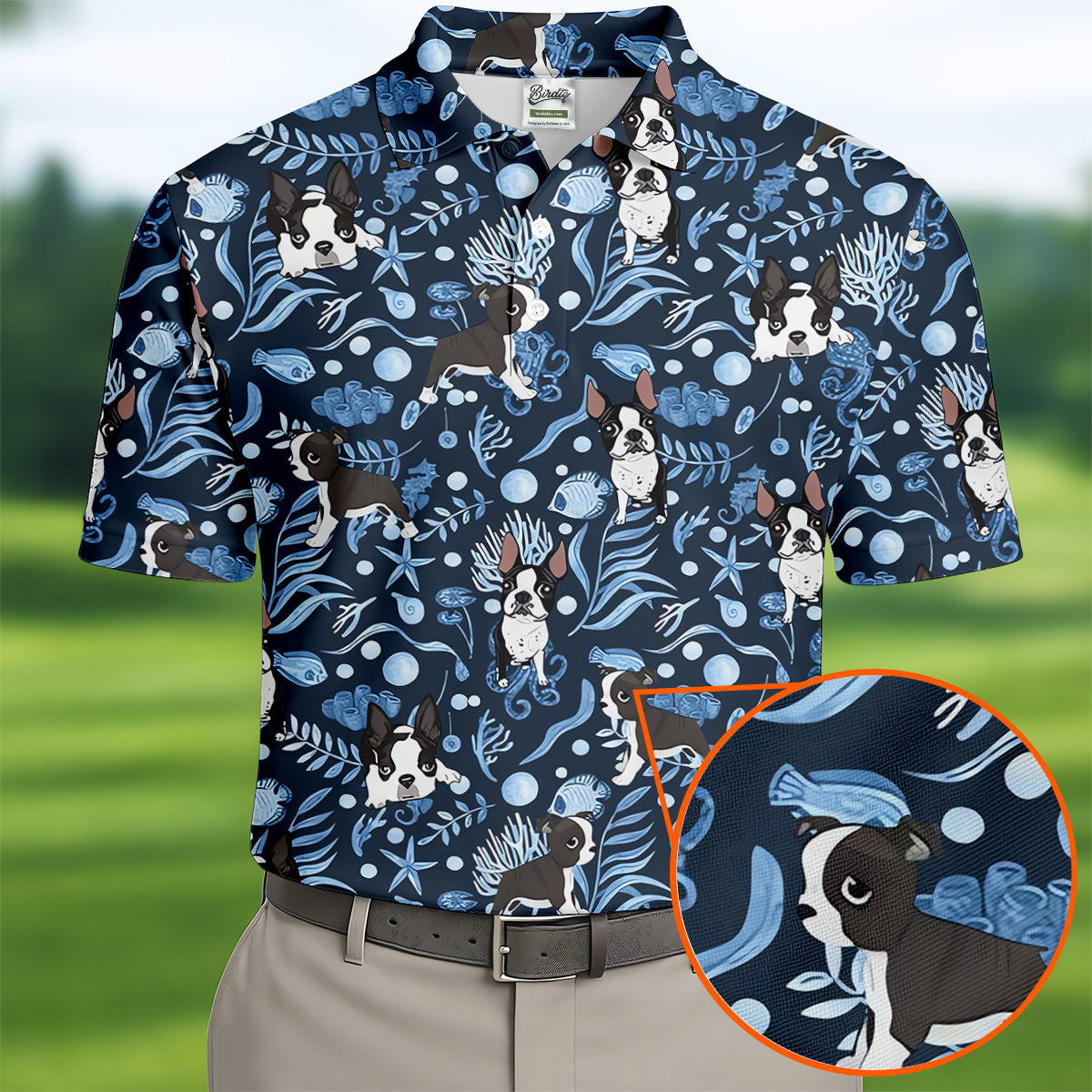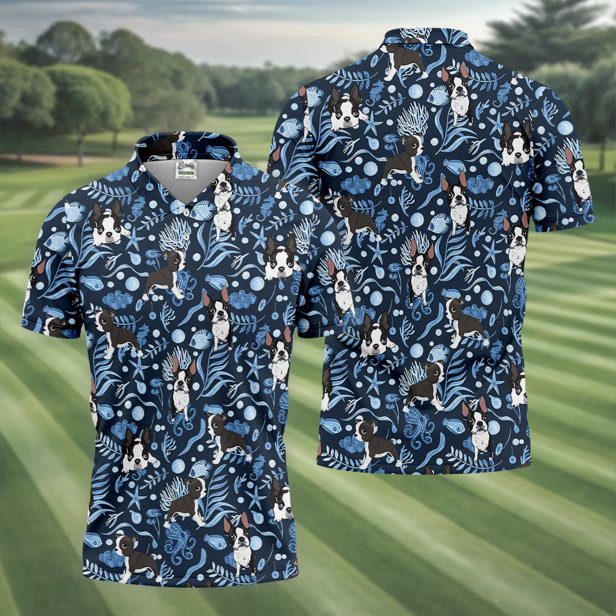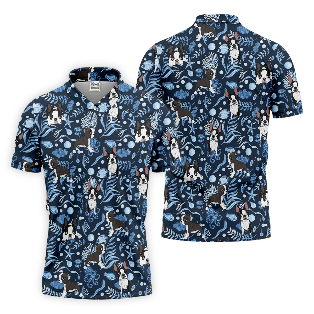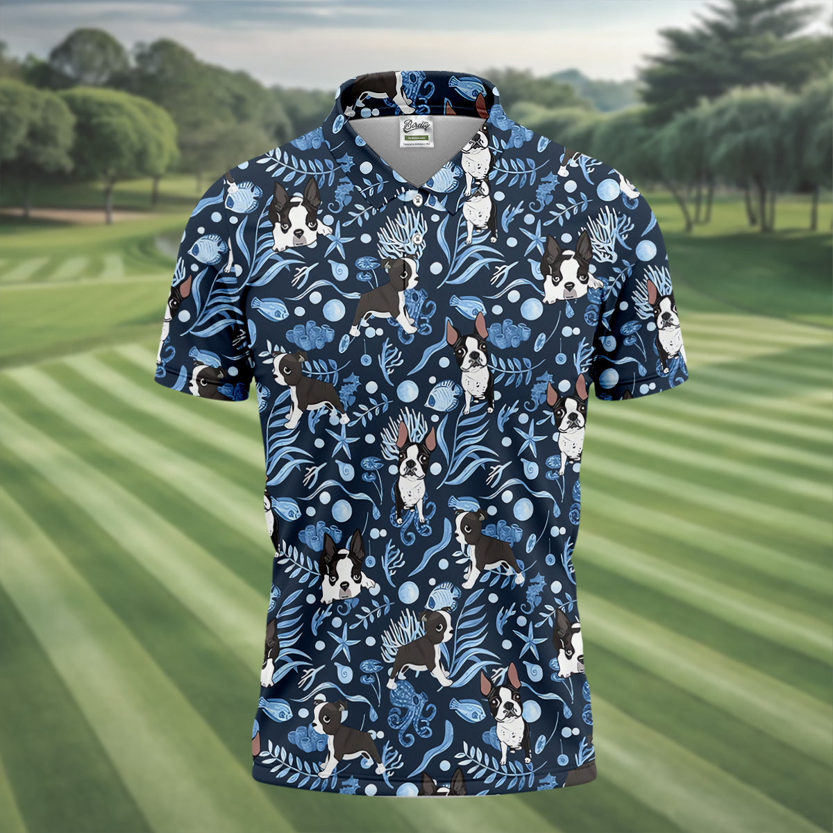 Boston Terrier Ocean Vibe Blue Tropical Golf Shirts, Men's Funny Golf Shirts, Gifts For Dog Lovers