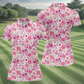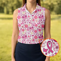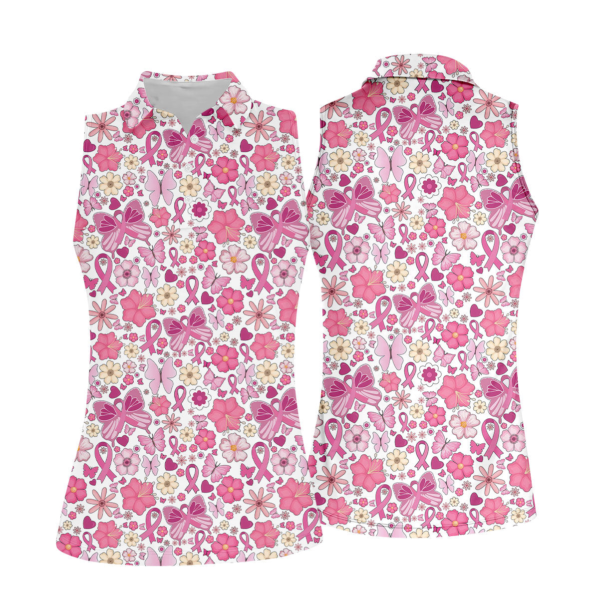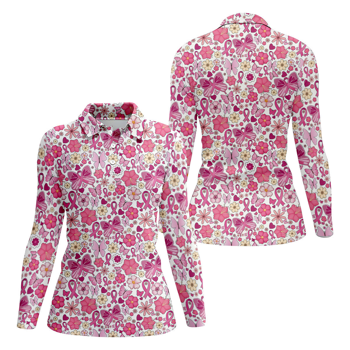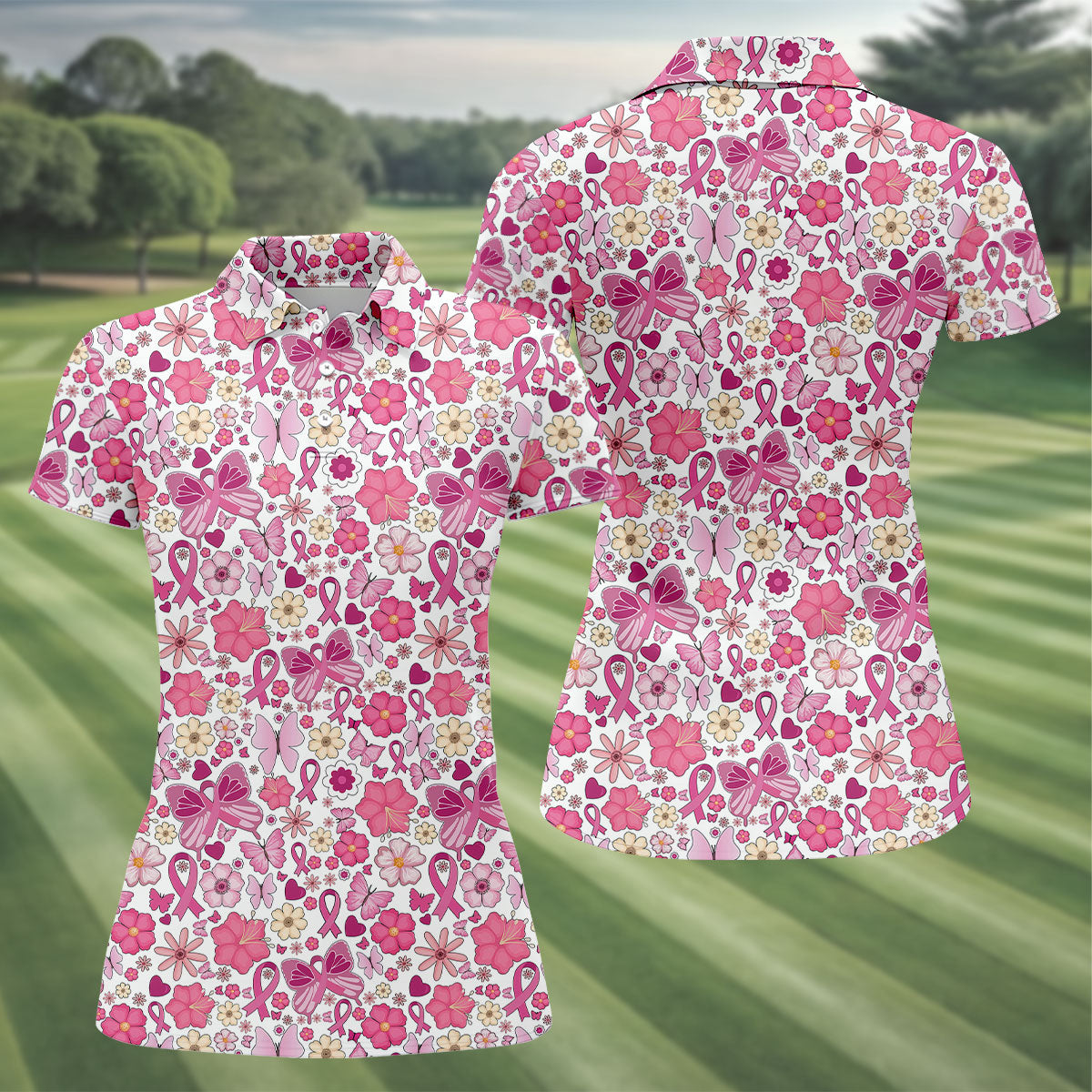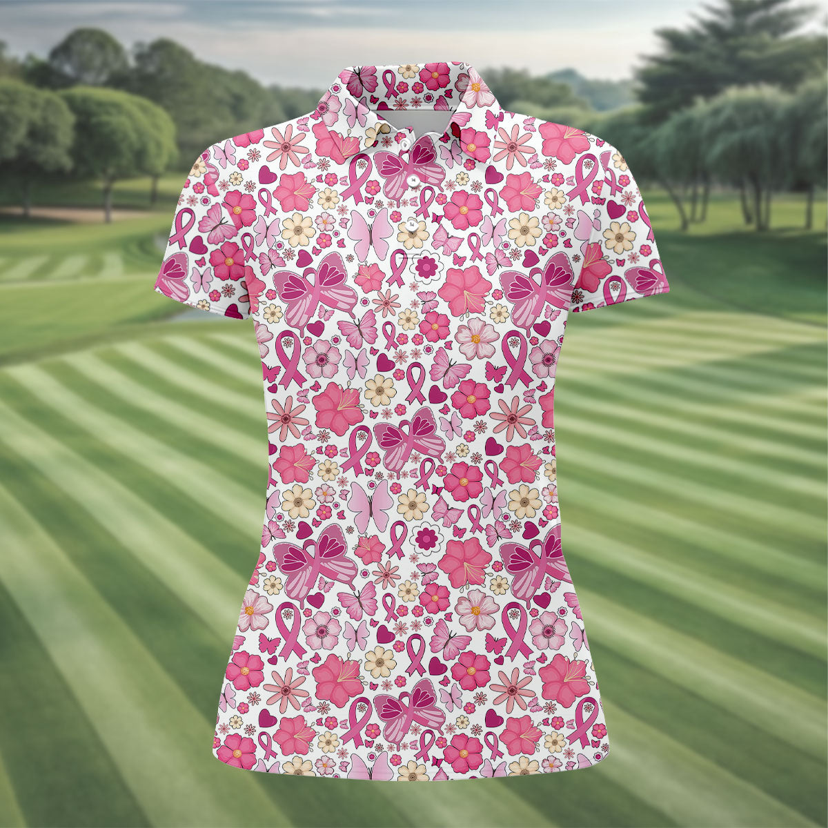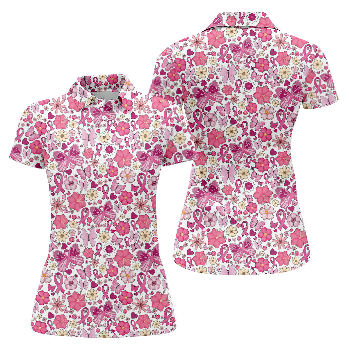 Breast Cancer Pink Ribbon Floral Golf Shirt, Cancer Awareness Shirt, Ladies Golf Polos, Golfing Apparel