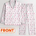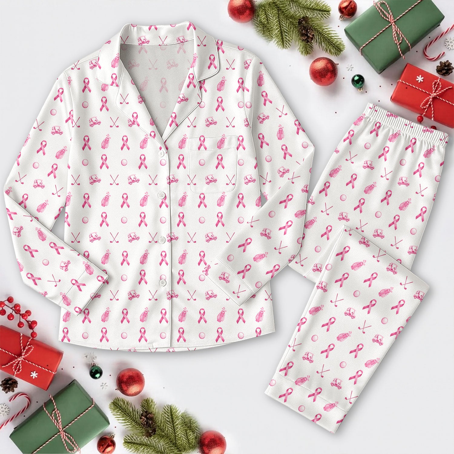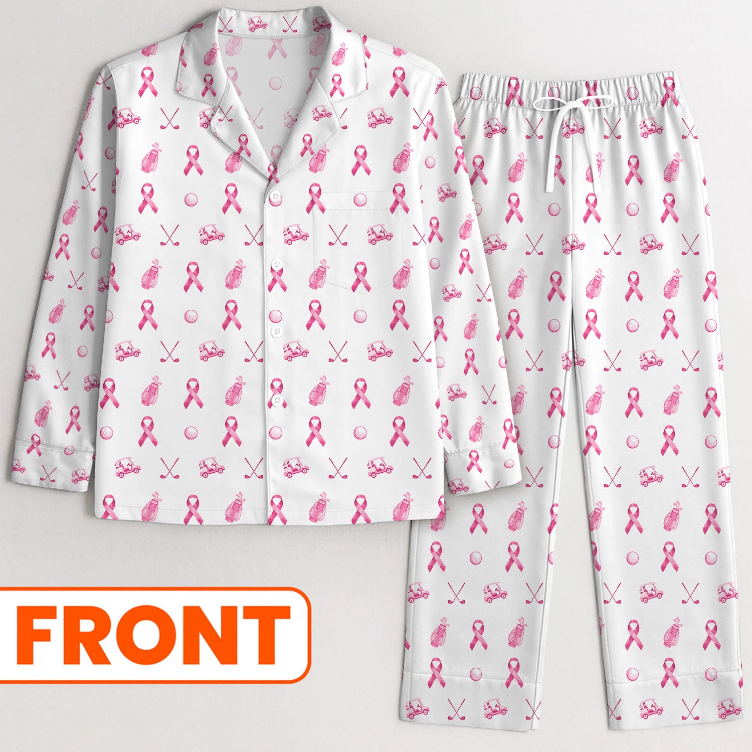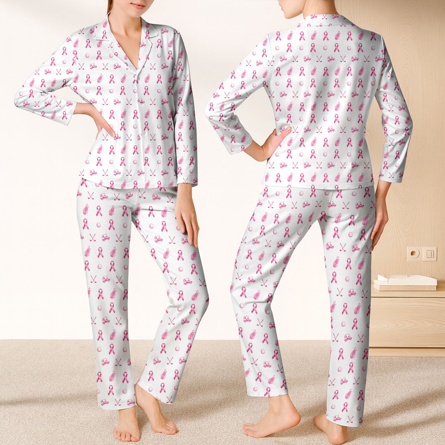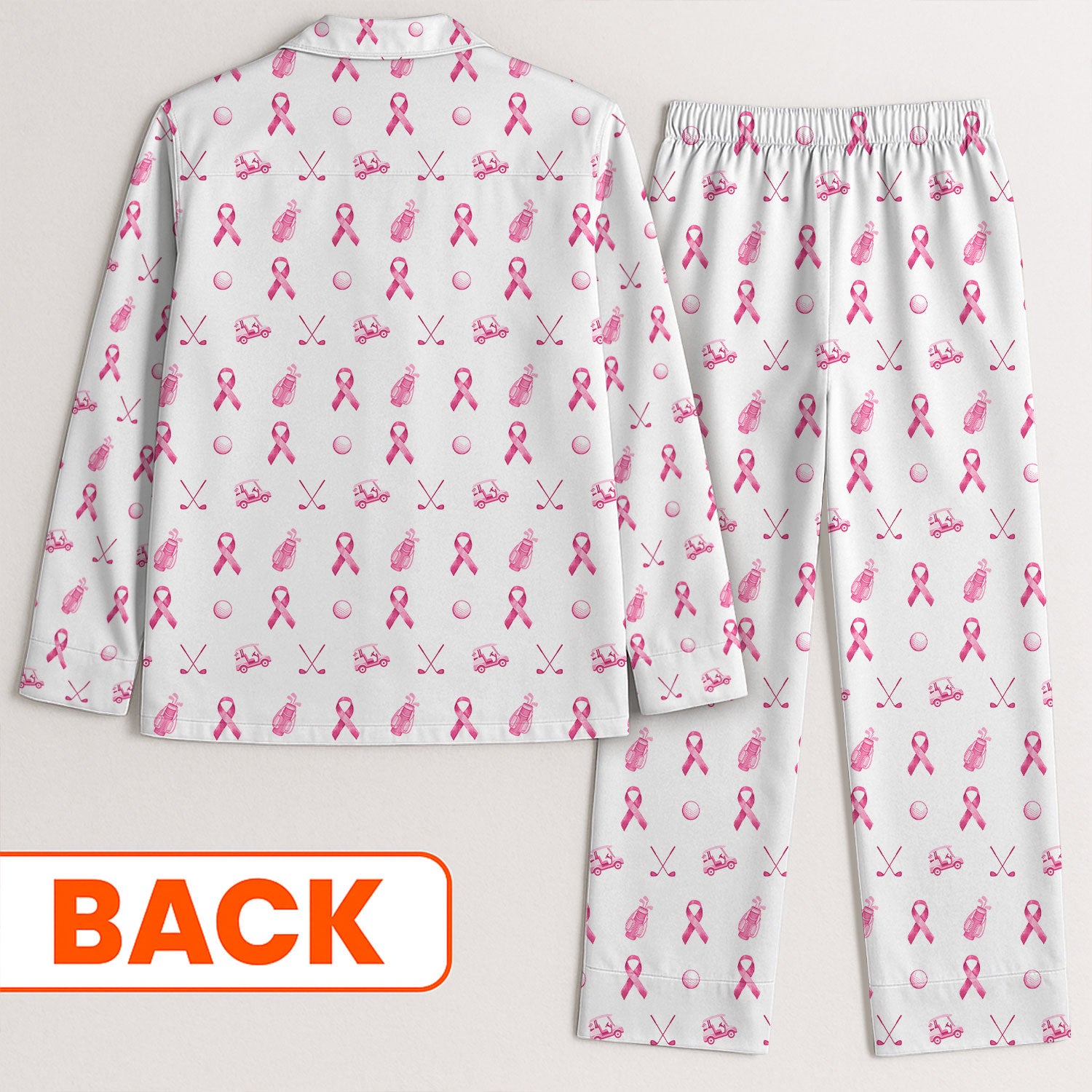 Breast Cancer Pink Ribbon With Golf Pattern Long Pajama Set, White Satin Pajama Set