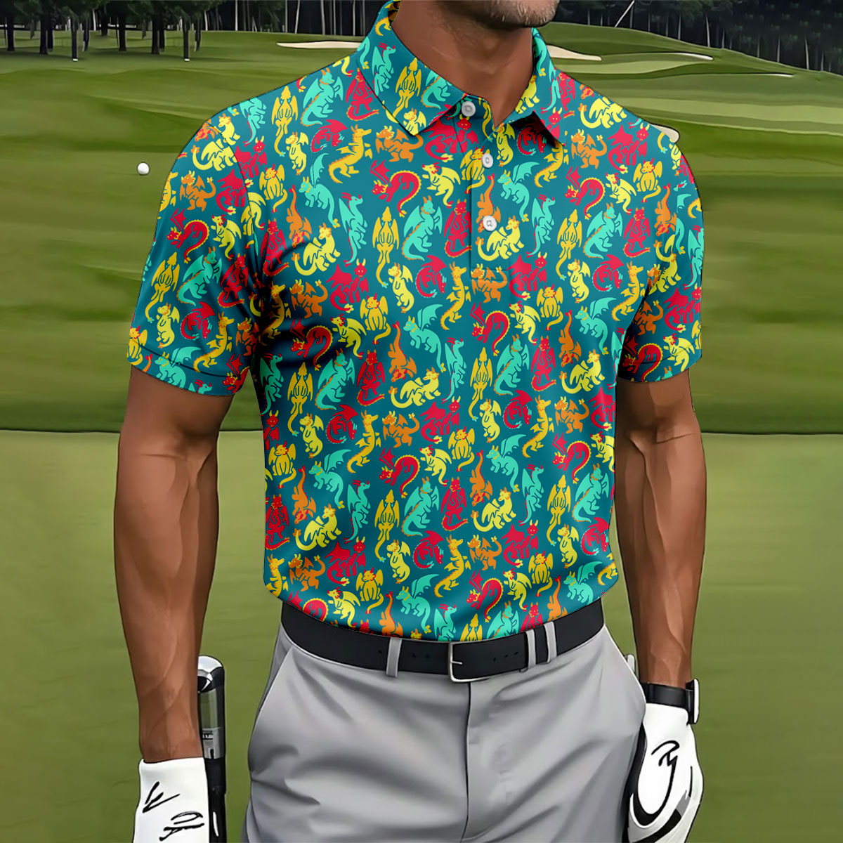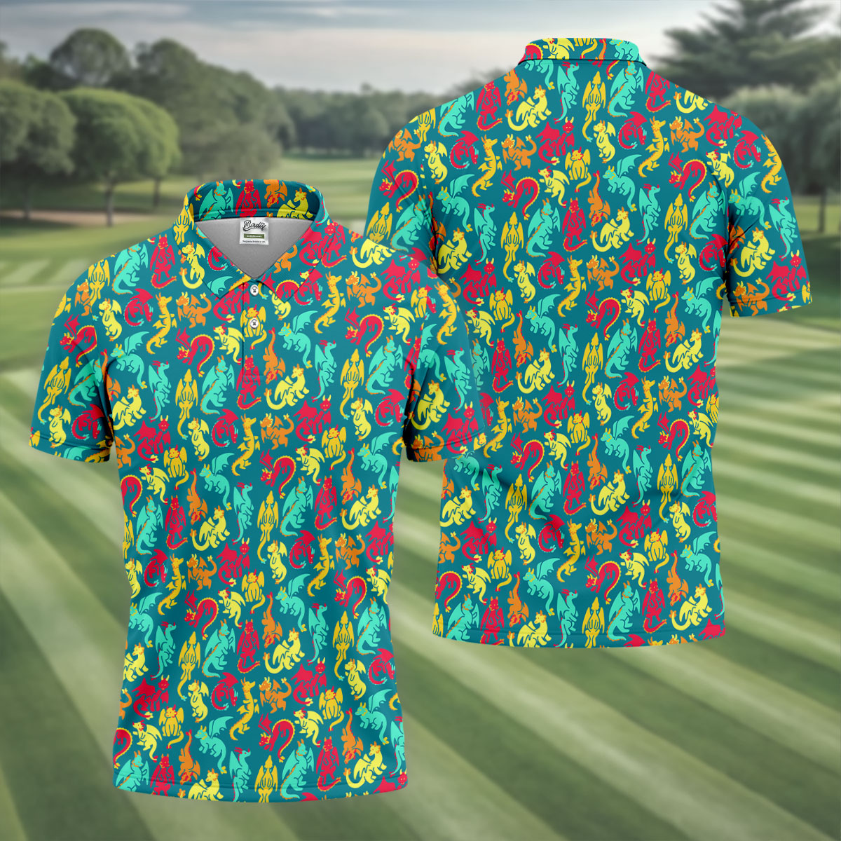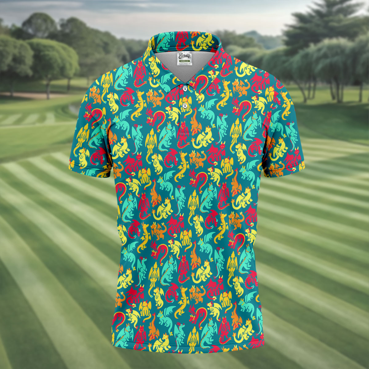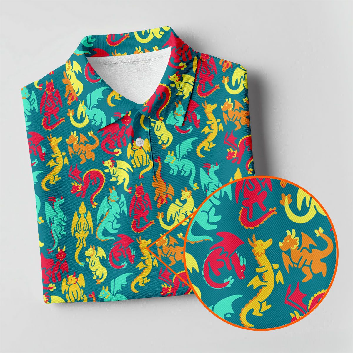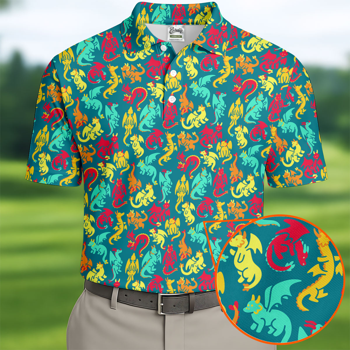 Cartoon Dragons Colorful Golf Shirt, Cute Golf Outfit, Polo Shirts For Men, Golf Shirts For Men