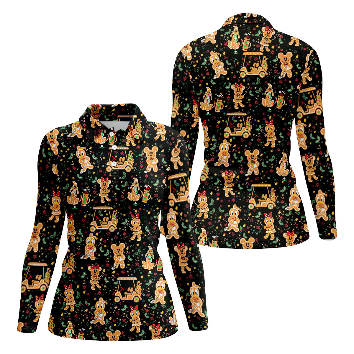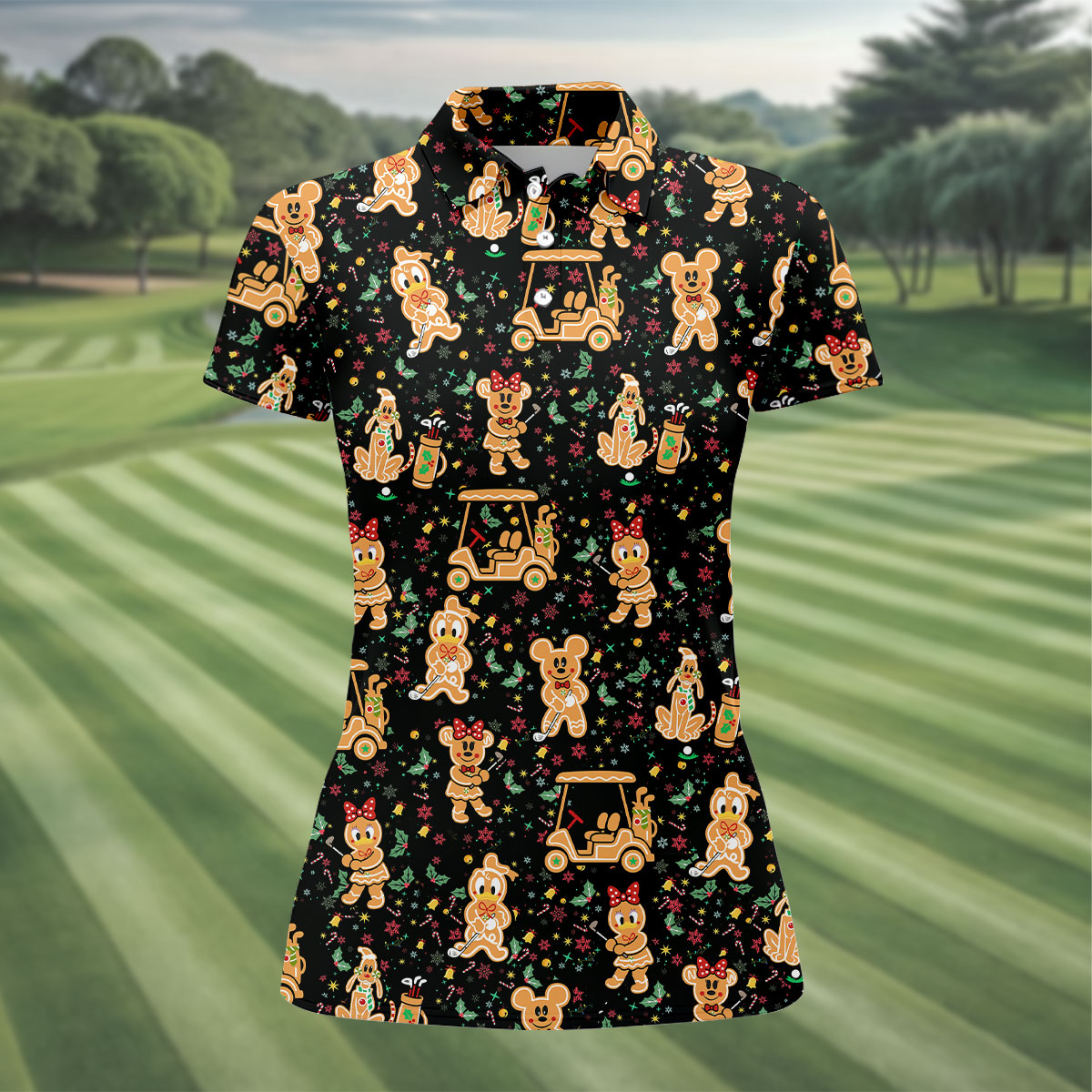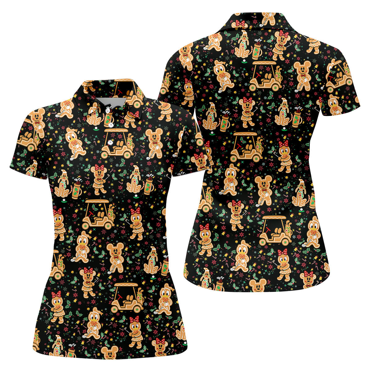 Cartoon Gingerbread Black Golf Shirt, Christmas Golf Shirt, Ladies Golf Shirts, Women's Polo Shirt