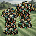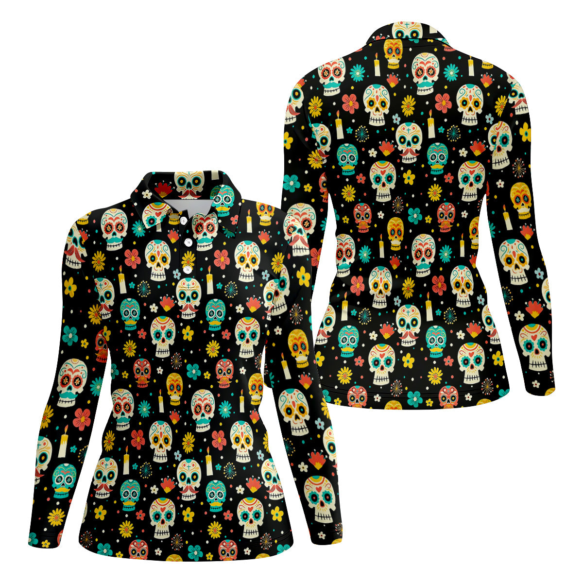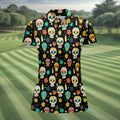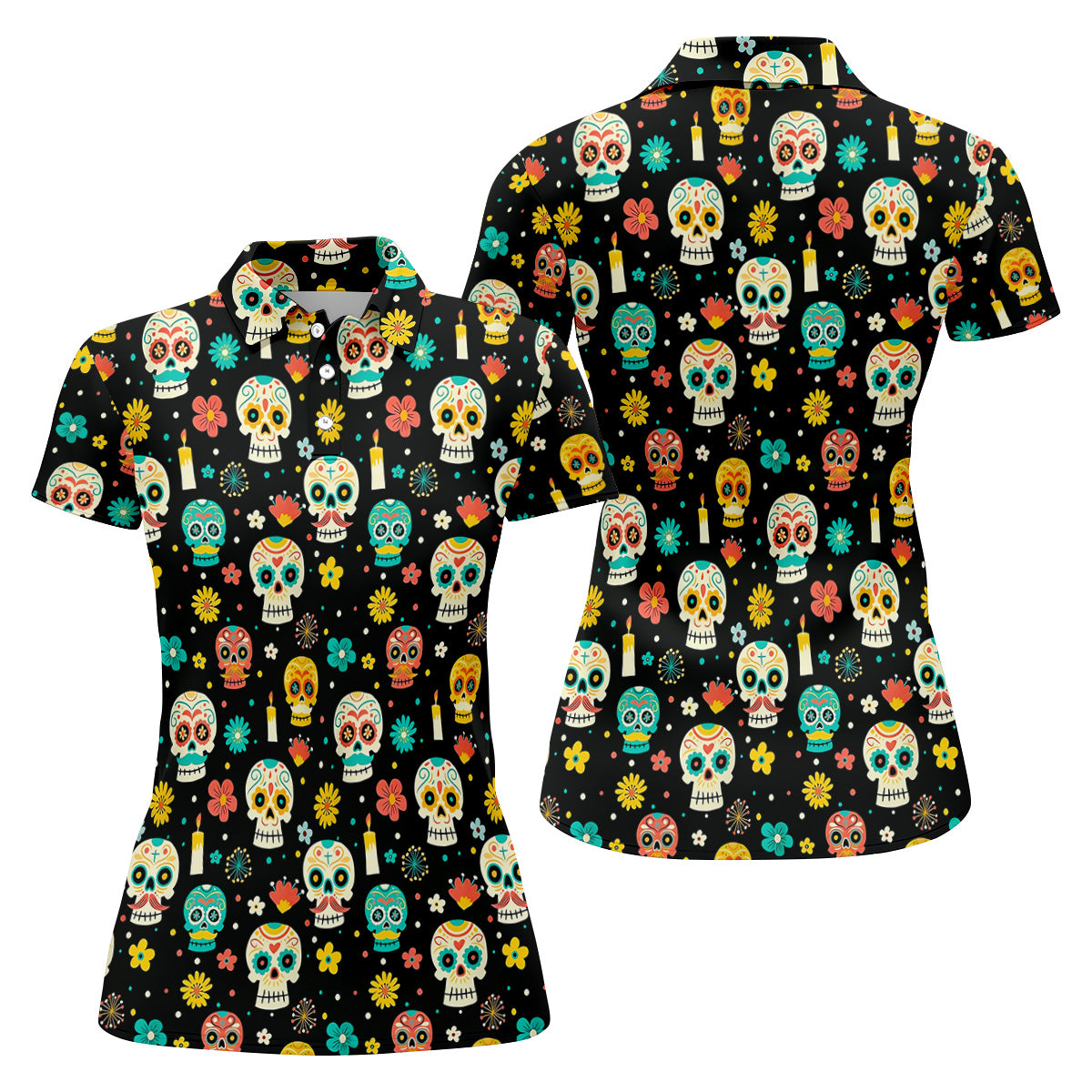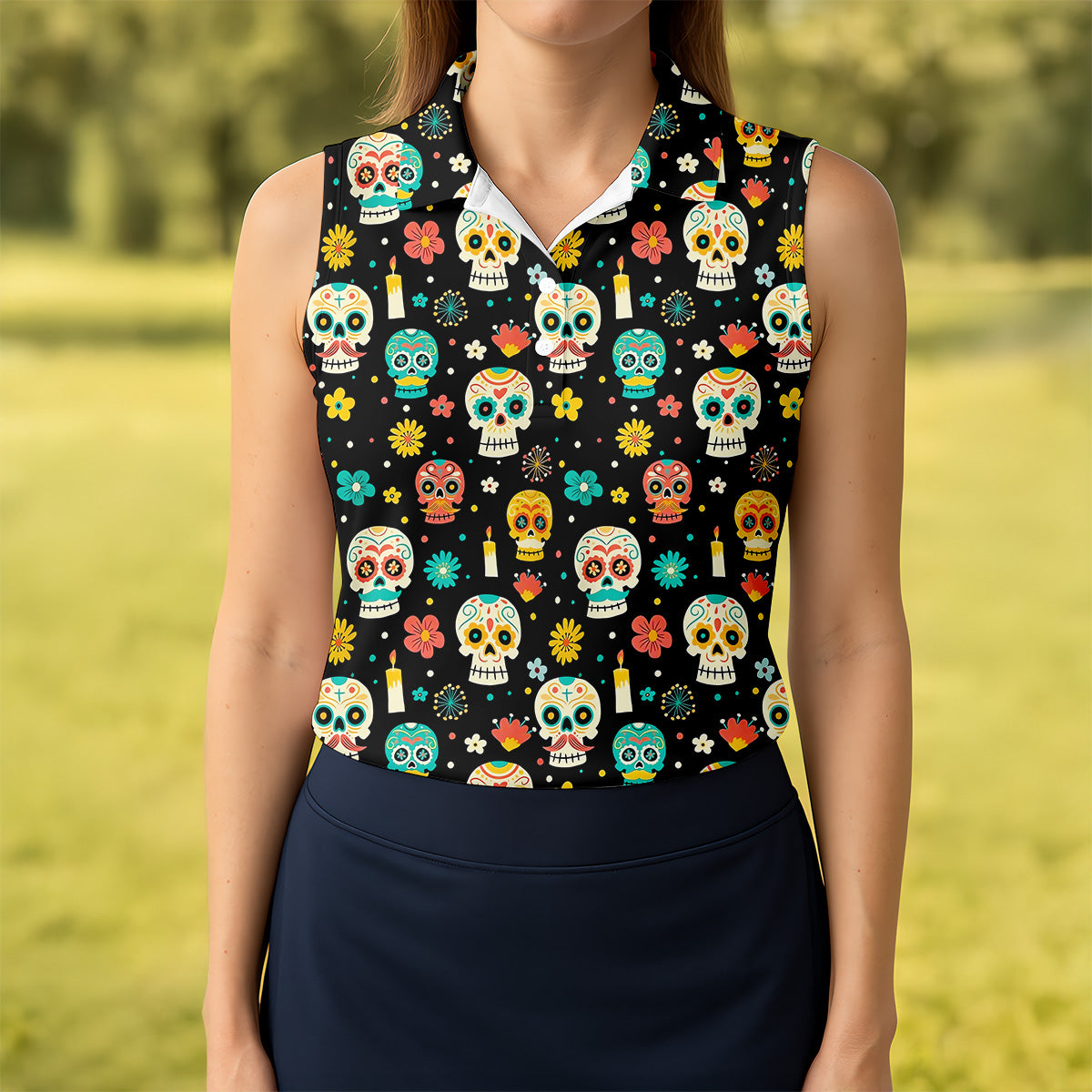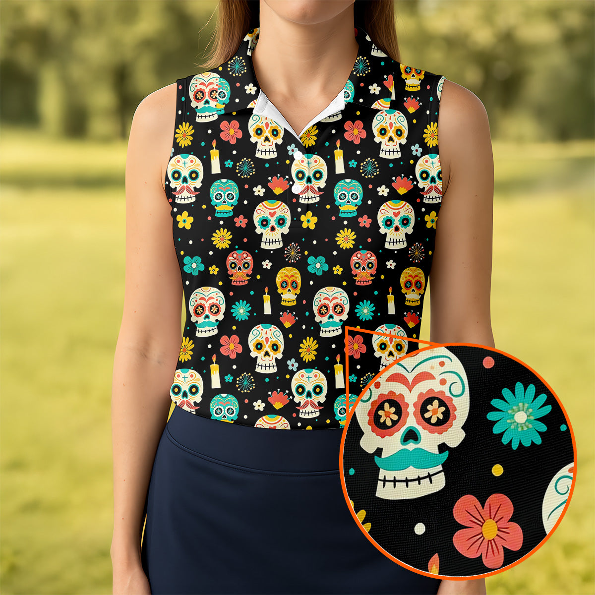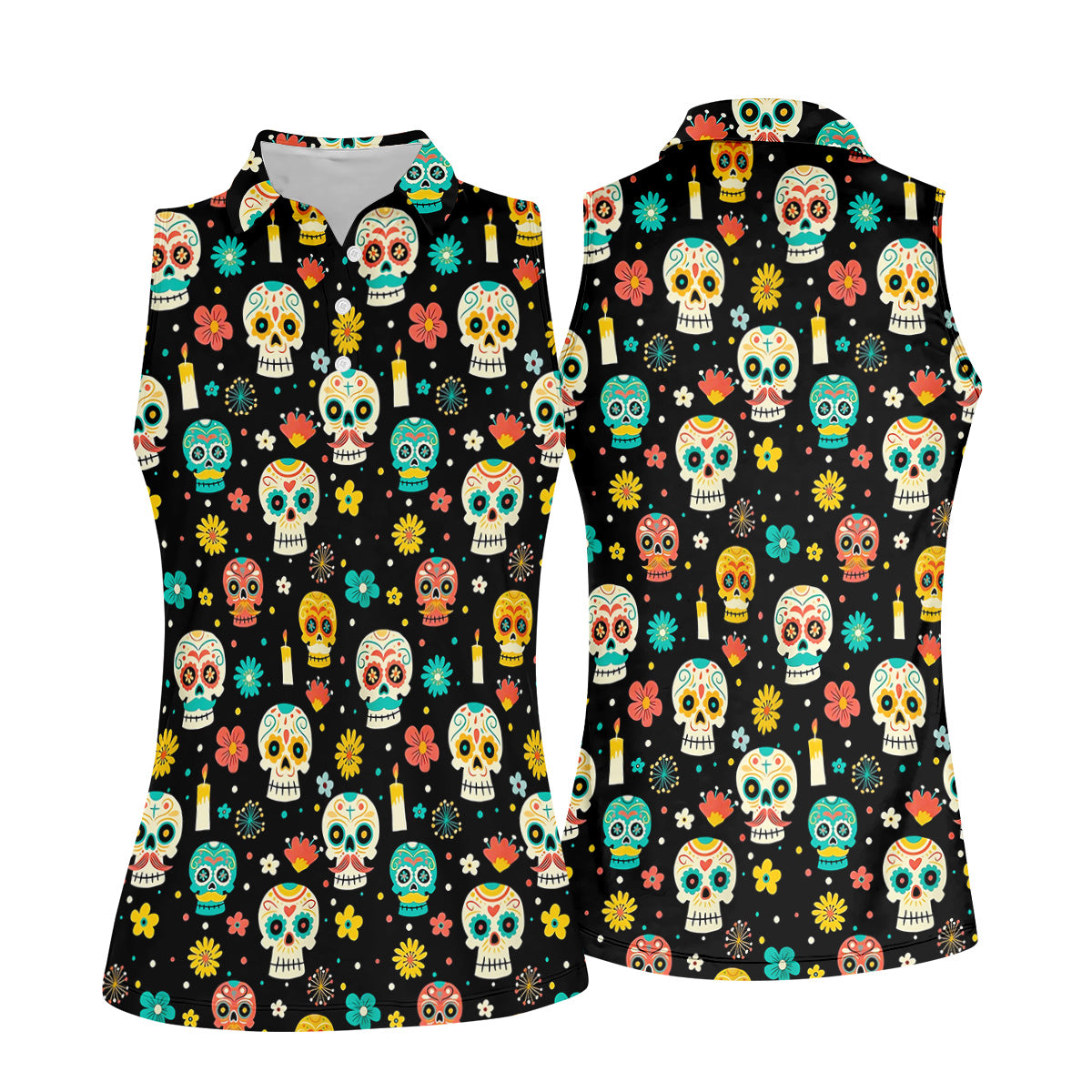 Cartoon Sugar Skull Mexican Day of the Dead Golf Shirt, Ladies Sleeveless Tops, Women's Golf Shirts