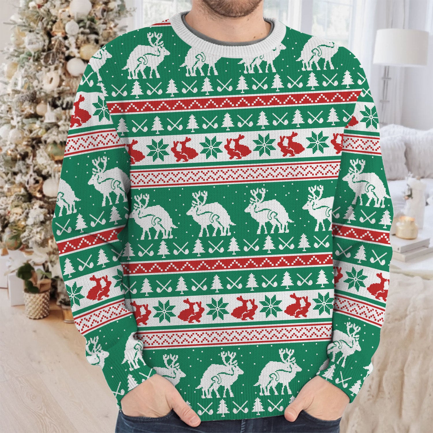 Forget boring fairway fashion — this sweater is what happens when Santa hooks one into the rough and decides to party instead. Perfect for ugly sweater contests, Christmas rounds, or that one office party where you swear you won’t talk about your handicap (but totally will).
