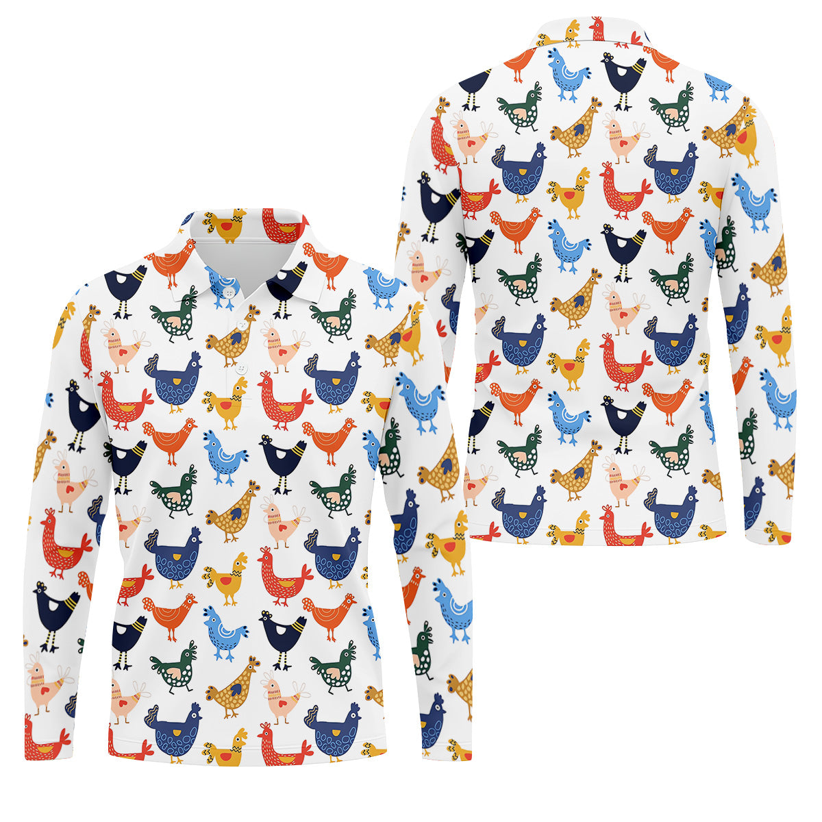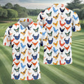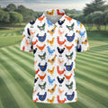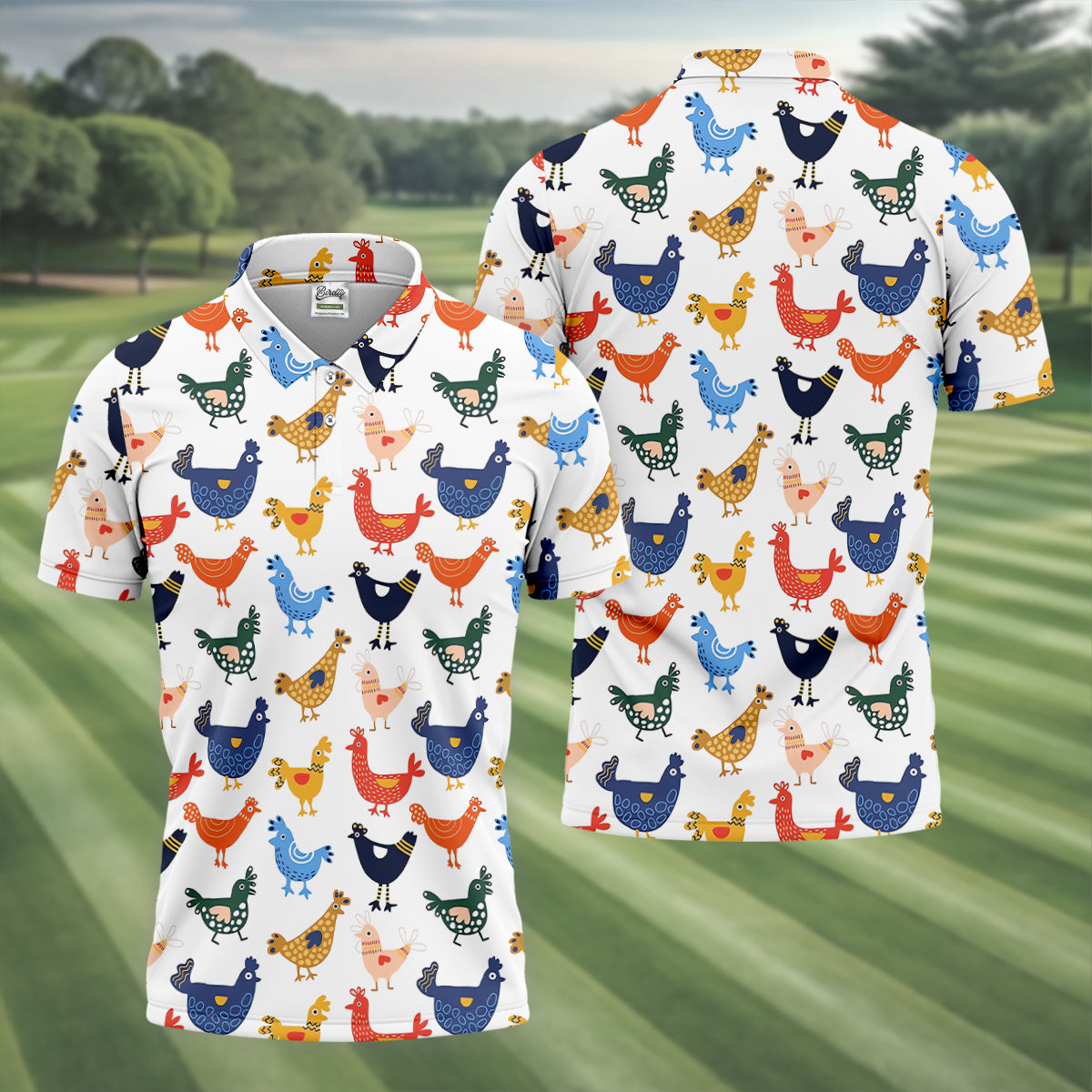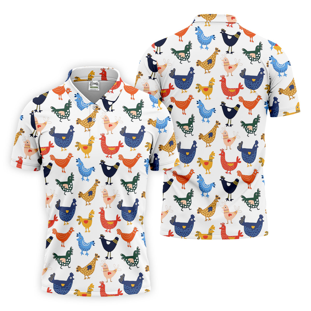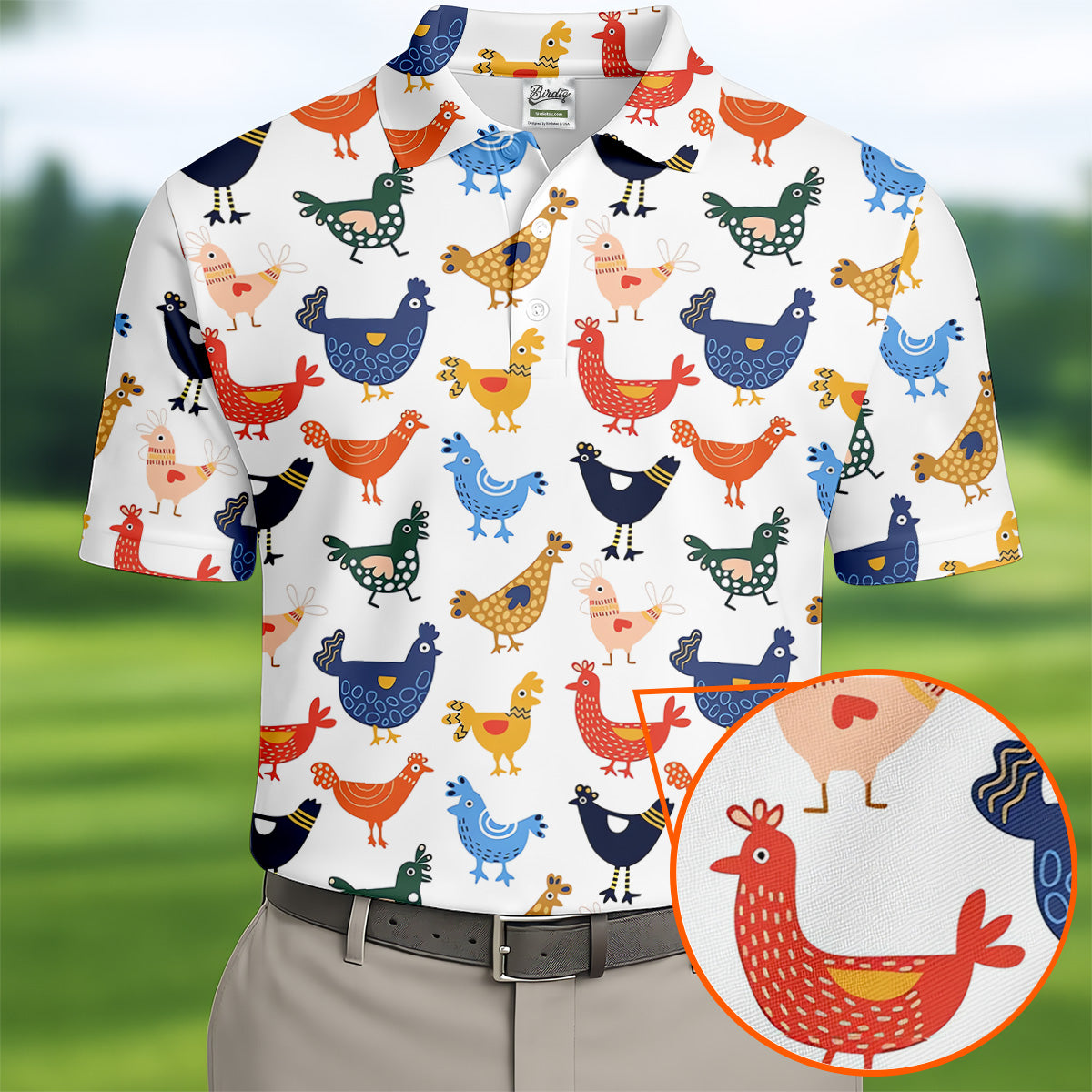 Colorful Animated Chickens White Polo Shirt Mens, Fun Golf Shirts For Men, Gift For Chicken Lover