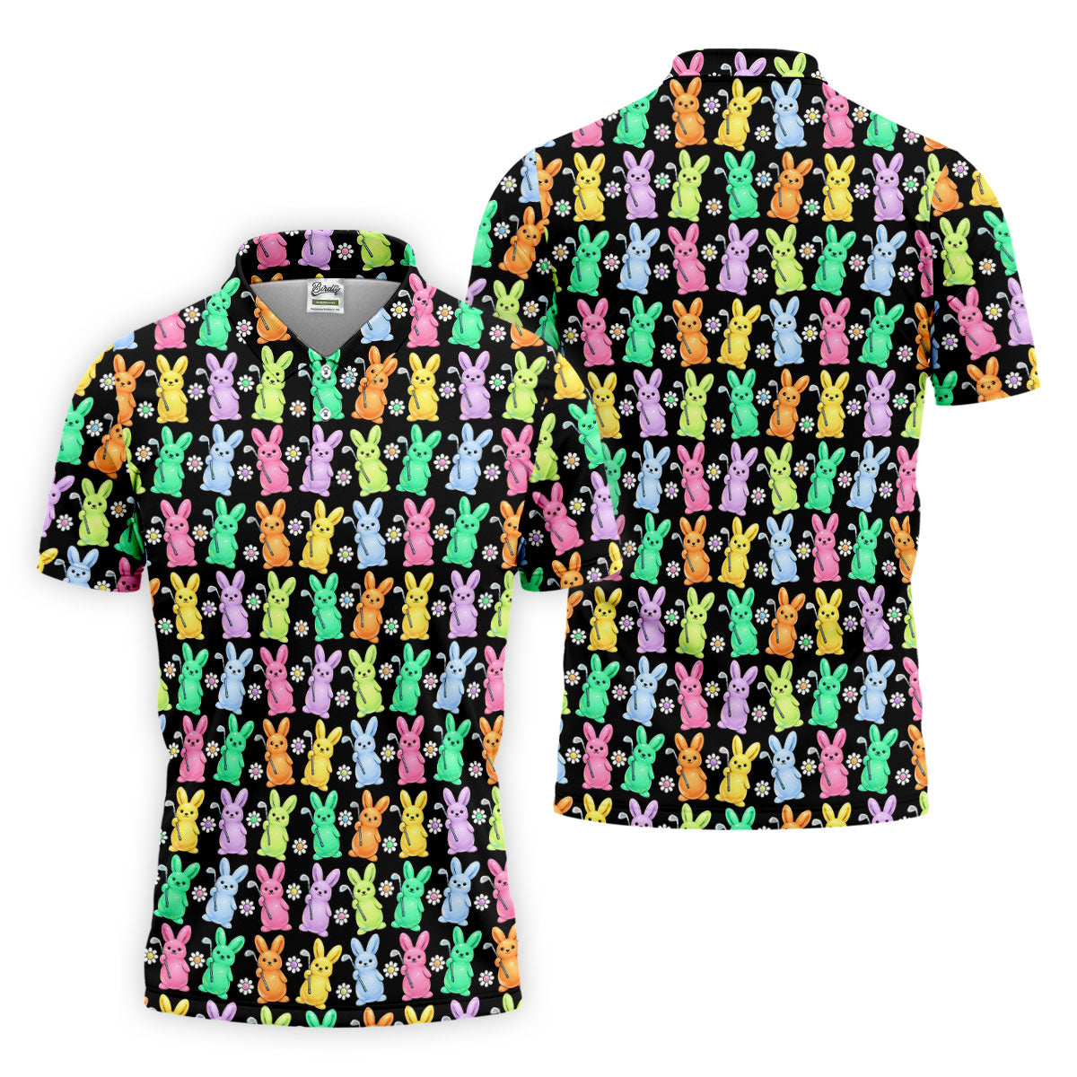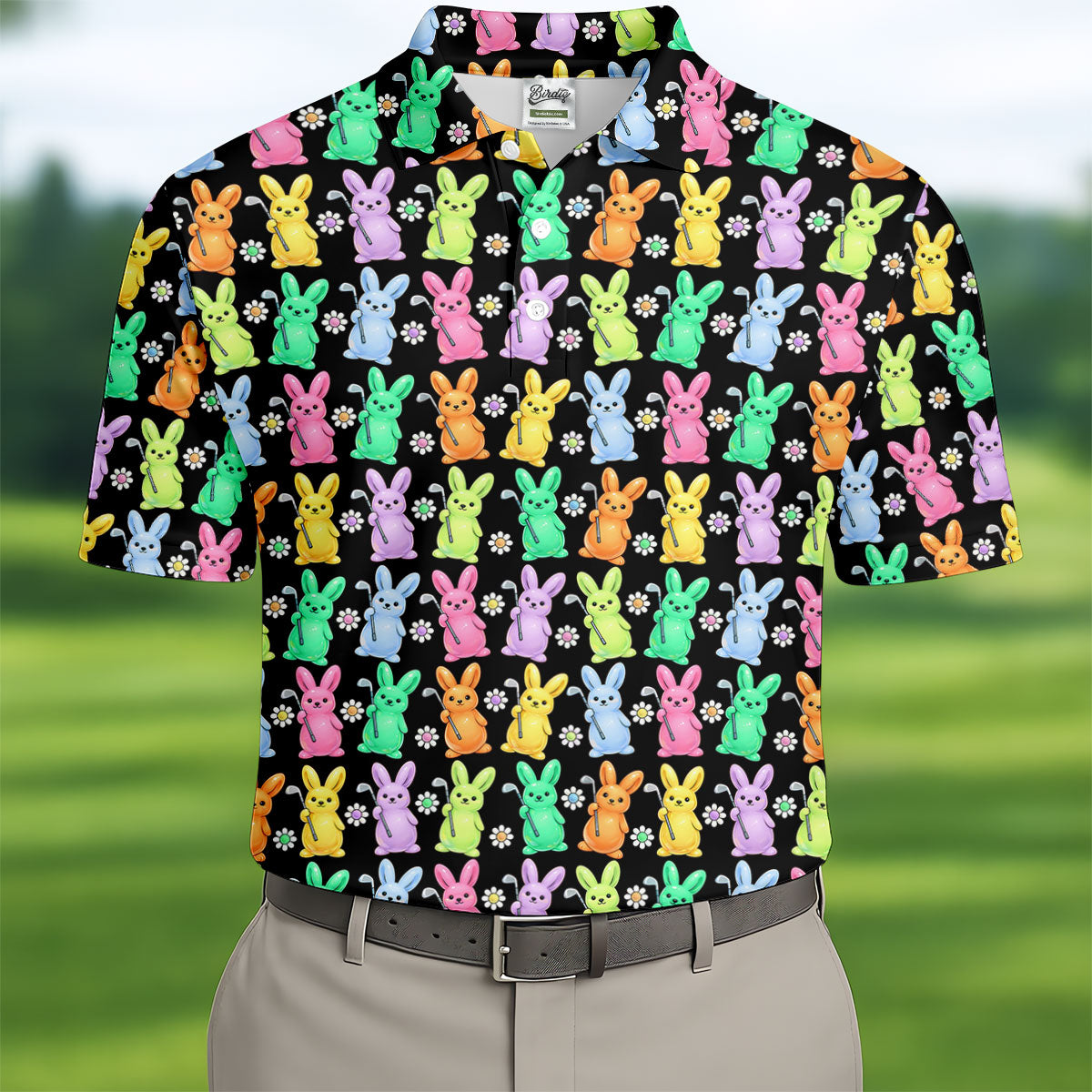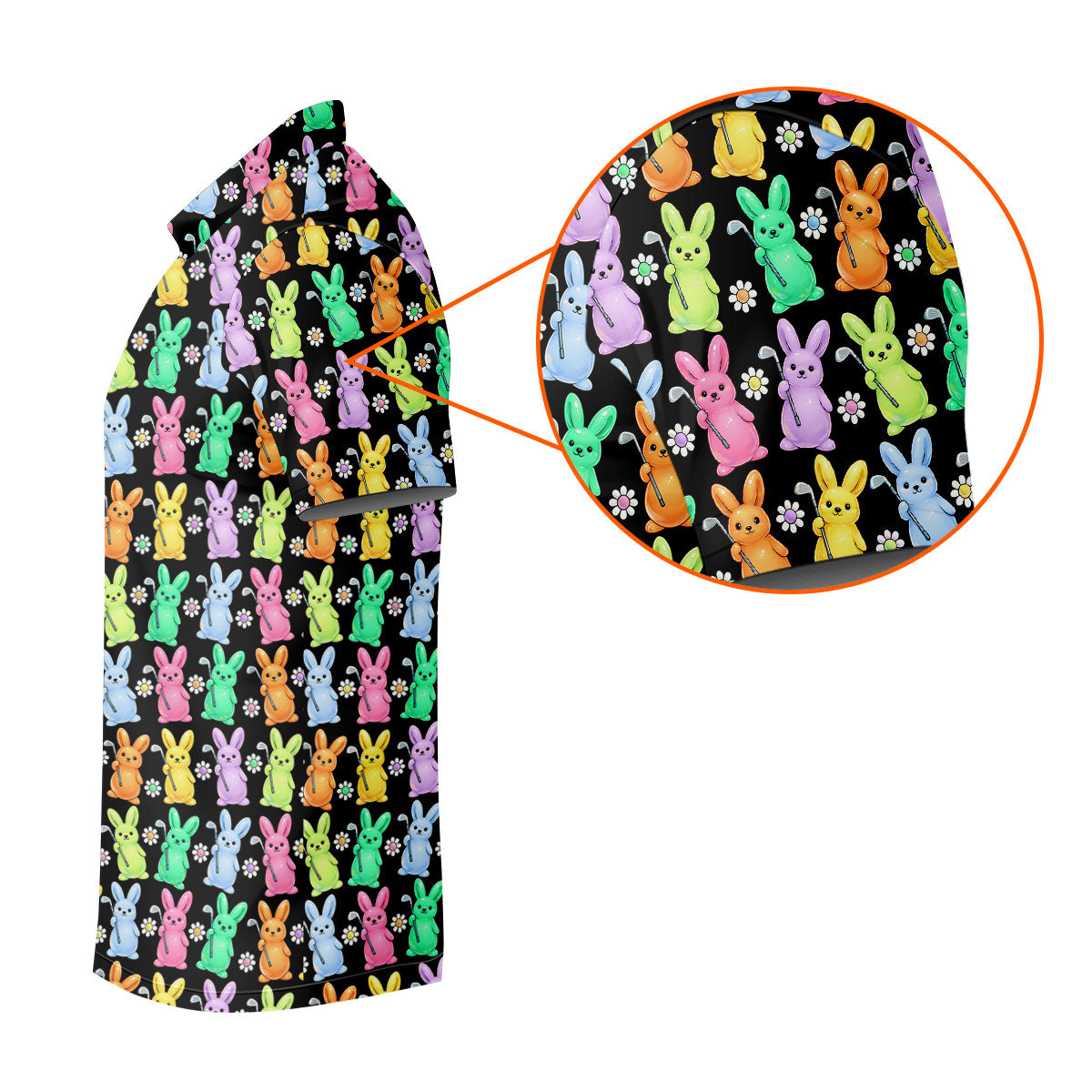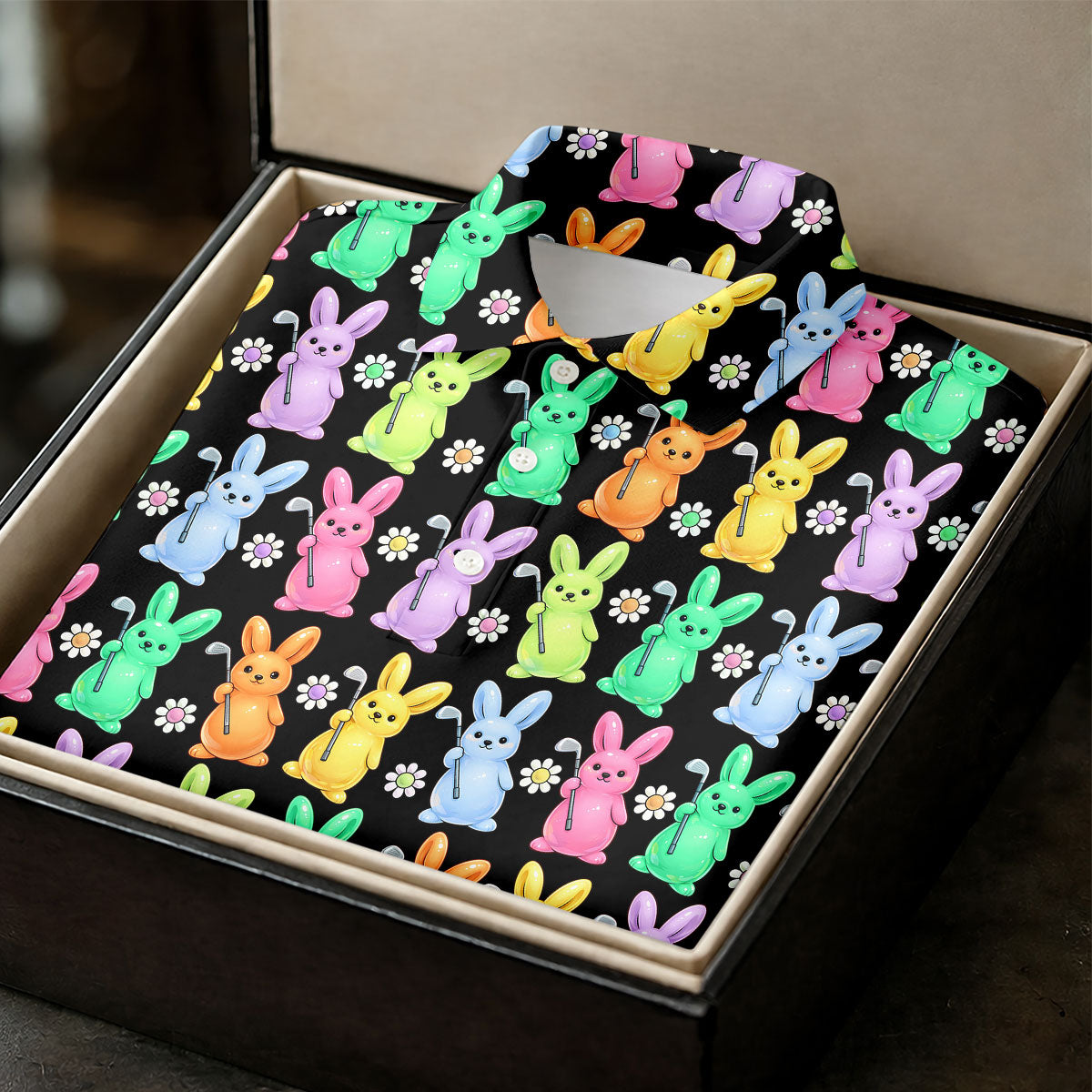 Colorful Easter Bunny Black Golf Shirt, Cute Golf Outfit, Golf Shirts For Men, Golf Gift For Men