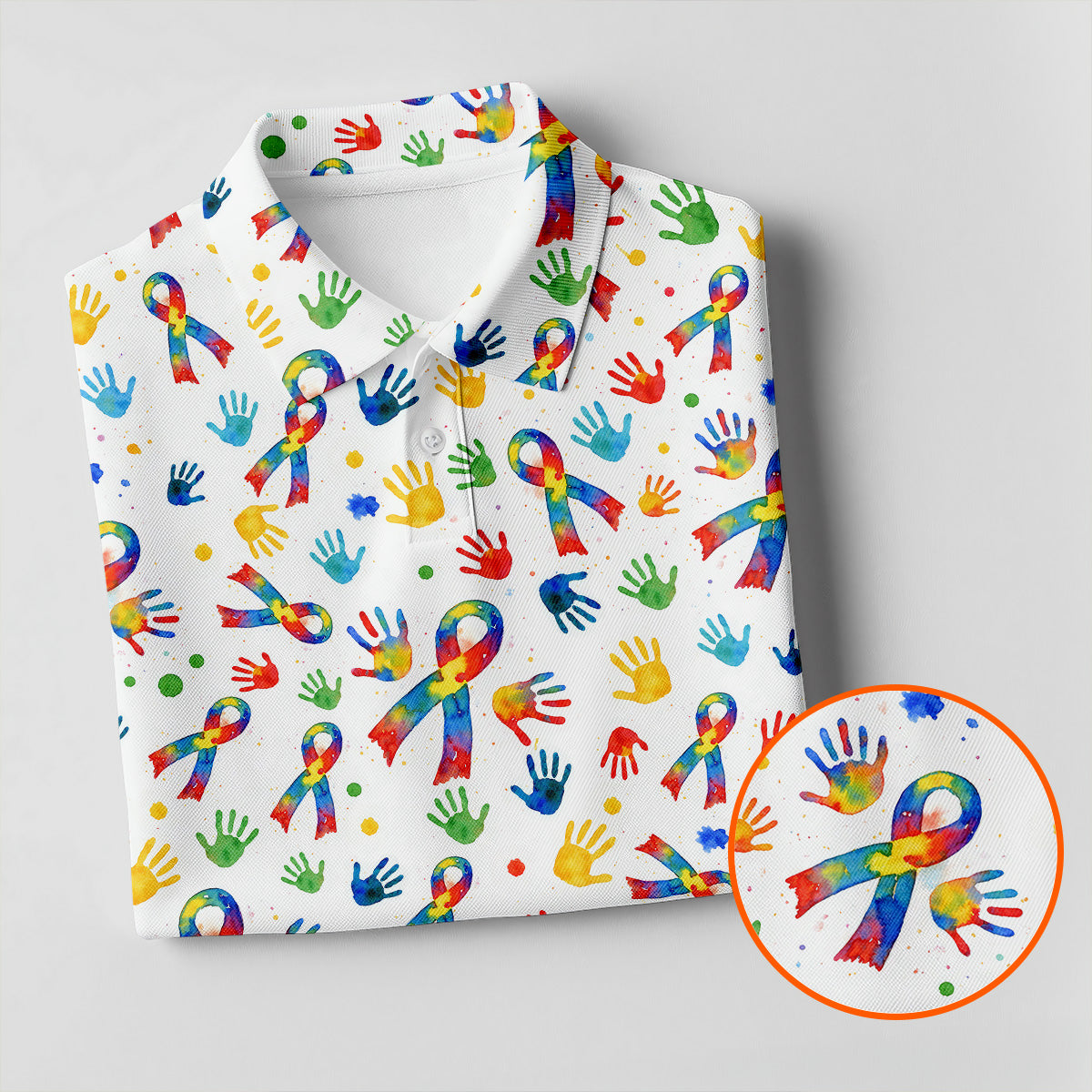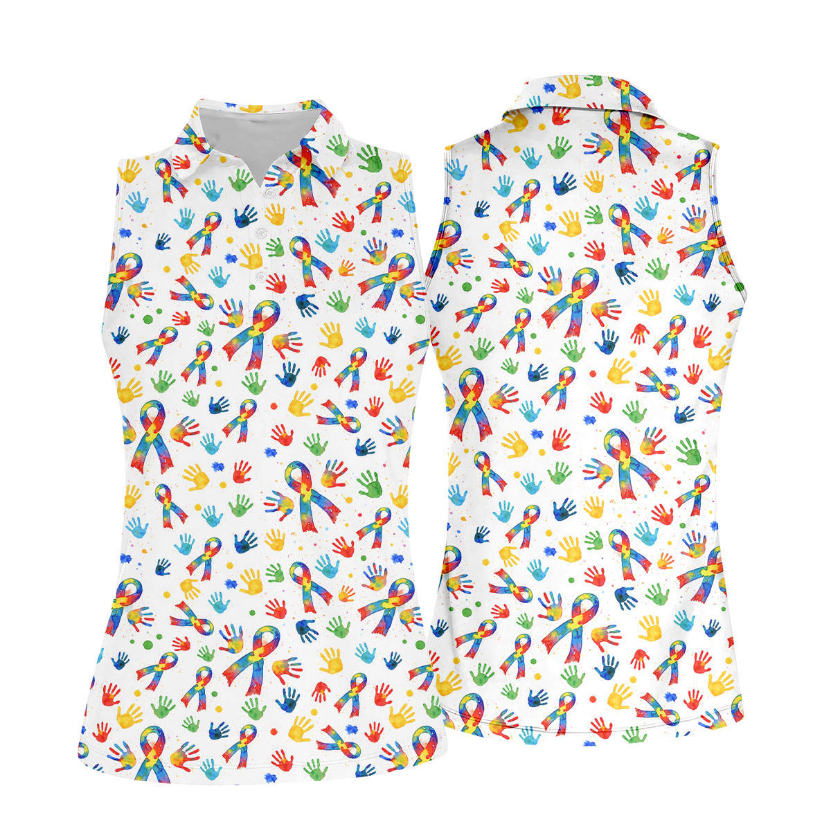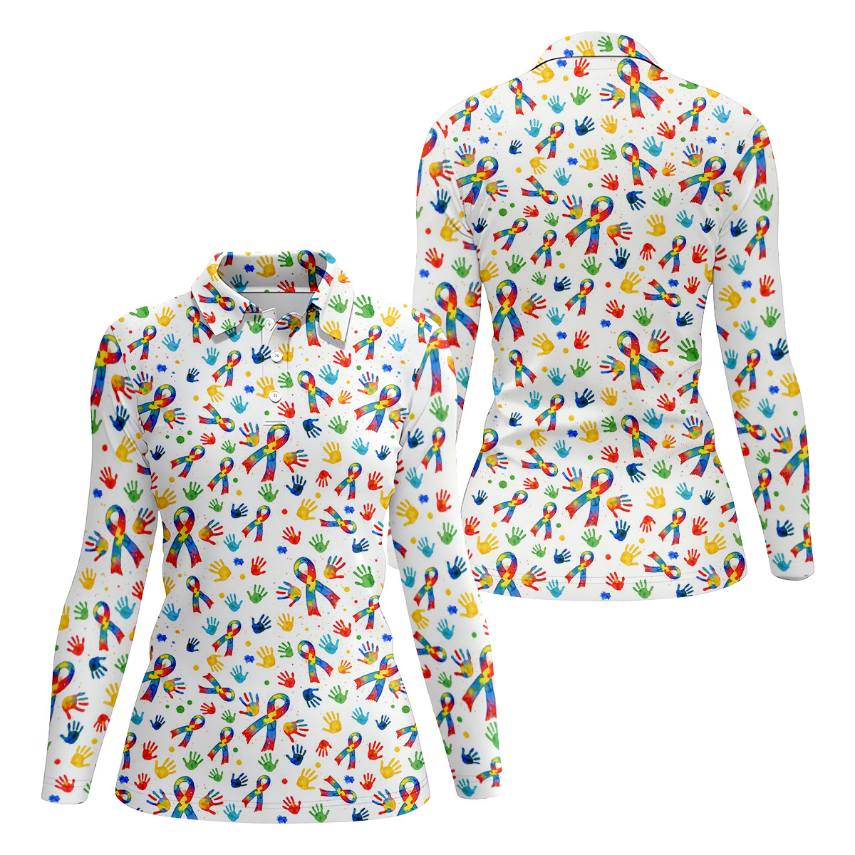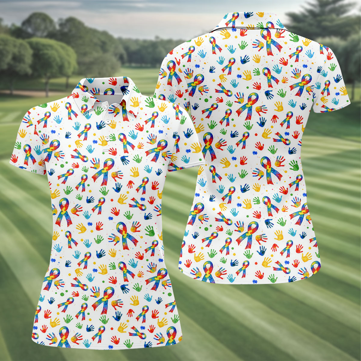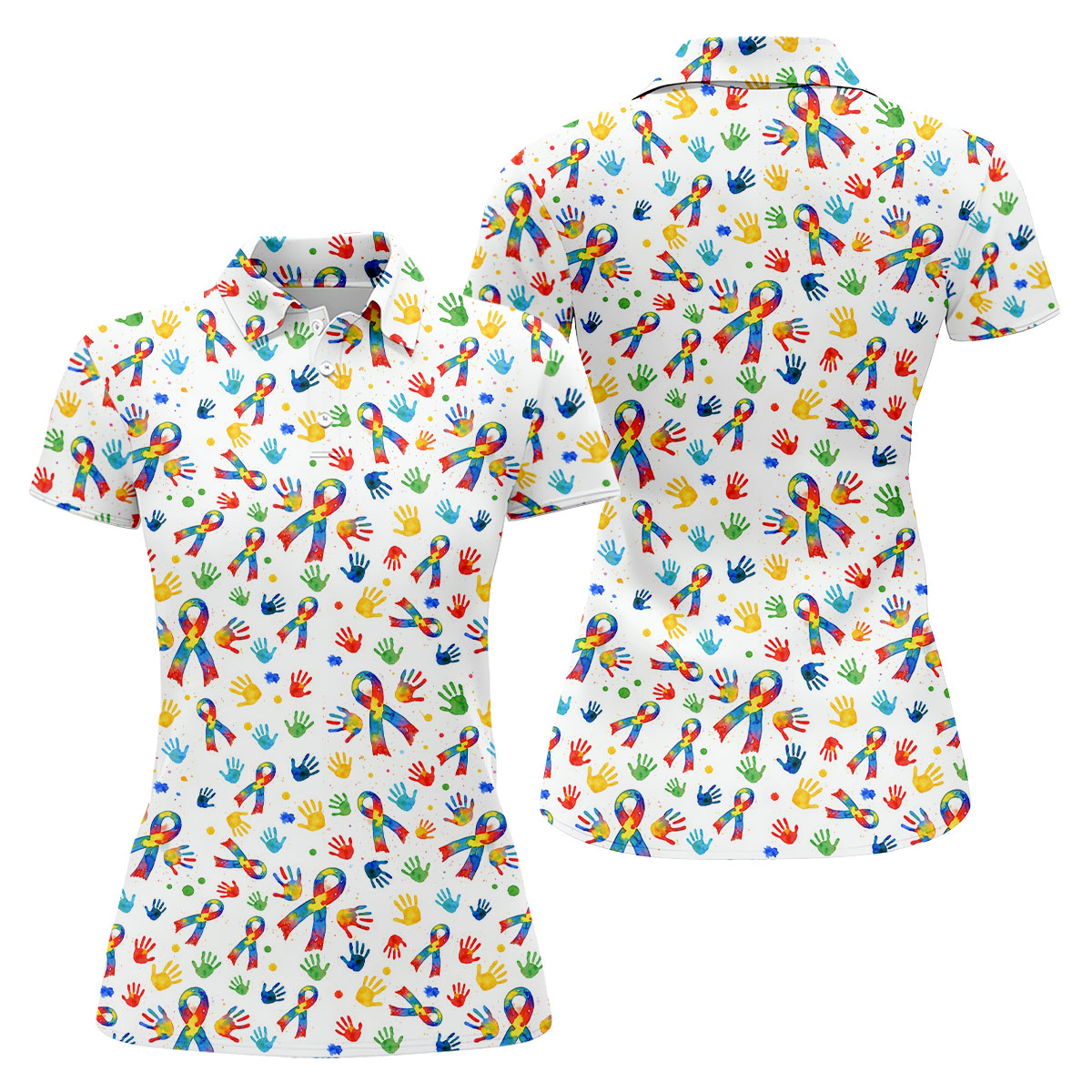 Colorful Handprints Autism Ribbon Women's Golf Tops, Autism Awareness Color Ladies Golf Polos