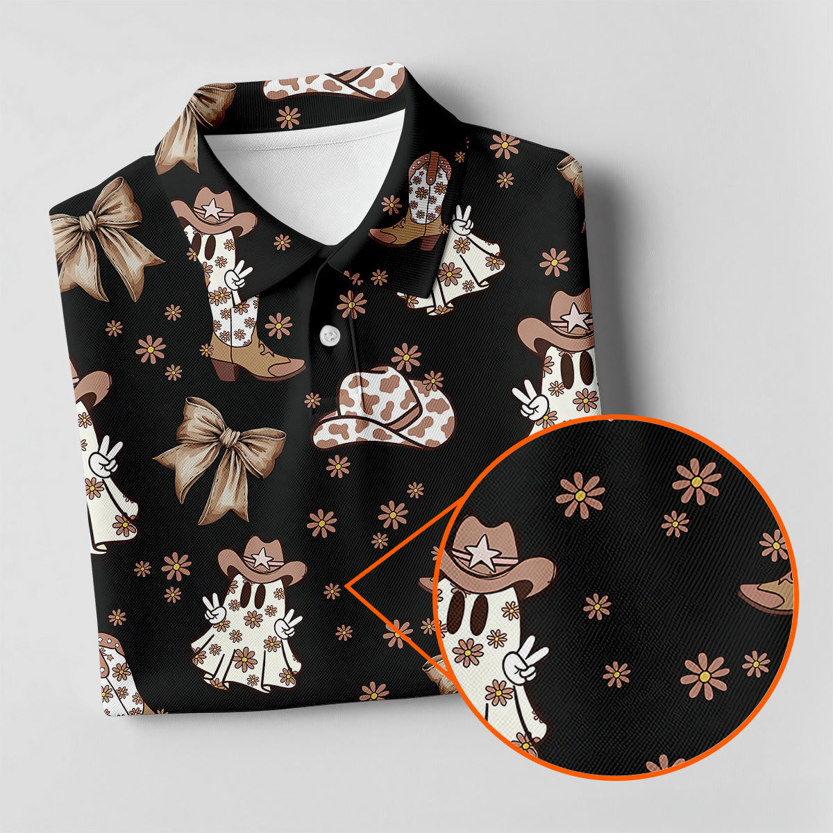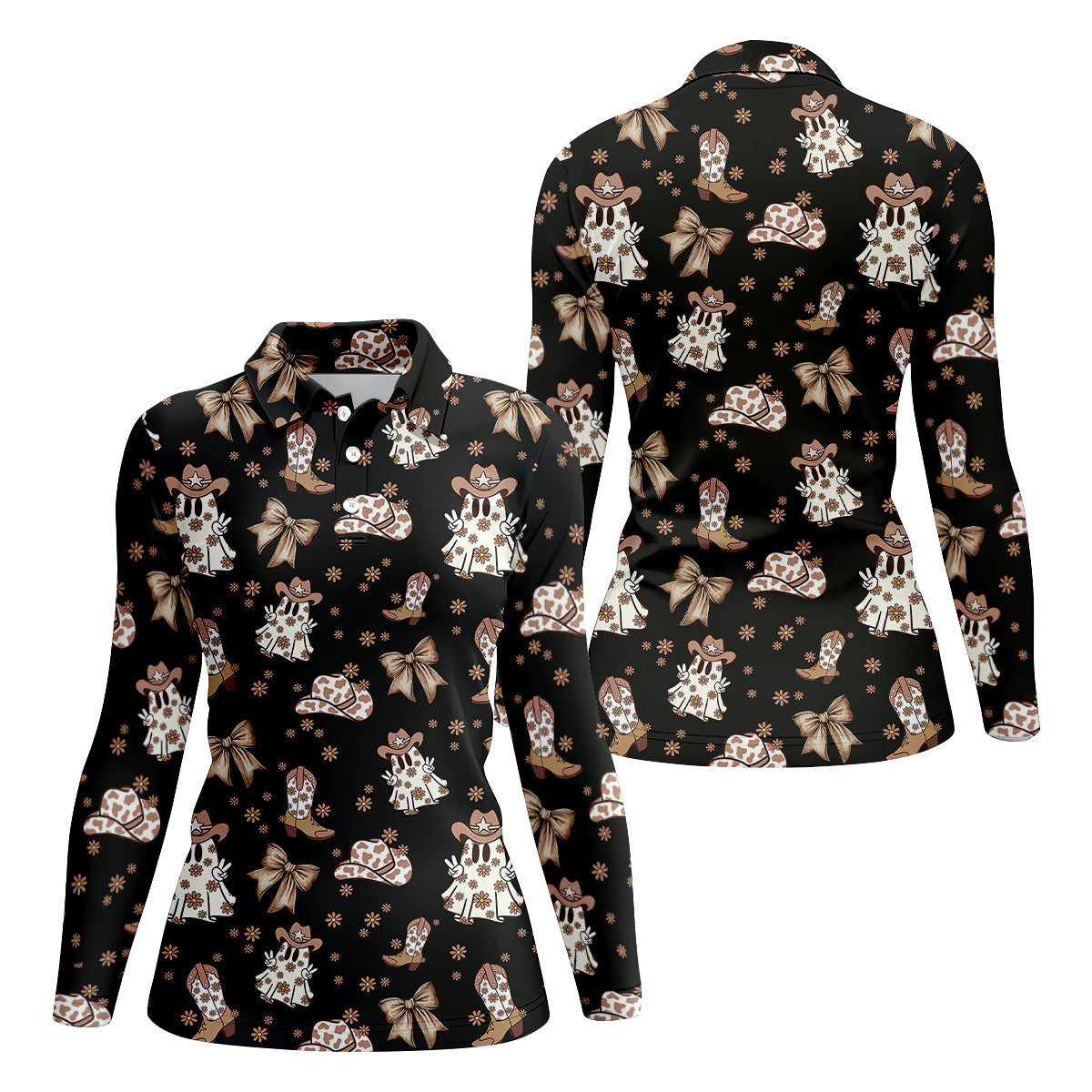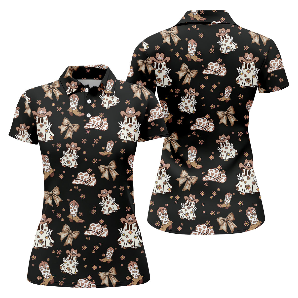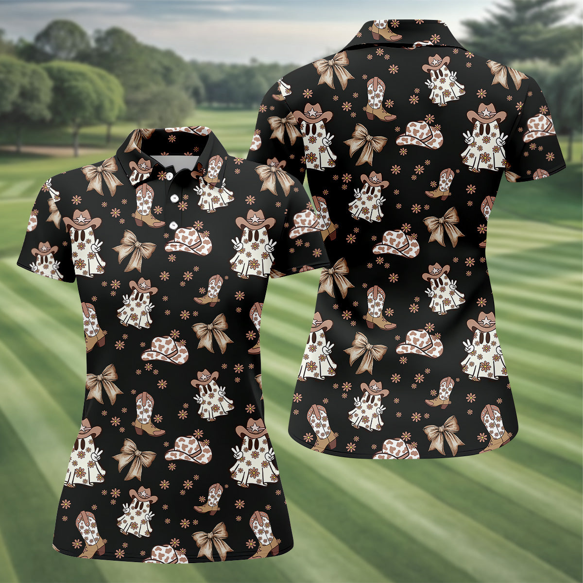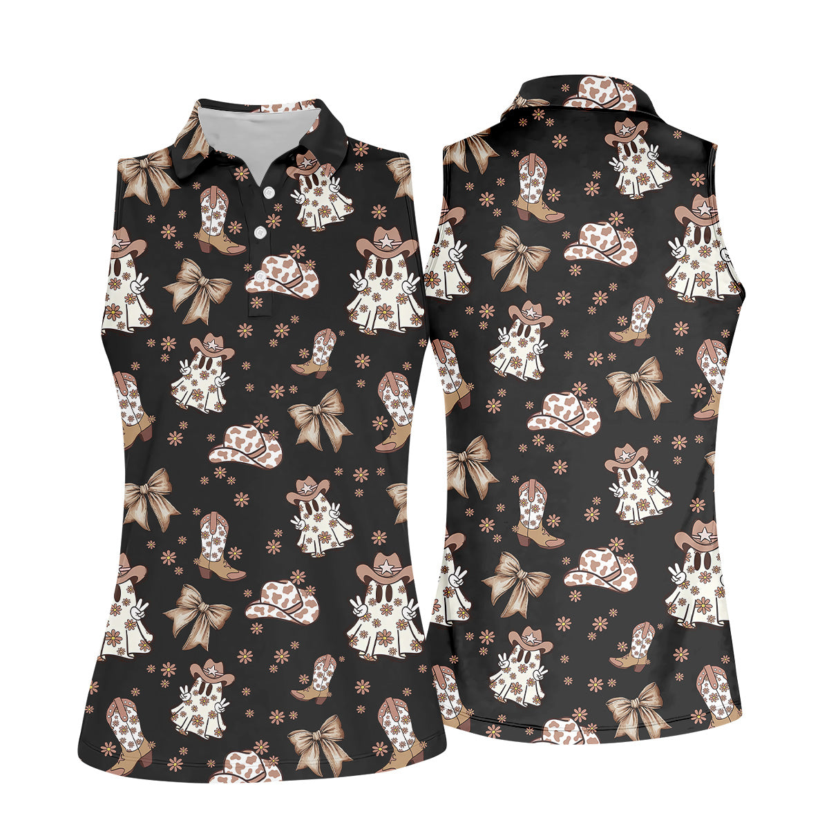Coquette Halloween Cowboy Ghost Black Fun Womens Golf Shirts, Ladies Sleeveless Polo, Ladies Golf Shirts