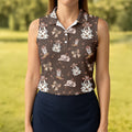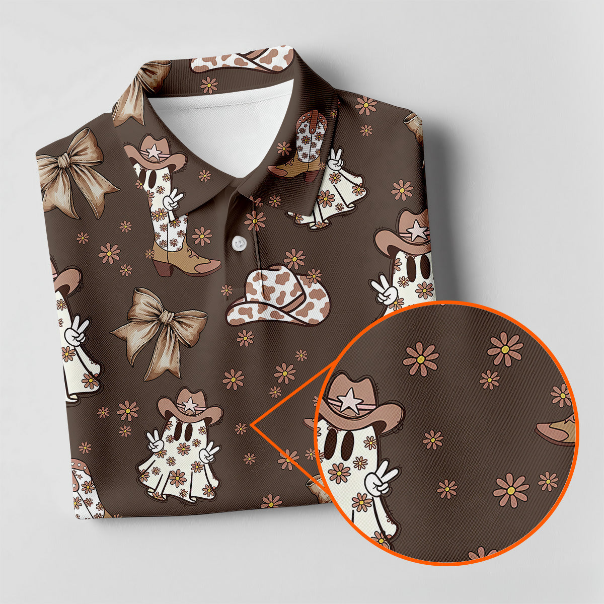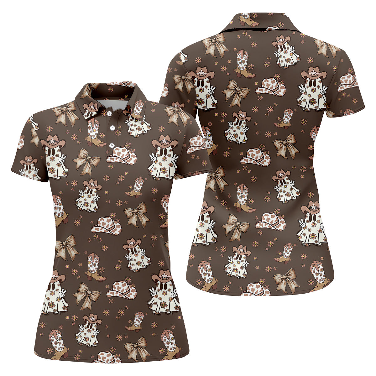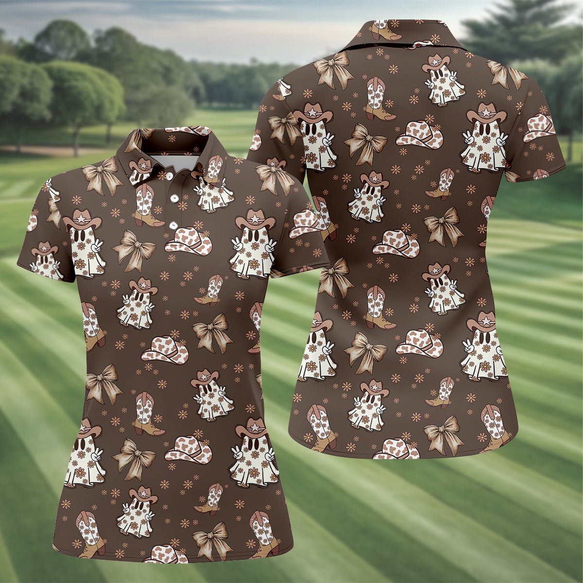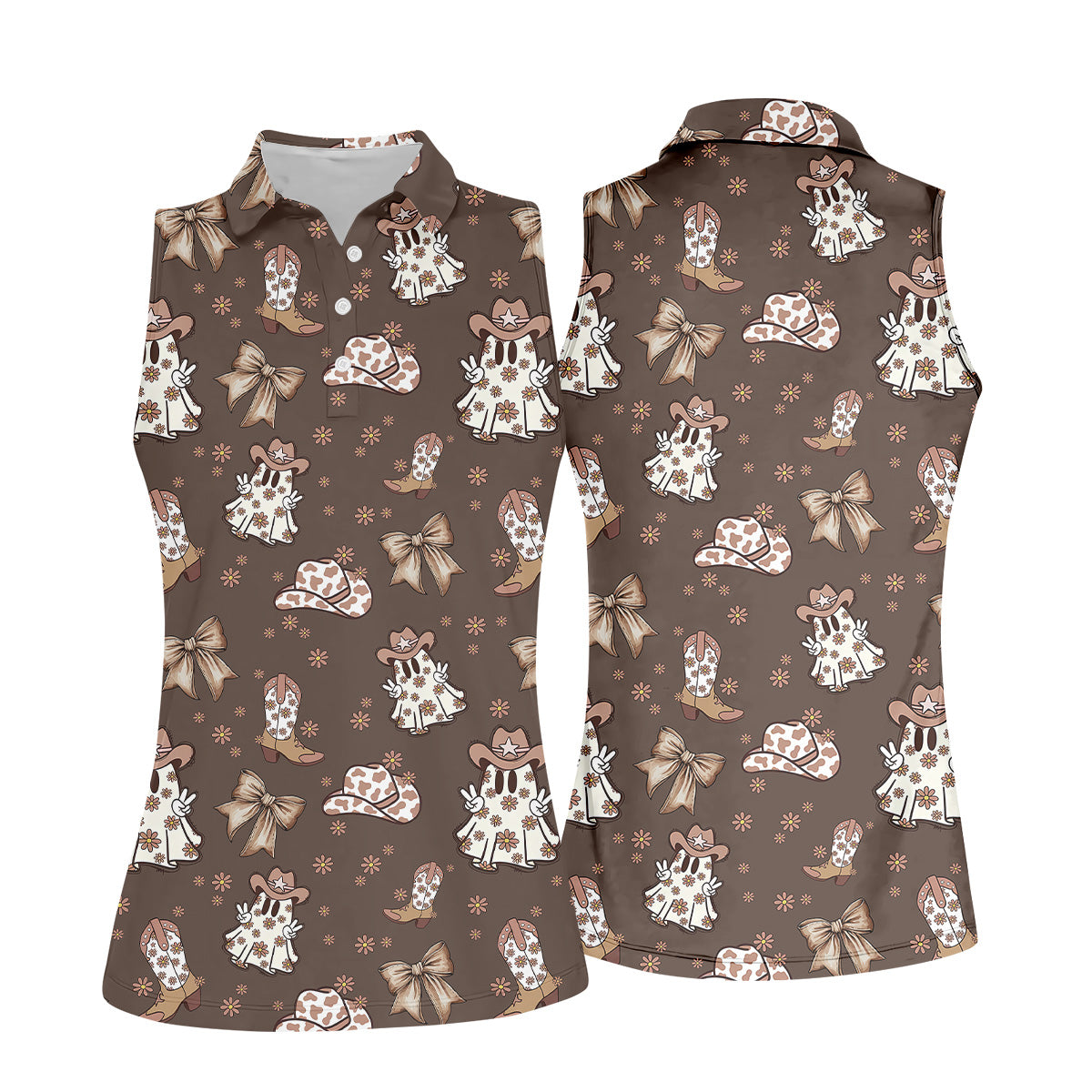 Coquette Halloween Cowboy Ghost Brown Fun Womens Golf Shirts, Ladies Sleeveless Polo, Ladies Golf Shirts
