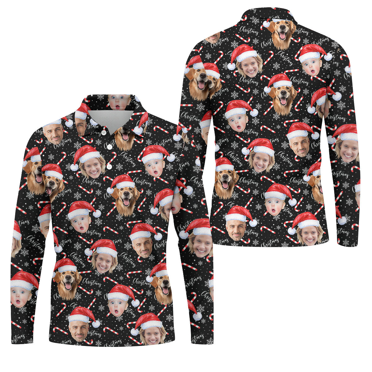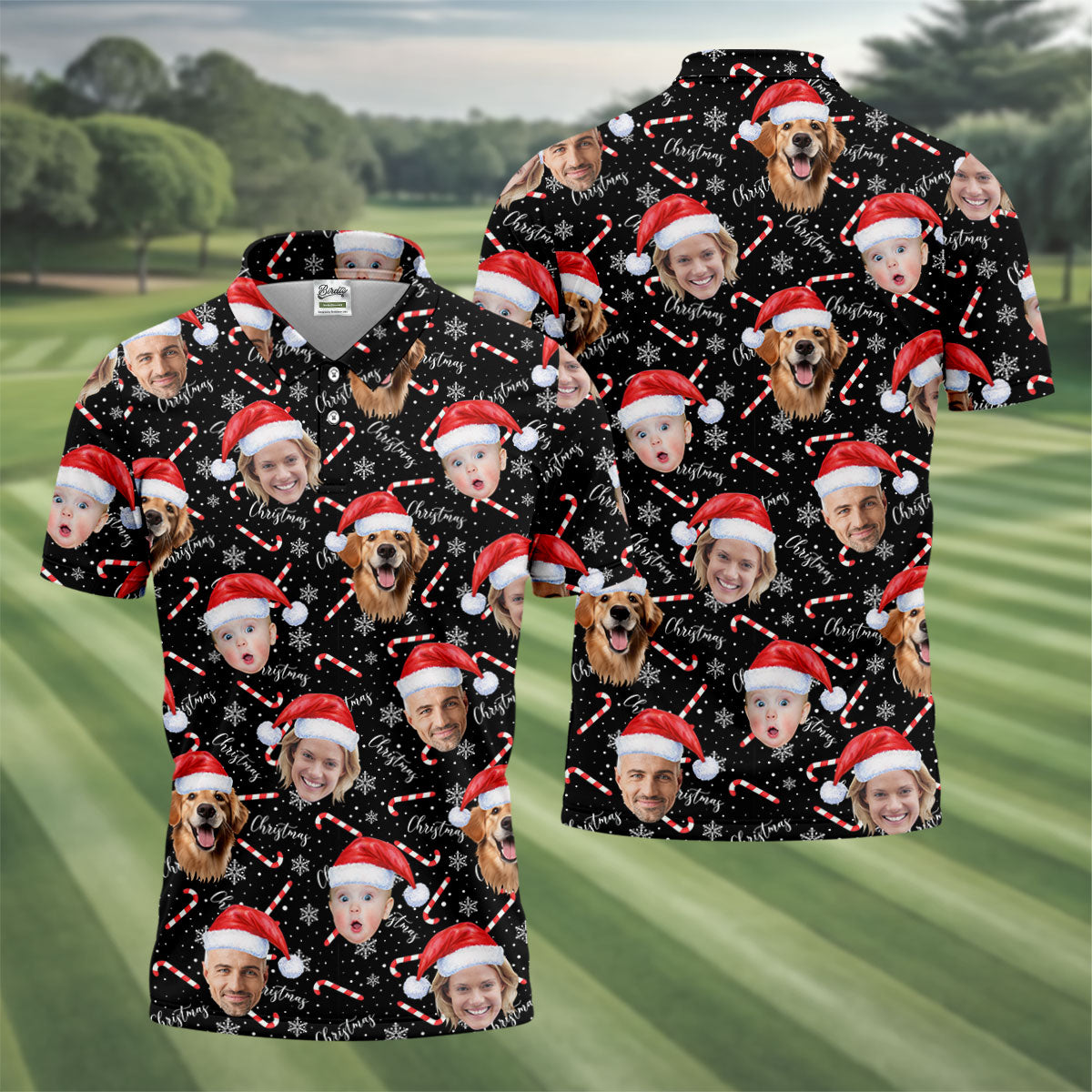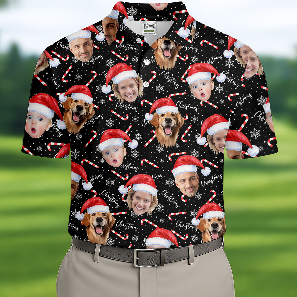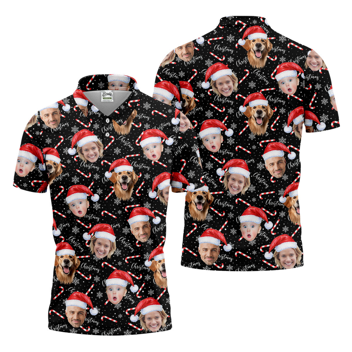 Custom Face Candy Cane Christmas Black Golf Shirt, Christmas Golf Shirt, Golf Gift For Men, Golf Shirts For Men