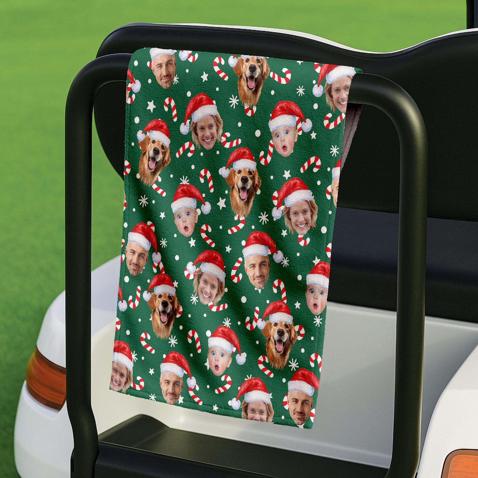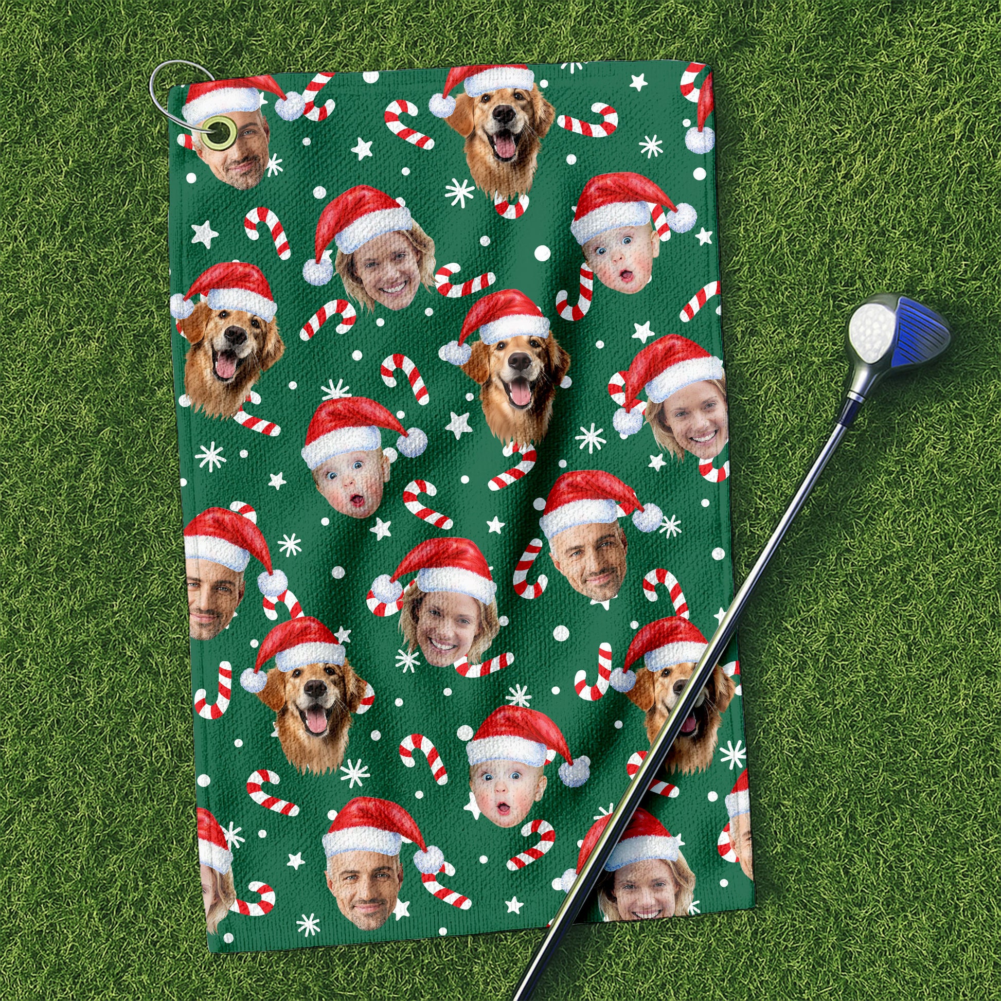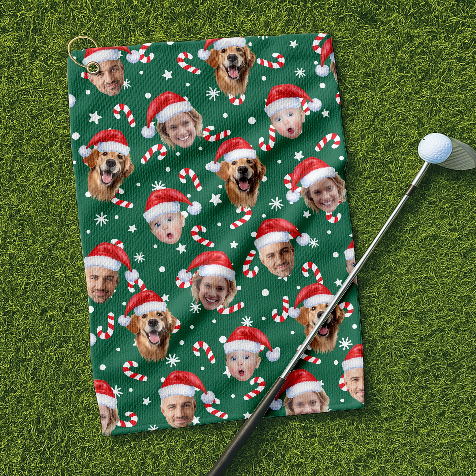 Custom Face Candy Cane Pattern Green Golf Towel, Christmas Golf Gift, Christmas Golf Gift
