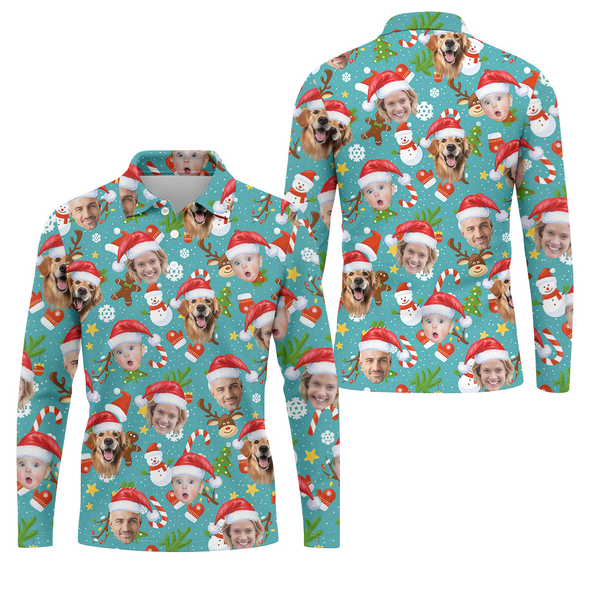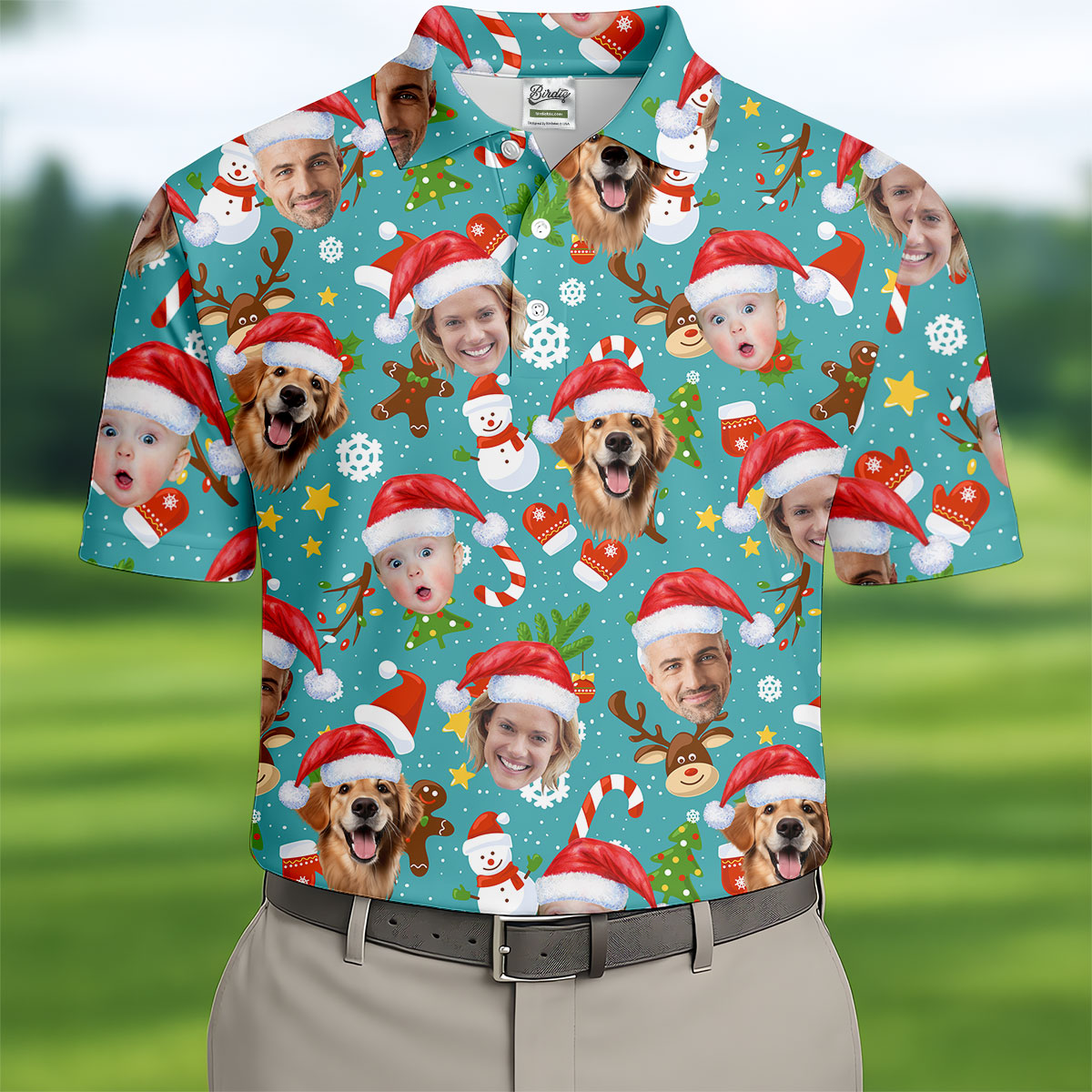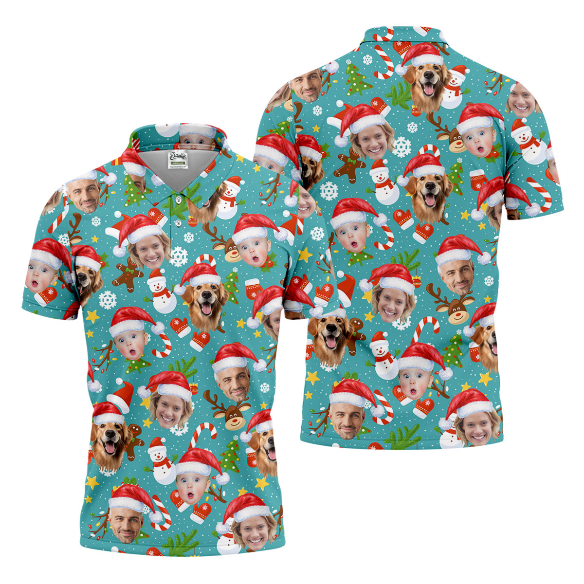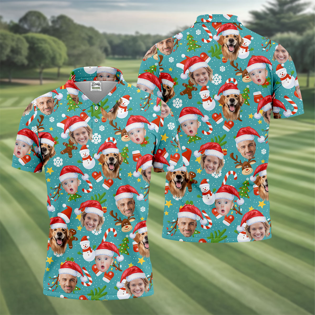 Custom Face Cute Christmas Pattern Teal Golf Shirt, Christmas Golf Shirt, Golf Gift For Men, Golf Shirts For Men