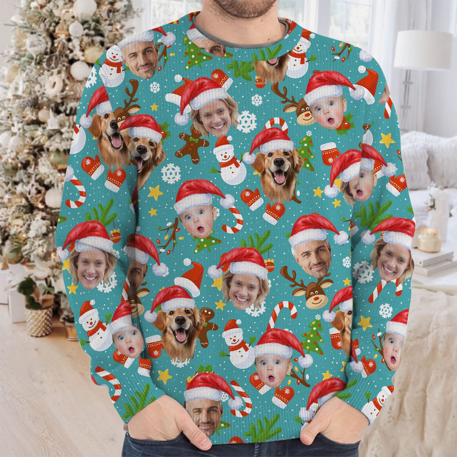 Custom Face Cute Christmas Pattern Teal Golf Ugly Sweater, Christmas Golf Shirt, Golf Sweater, Christmas Golf Gift