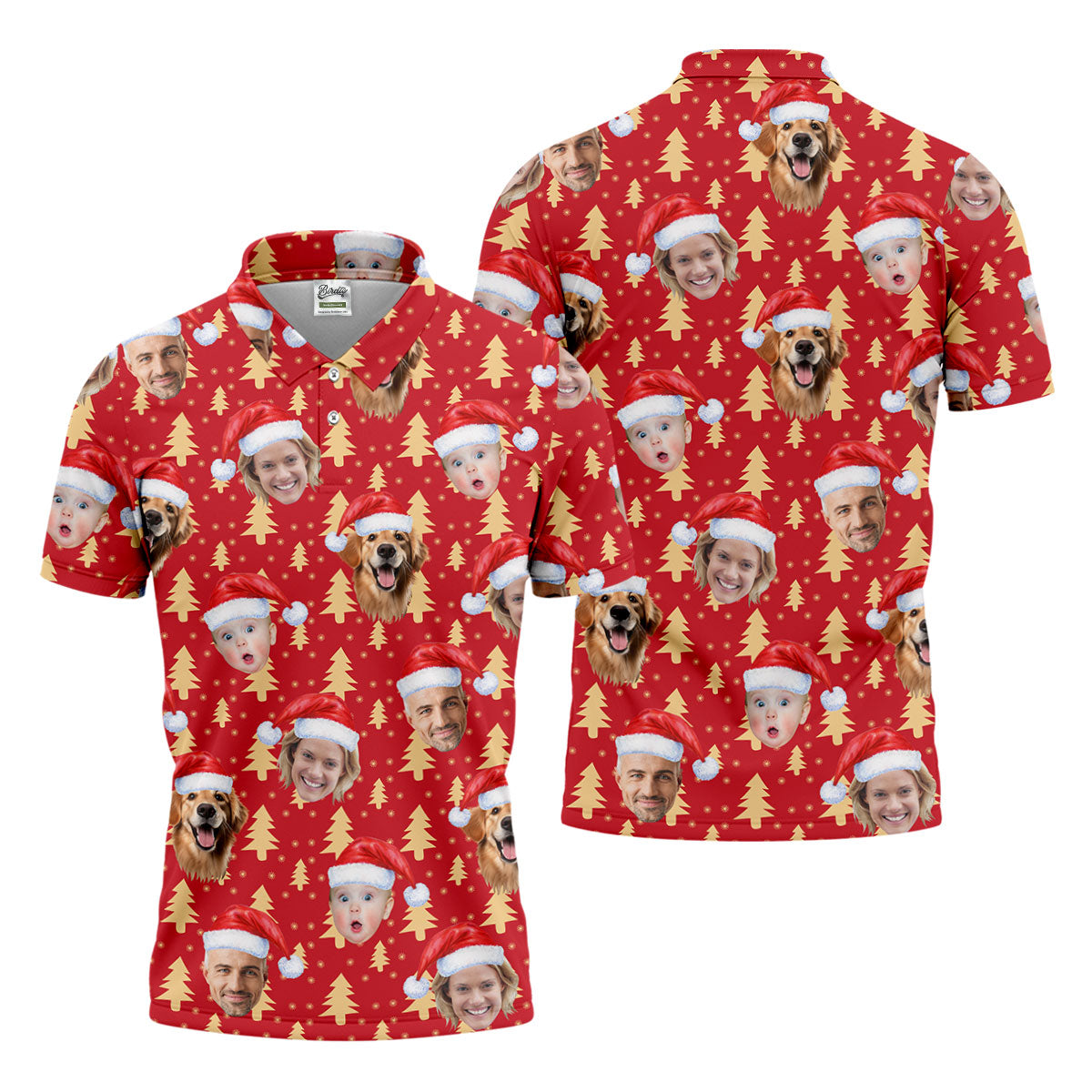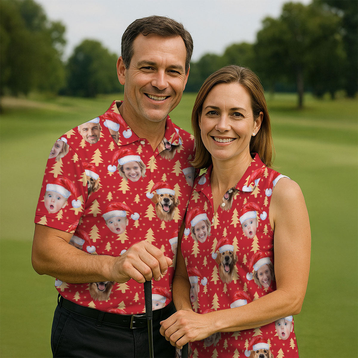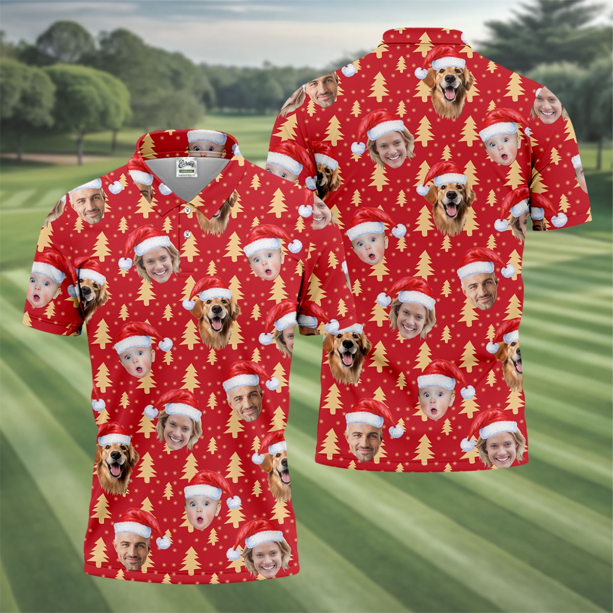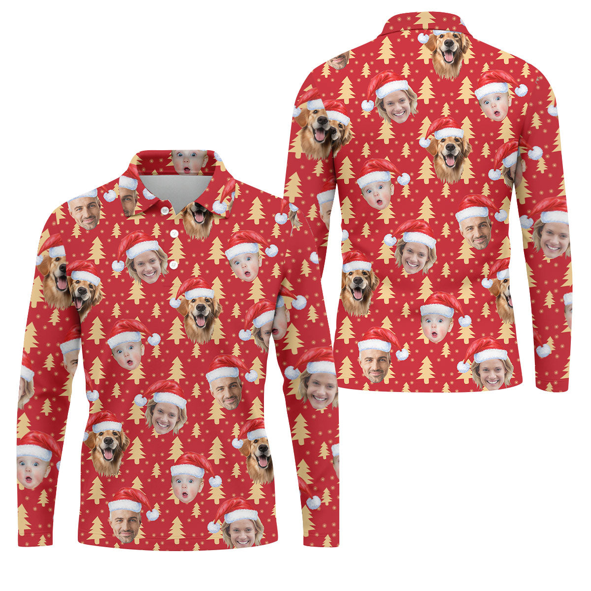 Custom Face Golden Pine Tree Red Golf Shirt, Christmas Golf Shirt, Golf Shirts For Men, Golf Gift For Men