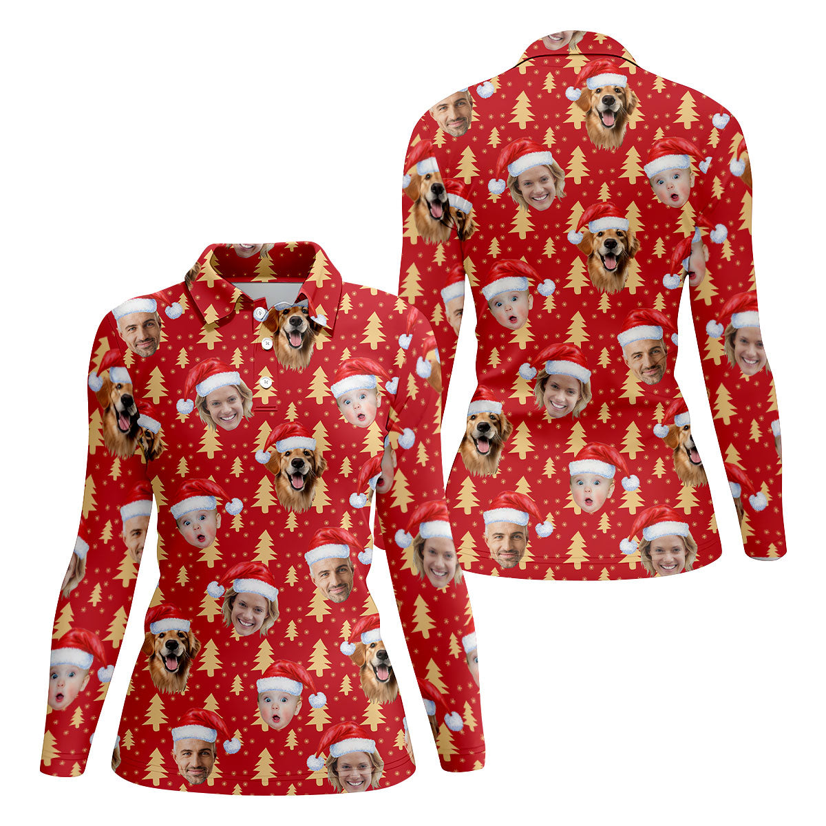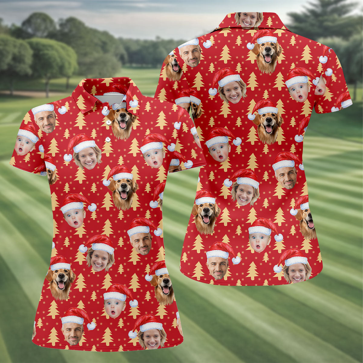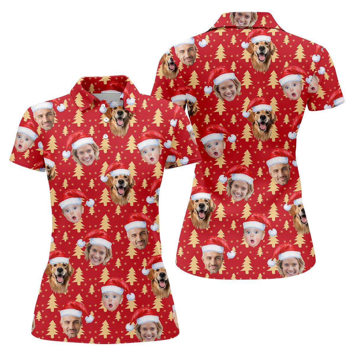 Custom Face Golden Pine Tree Red Golf Shirt, Christmas Golf Shirt, Ladies Golf Shirts, Golf Gifts For Women