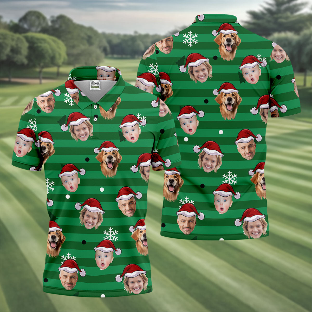 Custom Face Green Stripe Christmas Golf Shirt, Golf Tops For Men, Polo Shirts For Men, Christmas Golf Gift