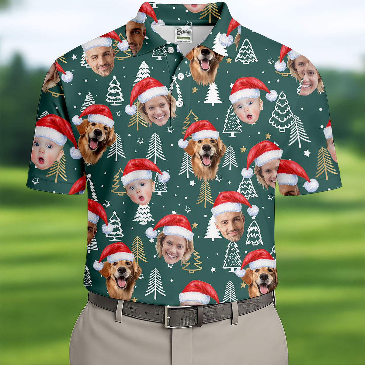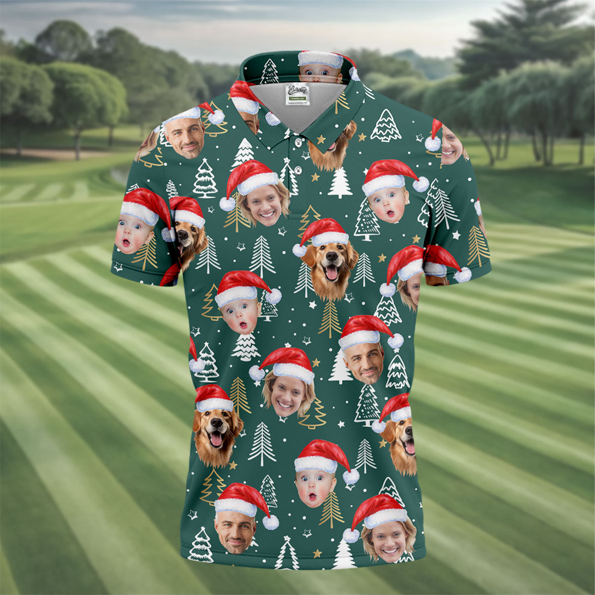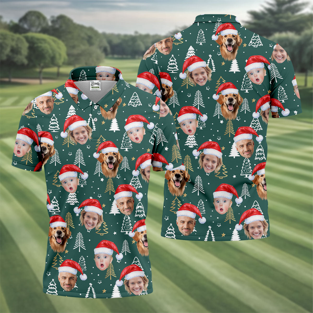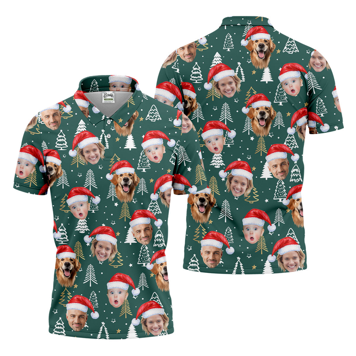 Custom Face Pine Tree Pattern Dark Green Christmas Golf Shirt, Golf Shirts For Men, Golf Gift For Men
