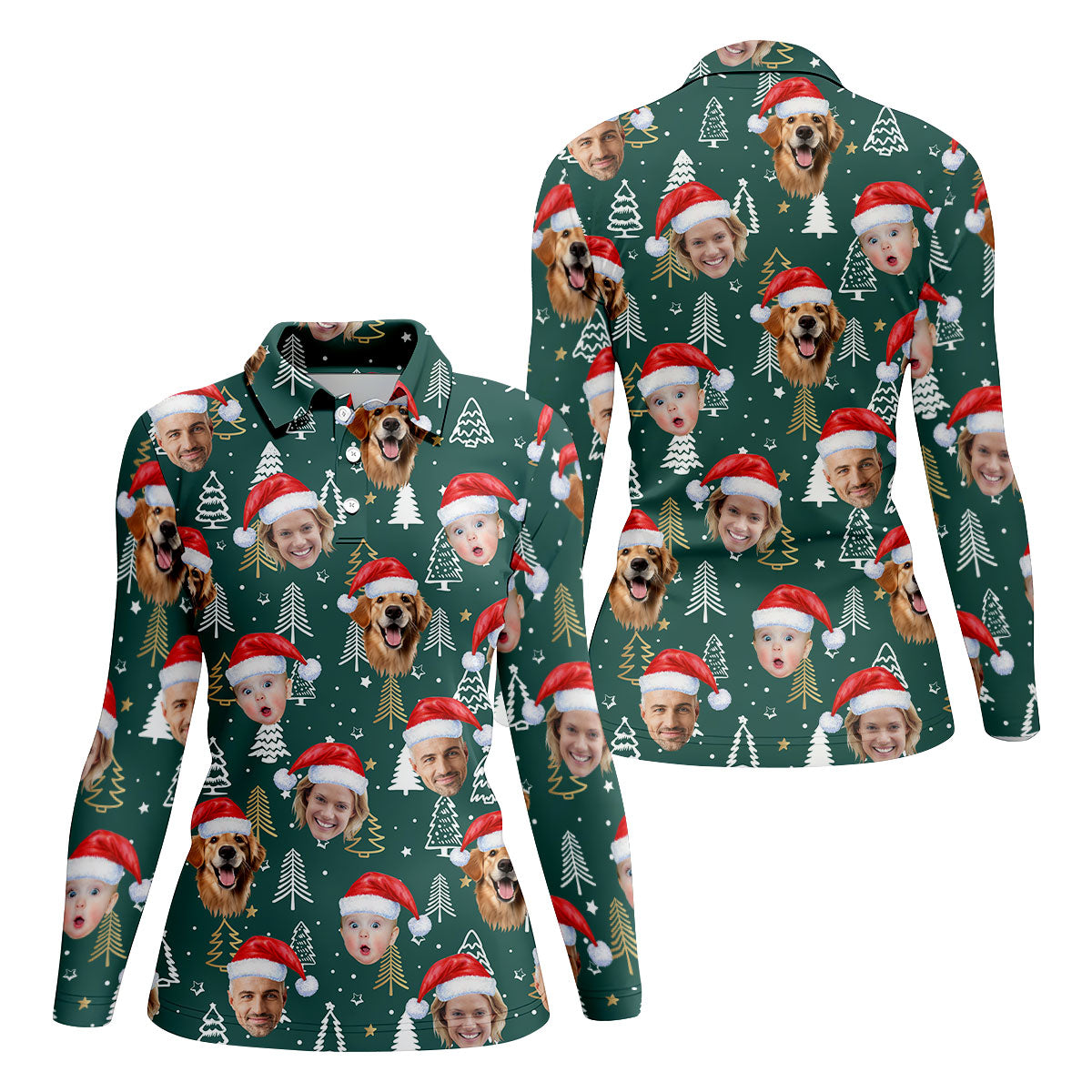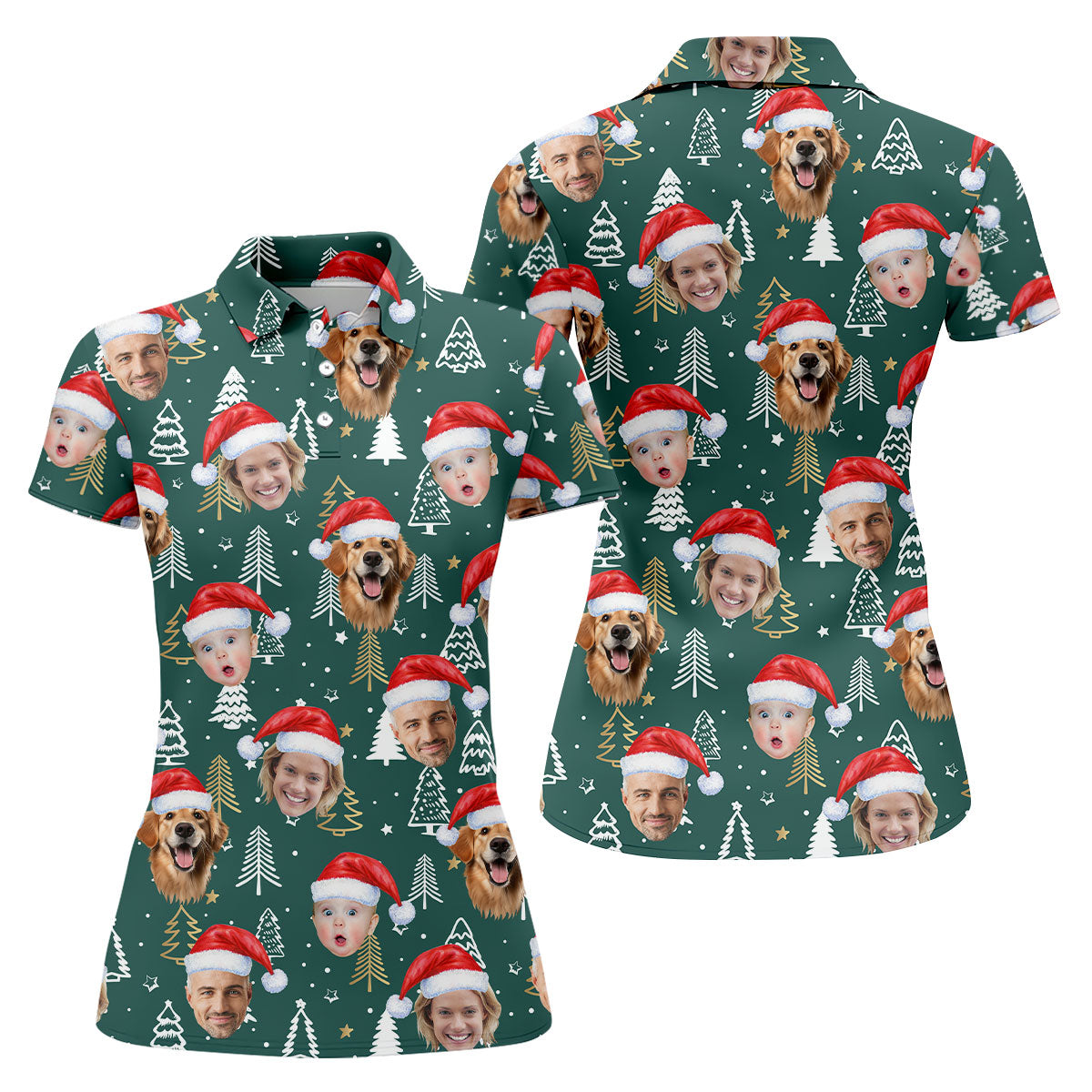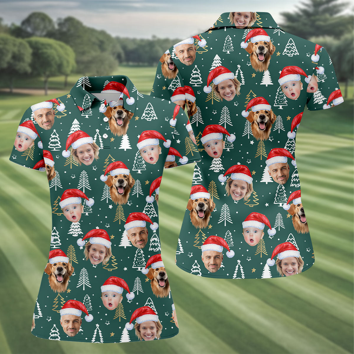 Custom Face Pine Tree Pattern Dark Green Christmas Golf Shirt, Ladies Golf Shirts, Golf Gifts For Women