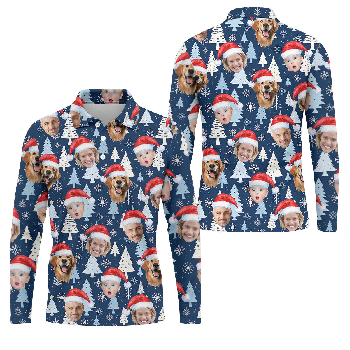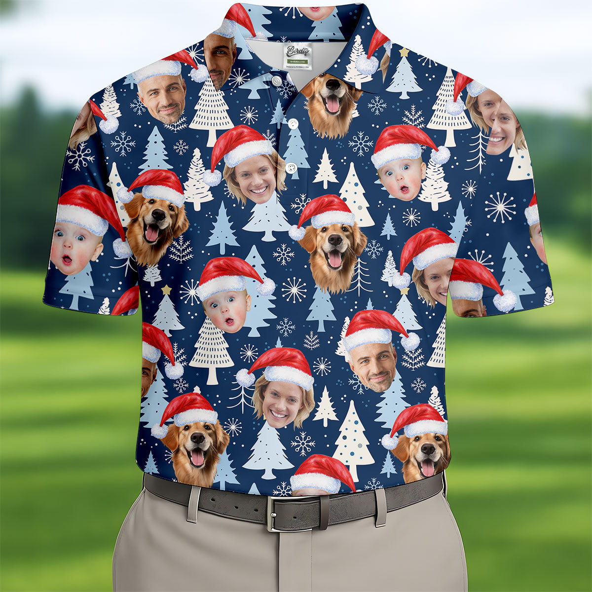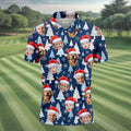 Custom Face Pine Tree Pattern White And Navy Christmas Golf Shirt, Golf Shirts For Men, Golf Gift For Men