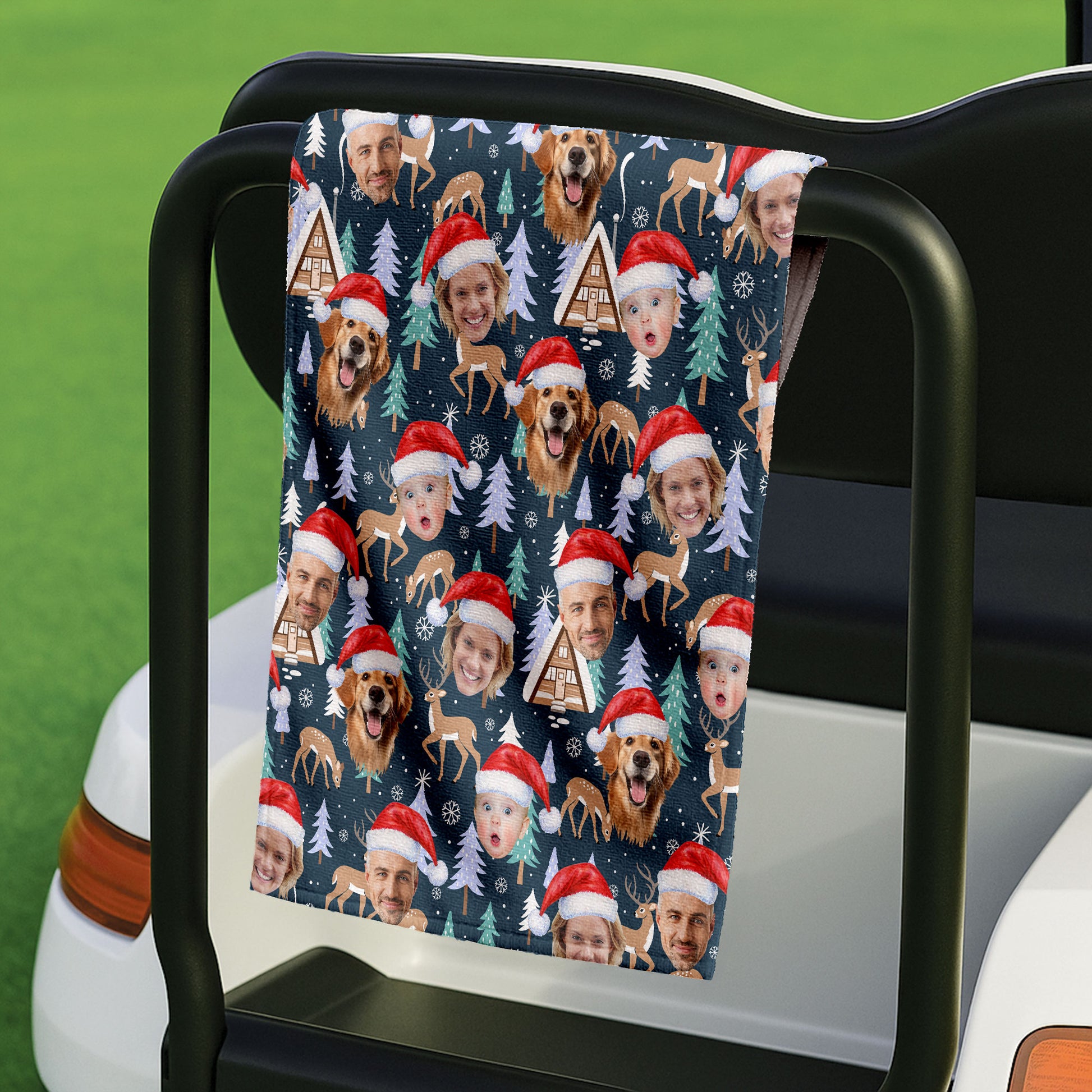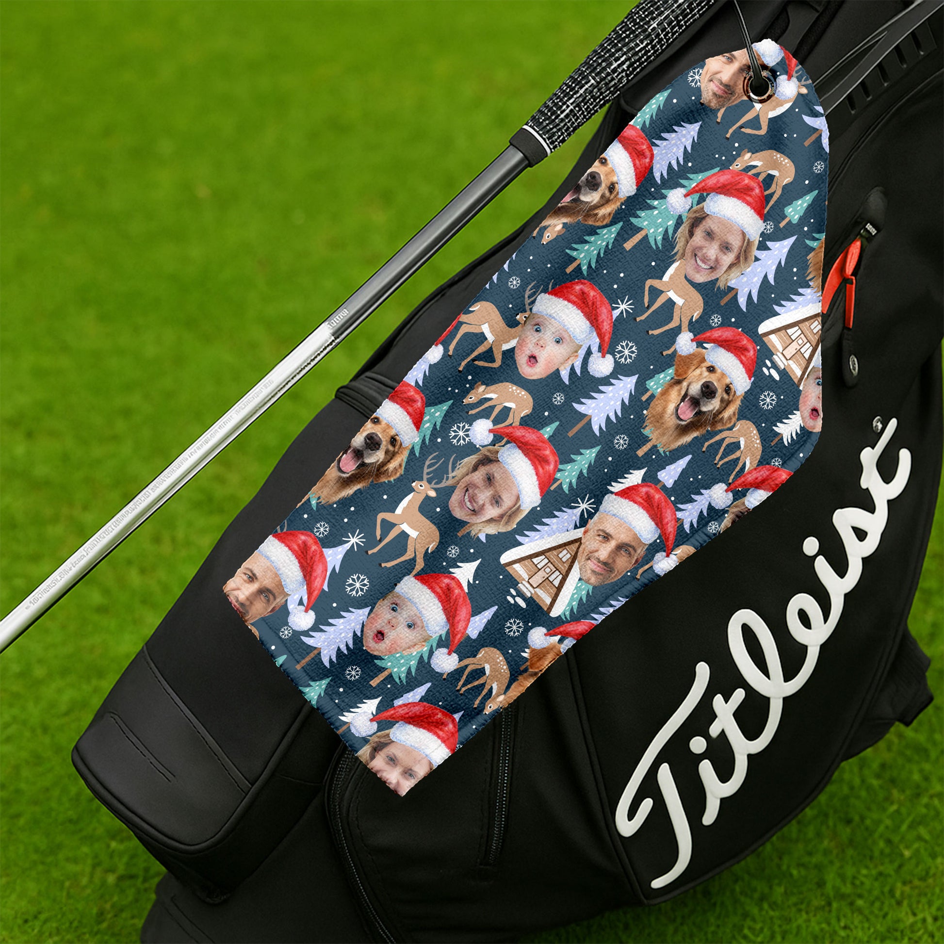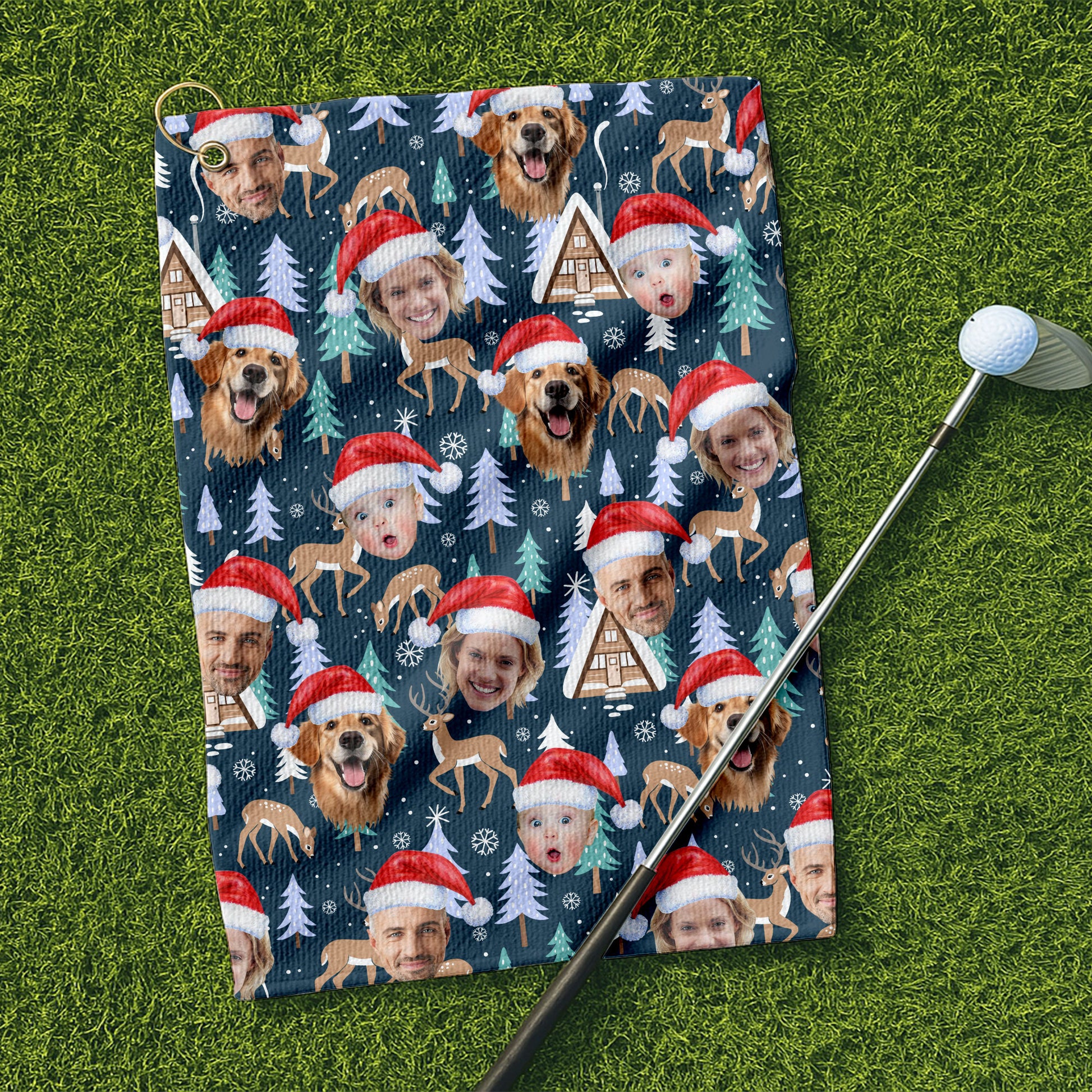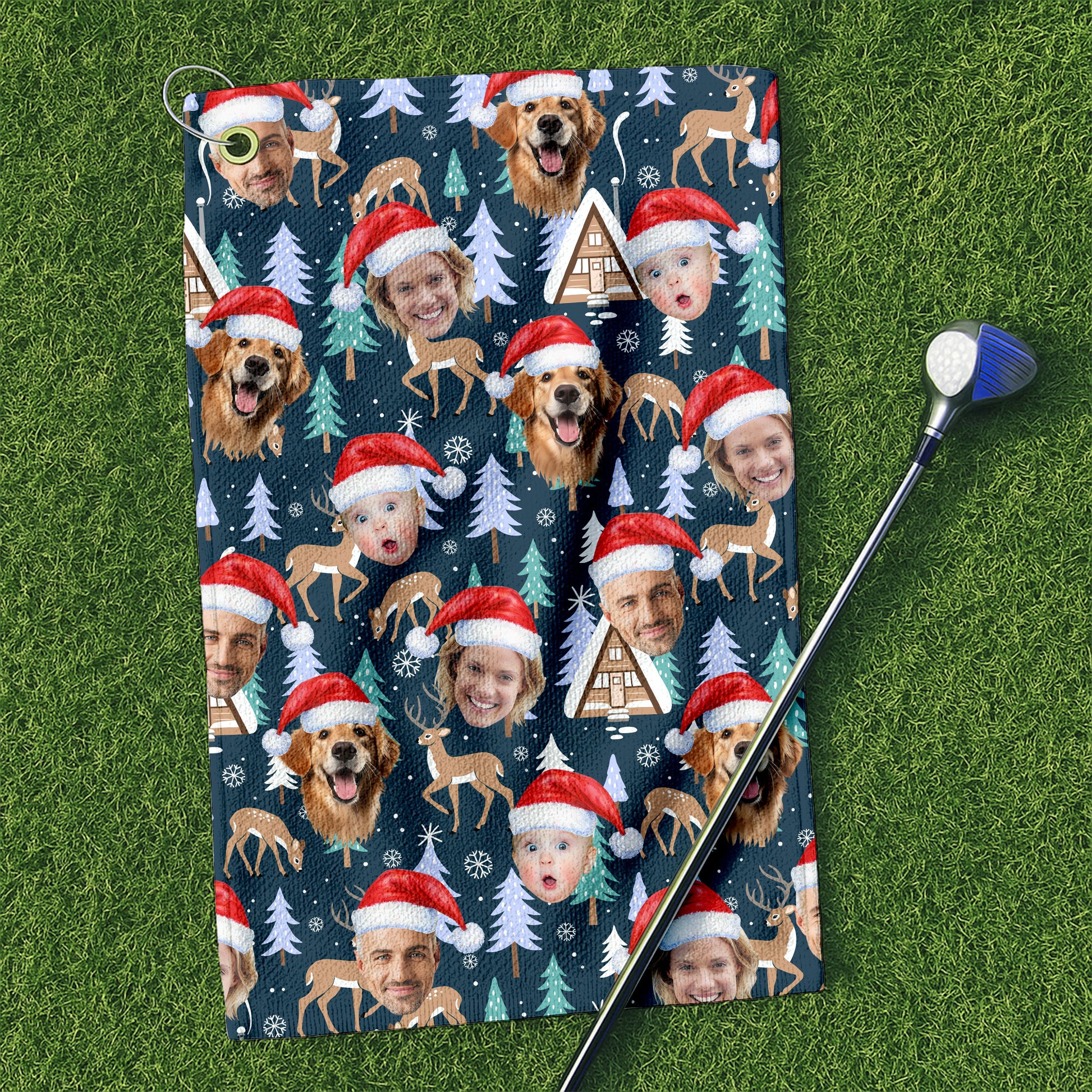 Custom Face Pine Tree Reindeer Dark Teal Green Golf Towels, Christmas Golf Gift, Custom Golf Accessories