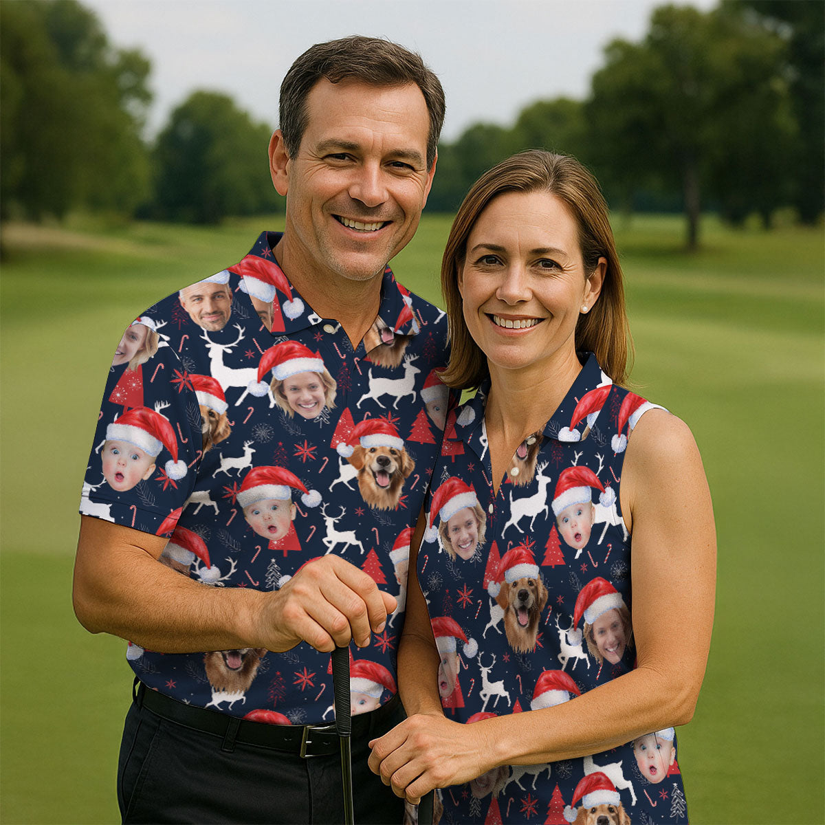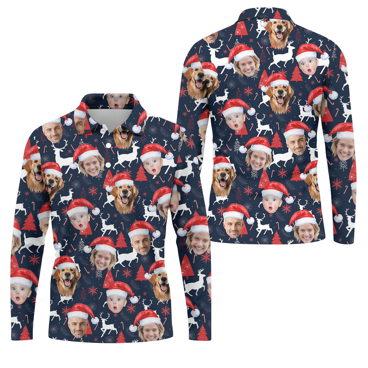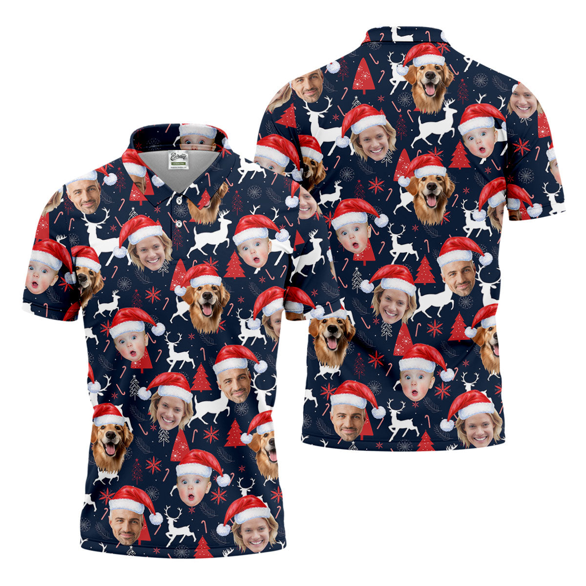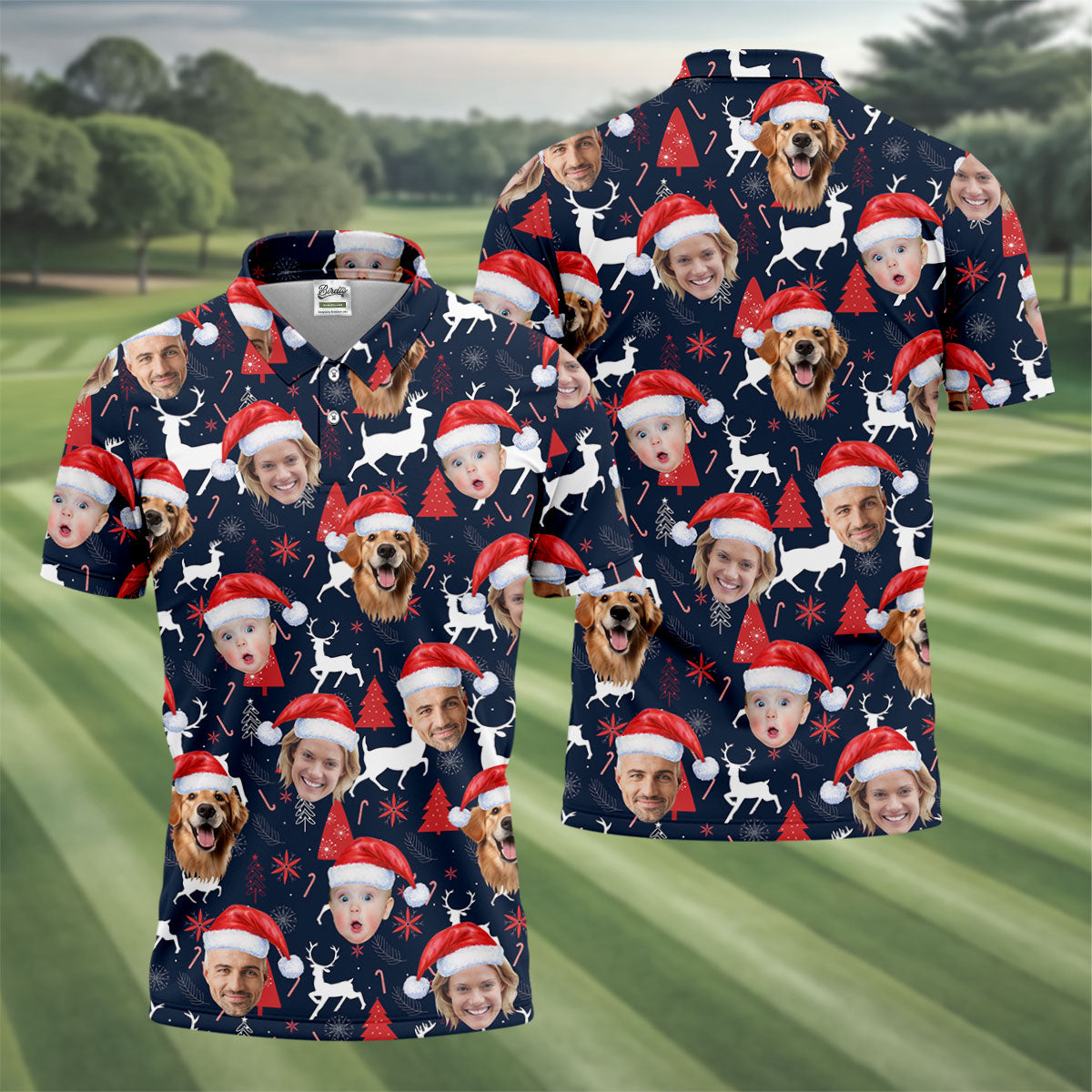 Custom Face Red And Navy Seamless Pattern Christmas Golf Shirt, Golf Shirts For Men, Golf Gift For Men