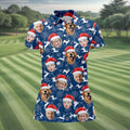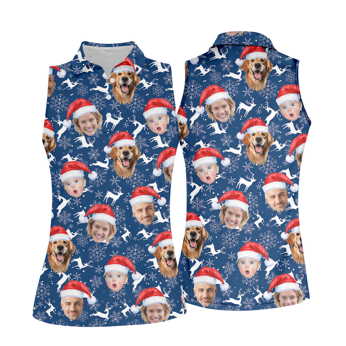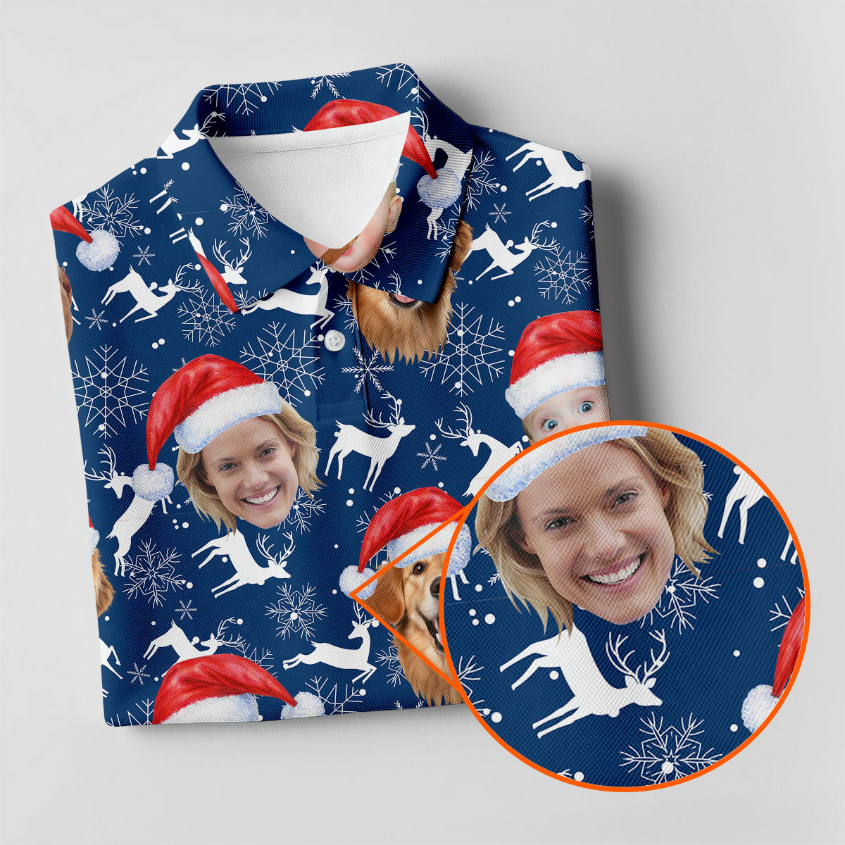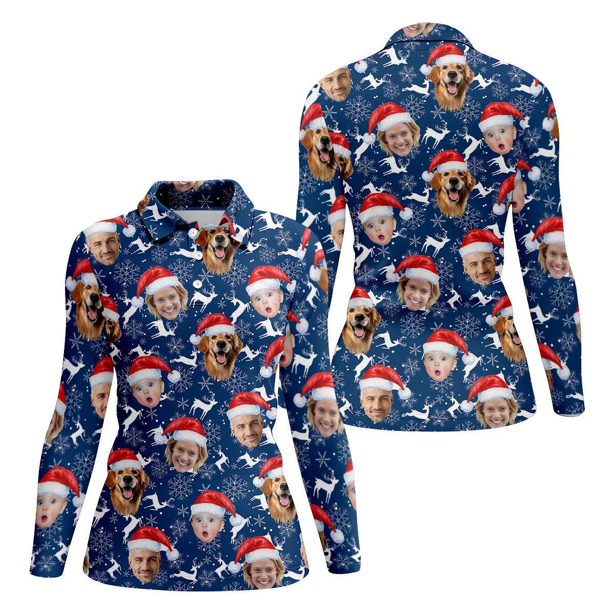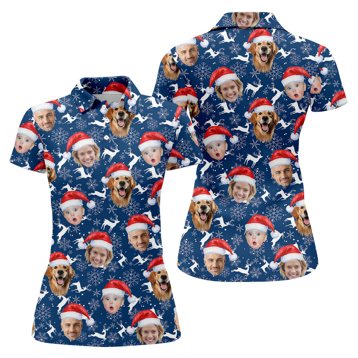 Custom Face Reindeer Pattern Navy Golf Shirt, Christmas Golf Shirt, Women's Golf Tops, Golf Gift For Ladies