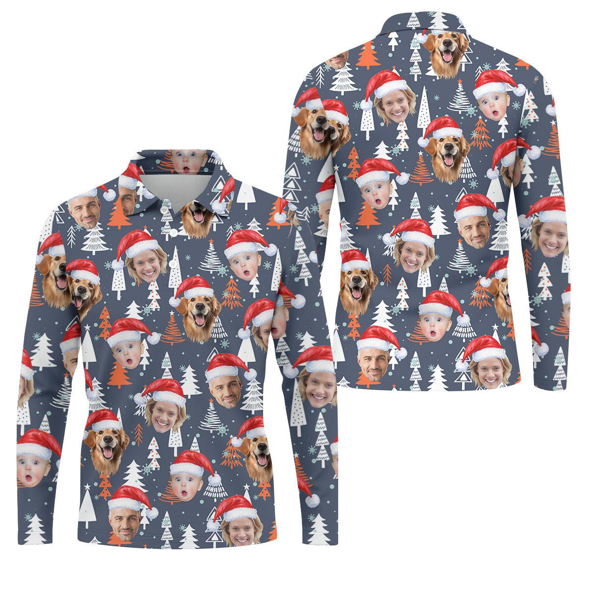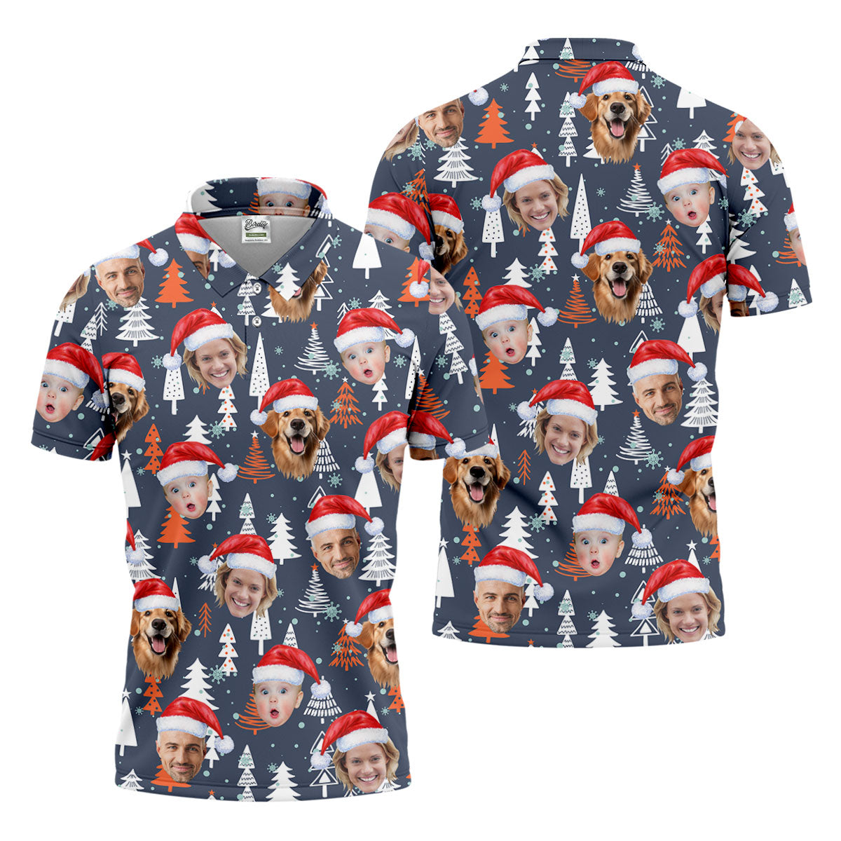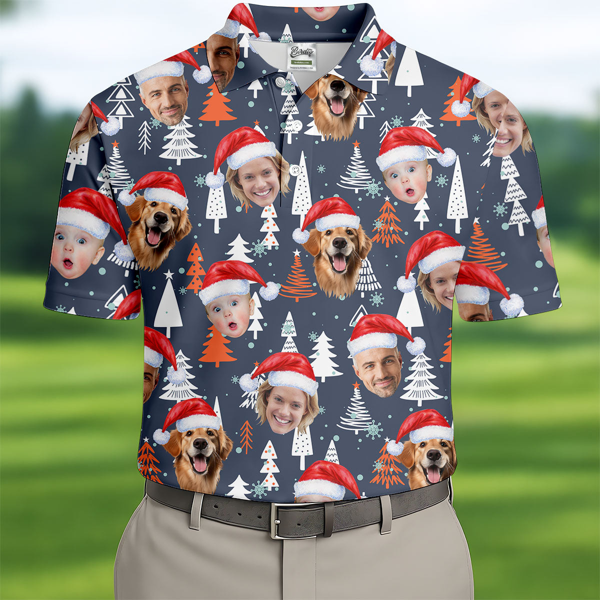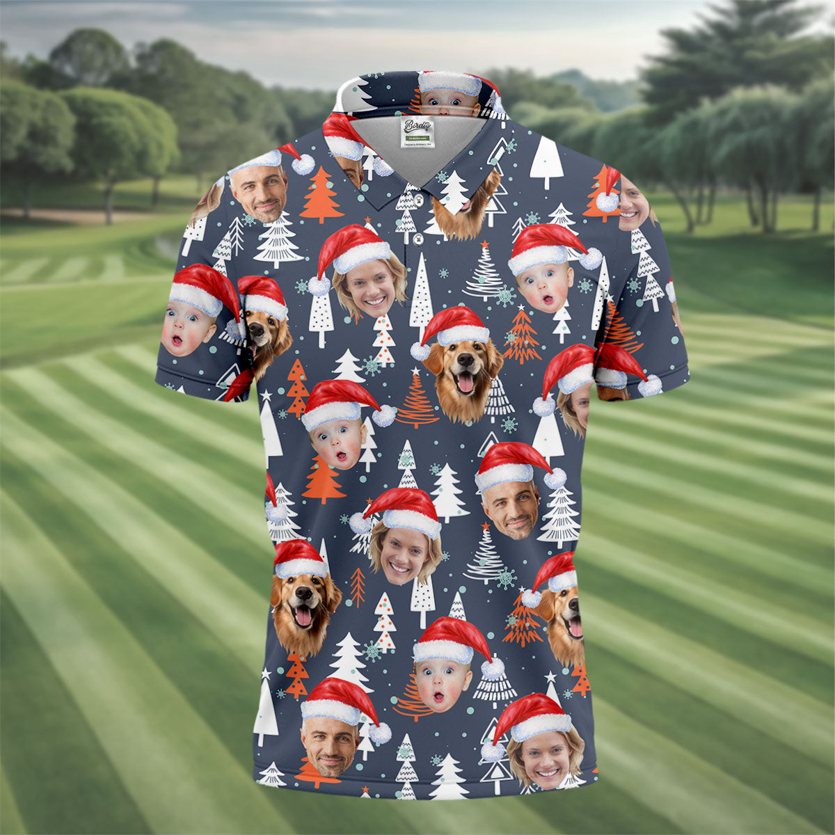 Custom Face White And Orange Xmas Pine Tree Christmas Golf Shirt, Golf Gift For Men, Golf Shirts For Men
