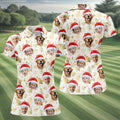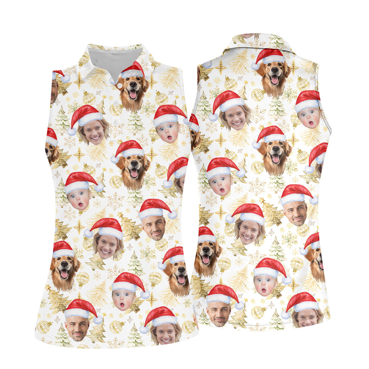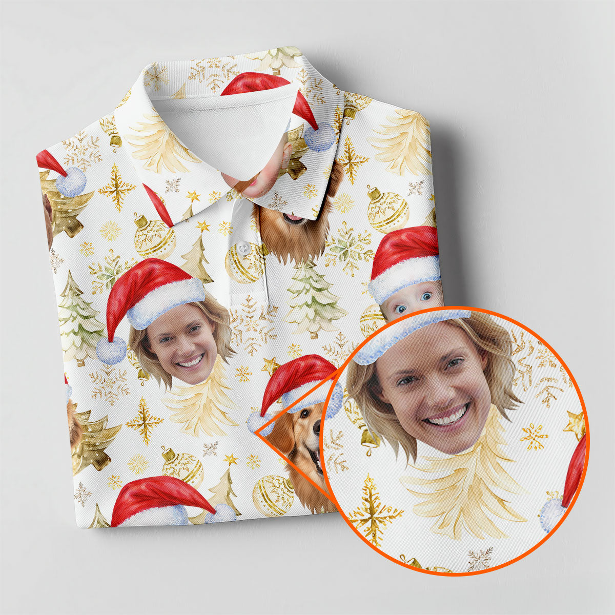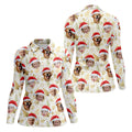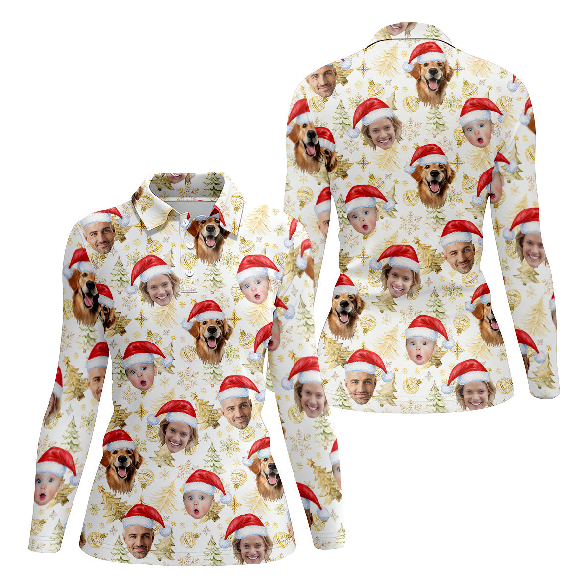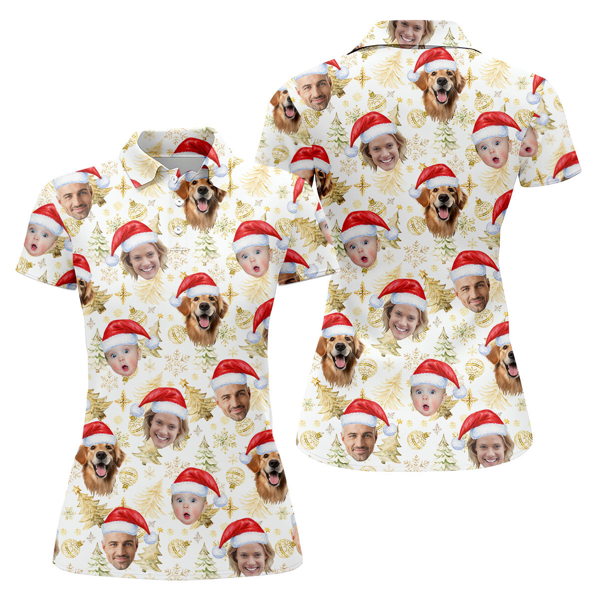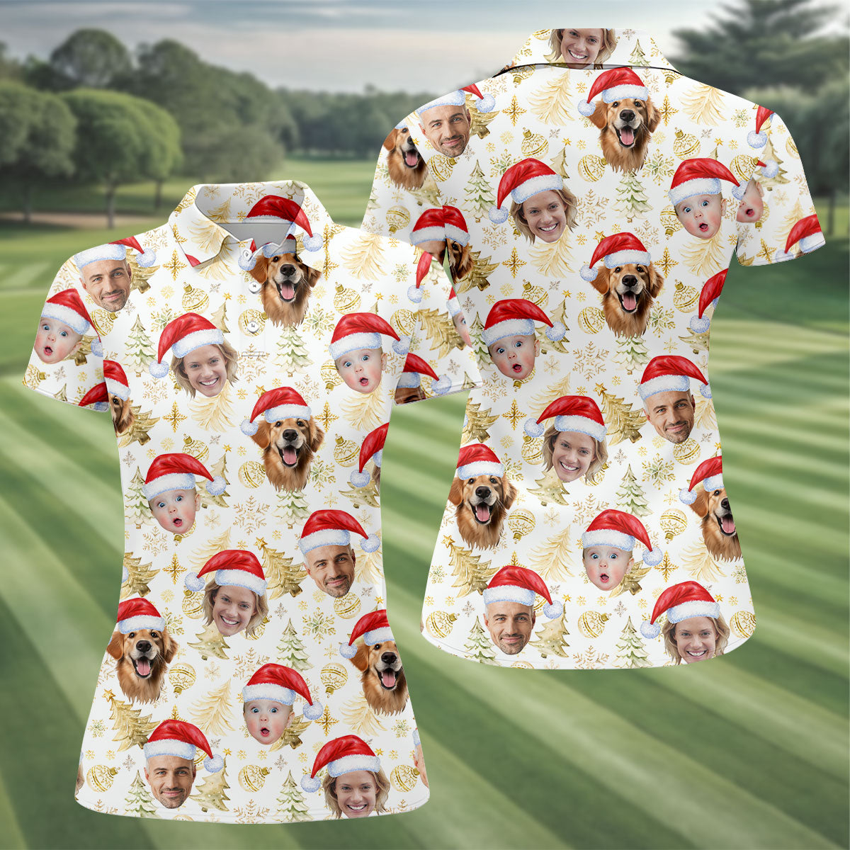 Custom Face Xmas Pattern Golden Print Christmas Golf Shirt, Ladies Golf Tops, Golf Gifts For Women