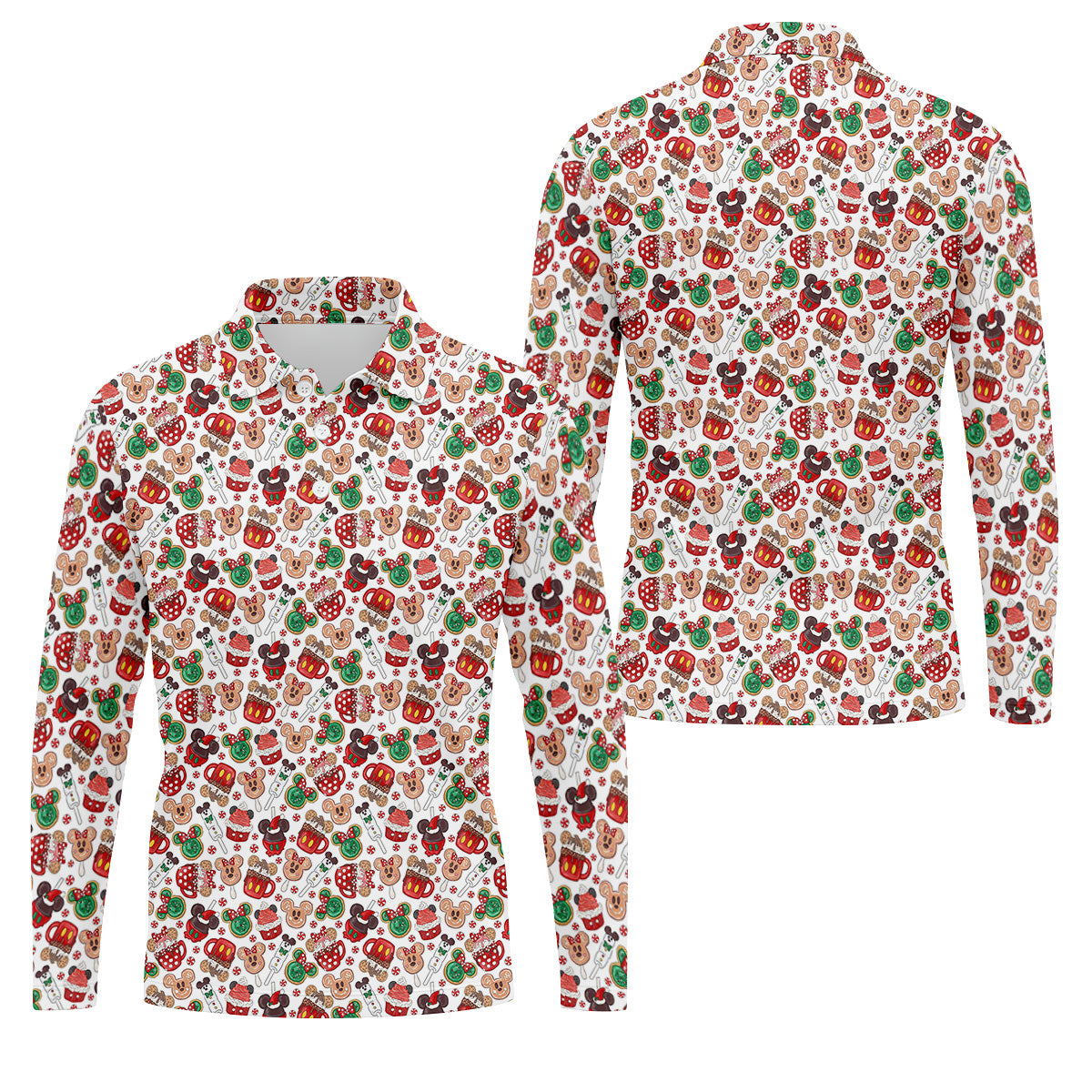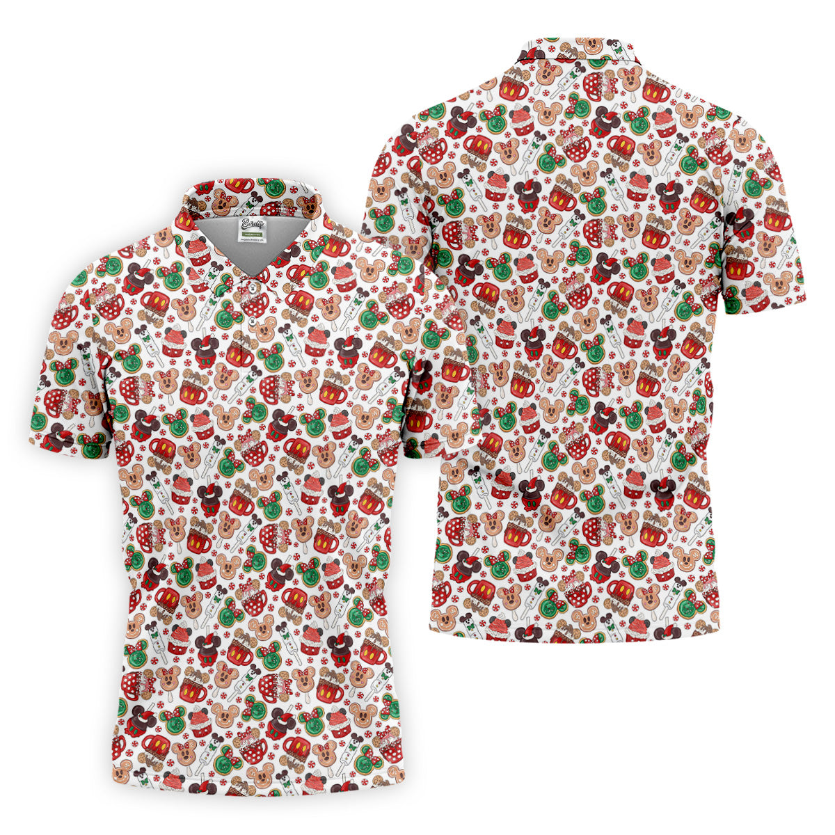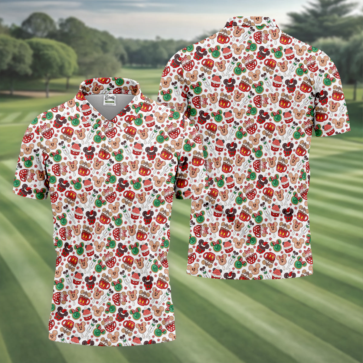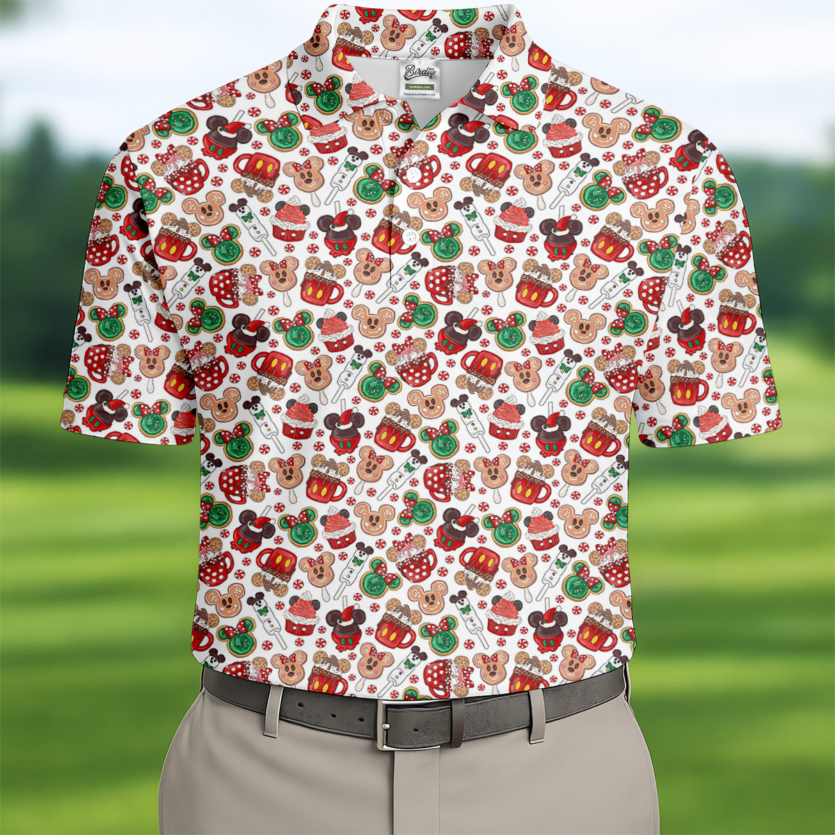 Cute Christmas Dessert Pattern Golf Tops For Men, Cartoon Character Polo Shirts For Men, Christmas Golf Shirt