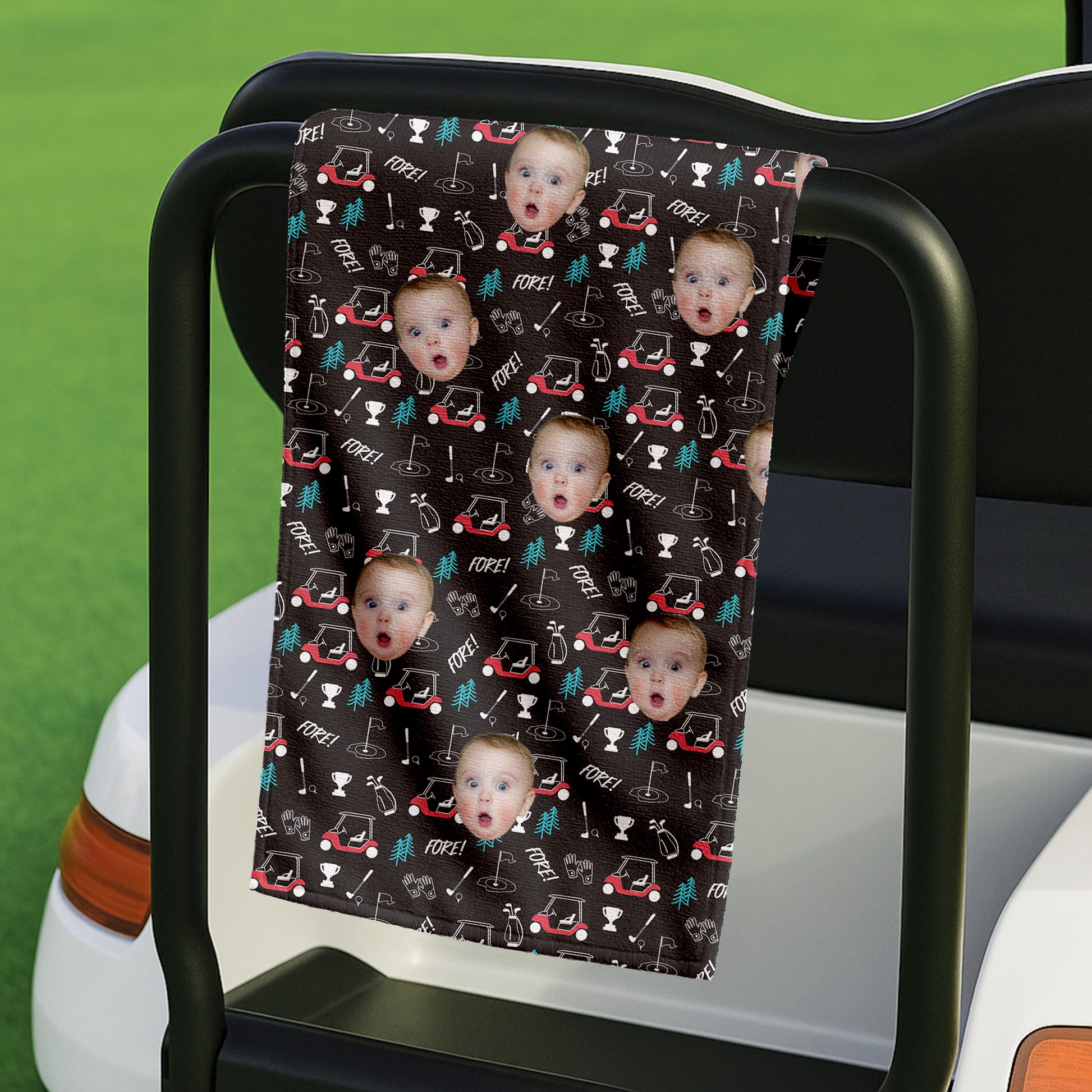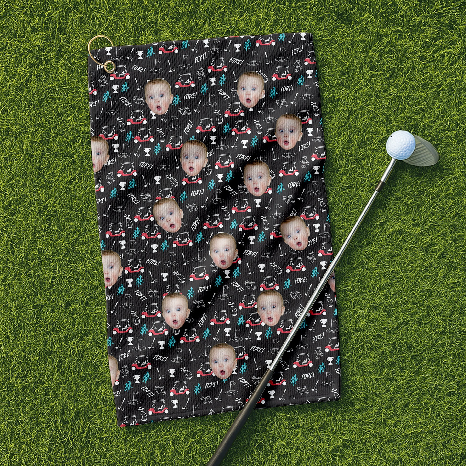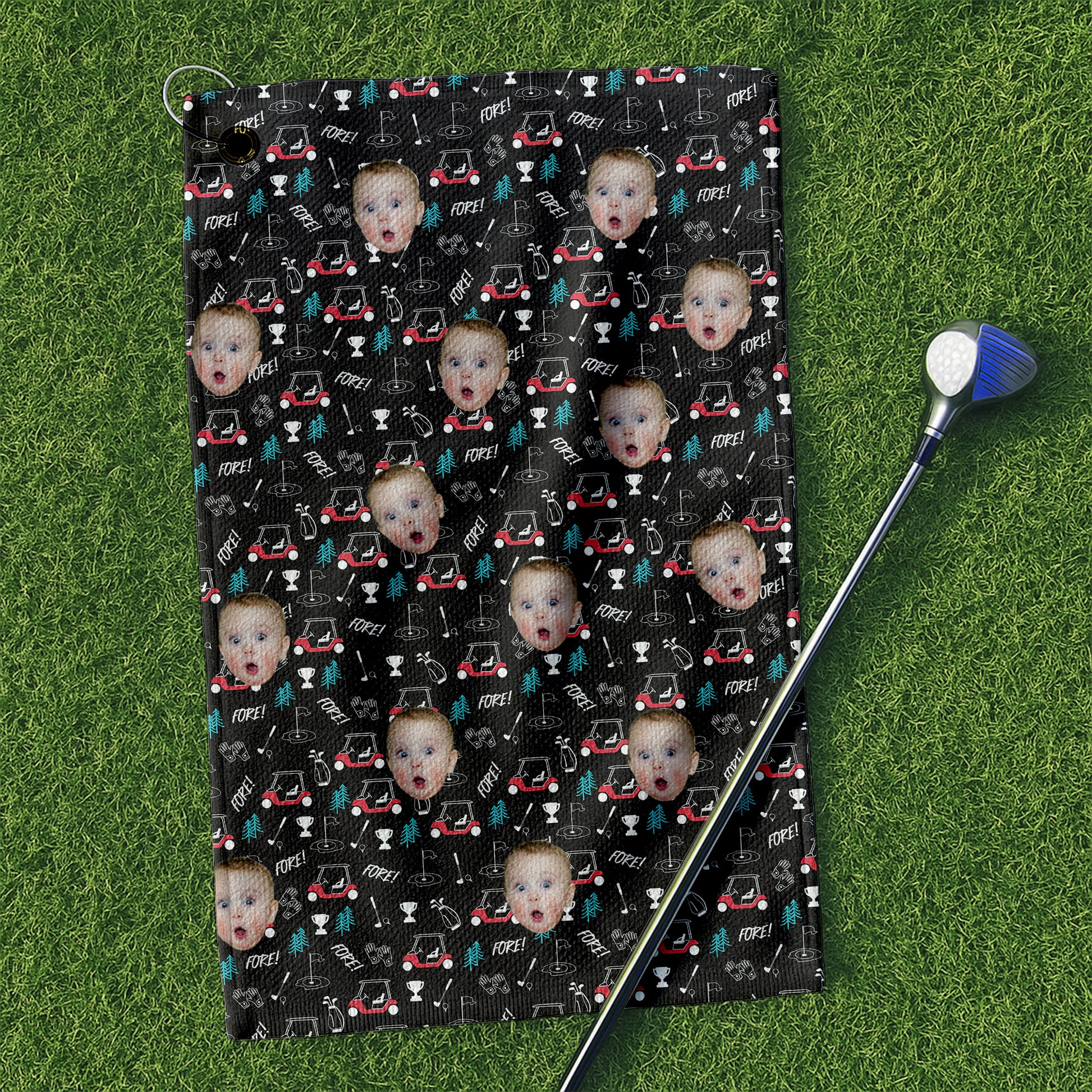 Fore! Golf Custom Face Black Small Funny Golf Towel, Golf Rag, Christmas Golf Gift