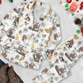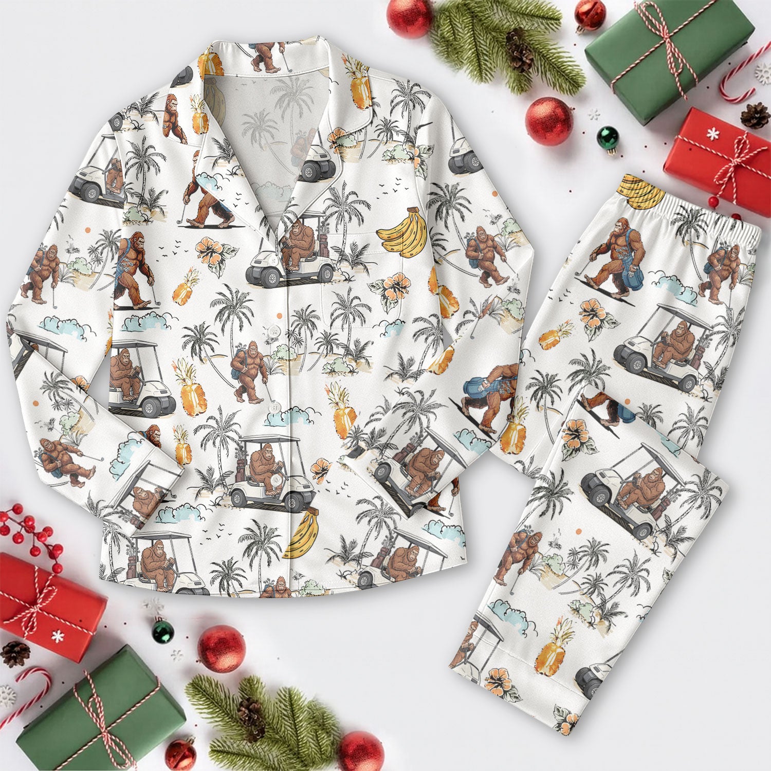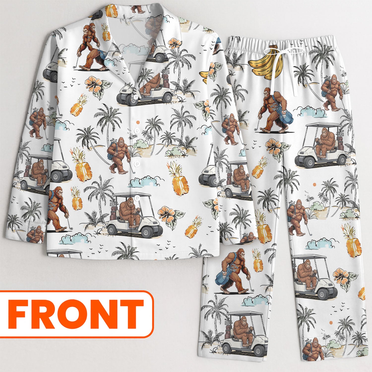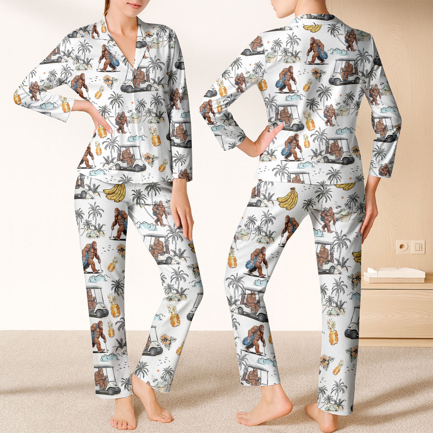 Funny Bigfoot Tropical Pajama, White Satin Pajama, Long Sleeve Pajama Set, Fun Pajama Sets