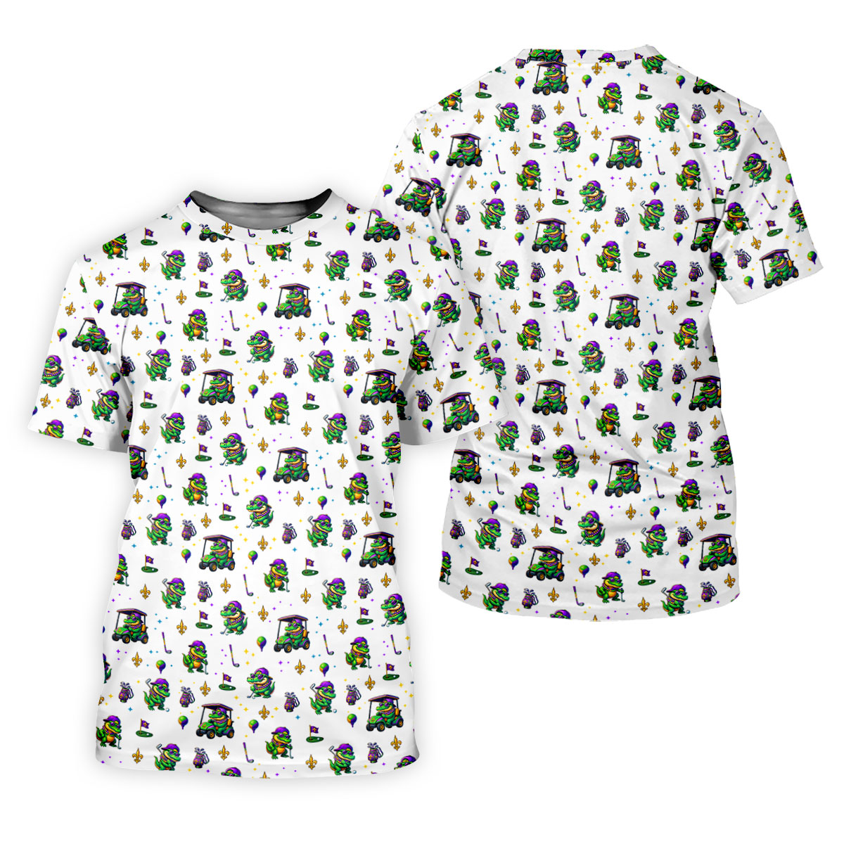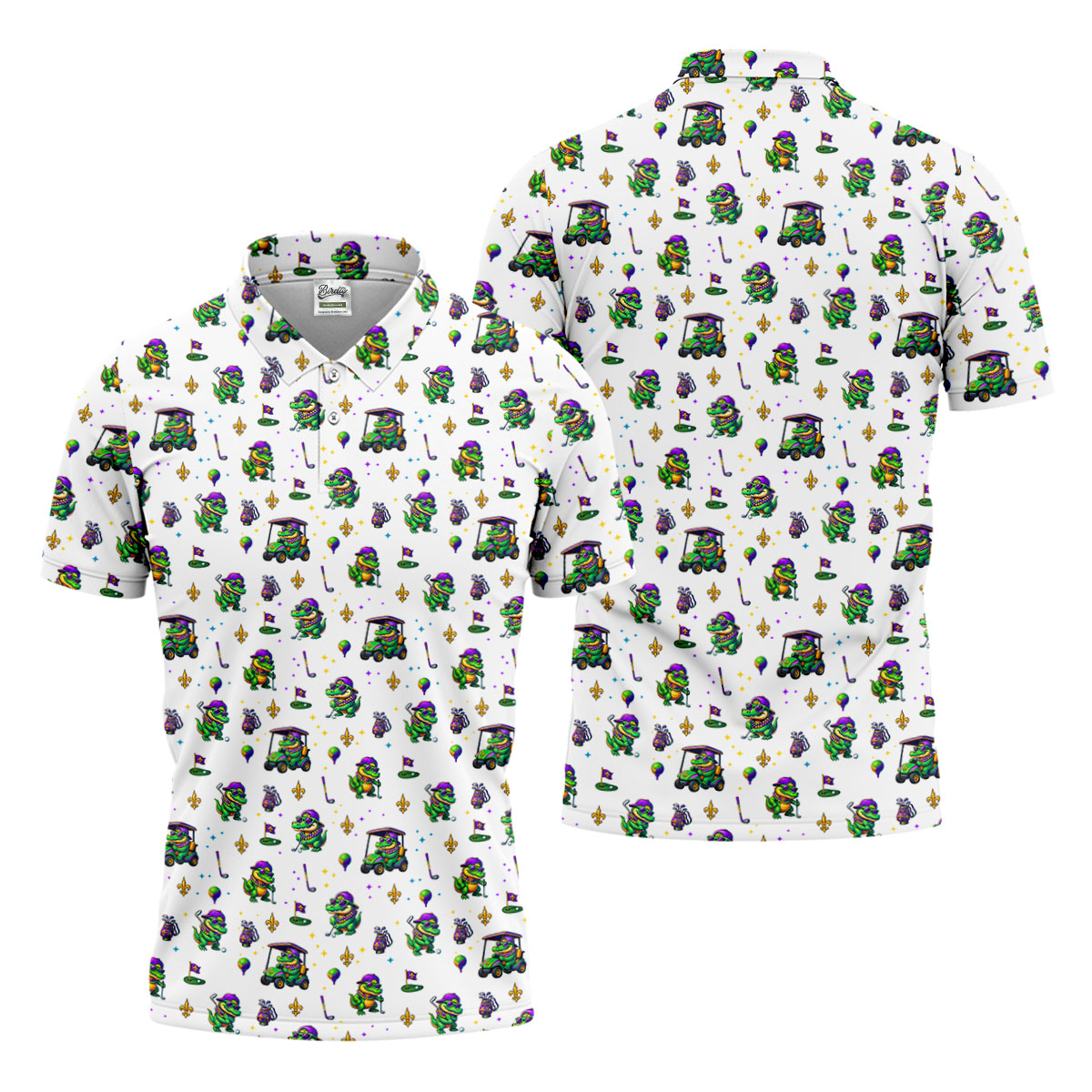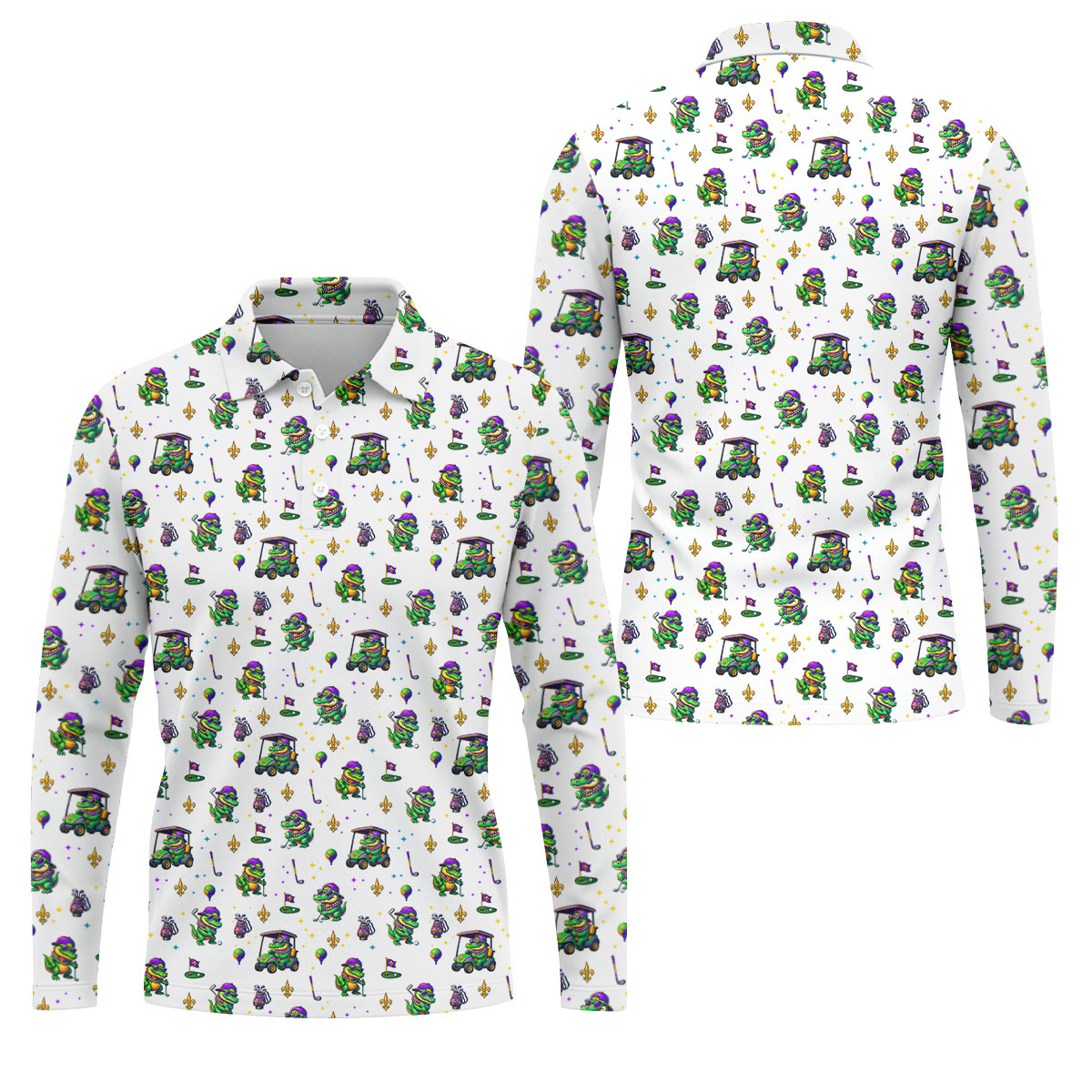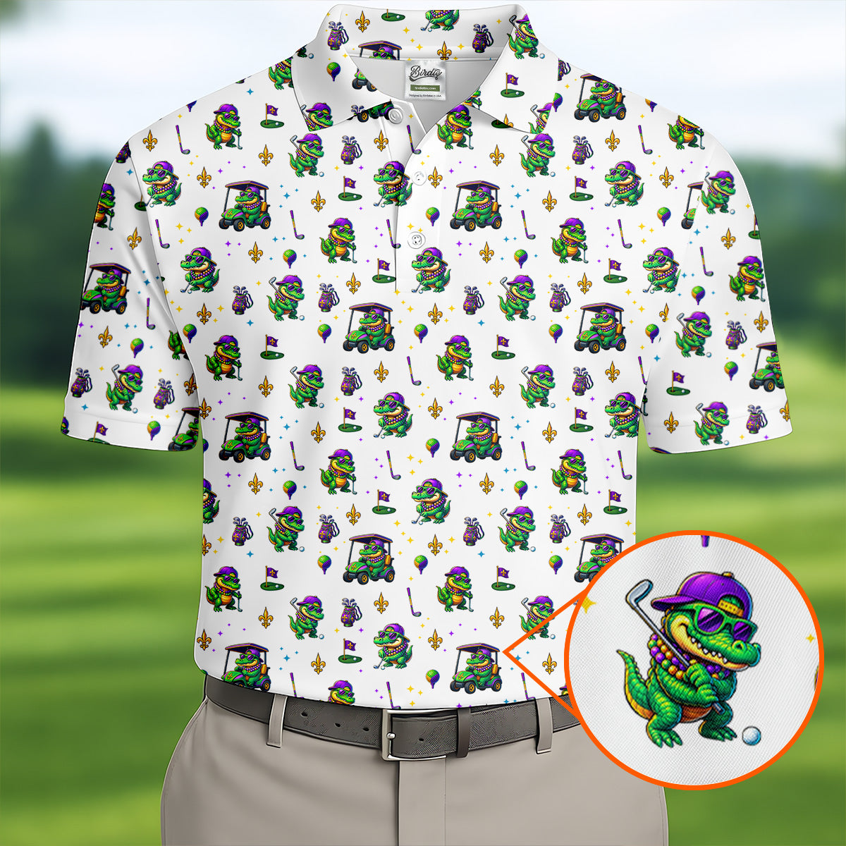 Funny Crocodile Golfing Mardi Gras Golf Shirts, White Golf Shirt, Golf Gift For Men, Golf Shirts For Men