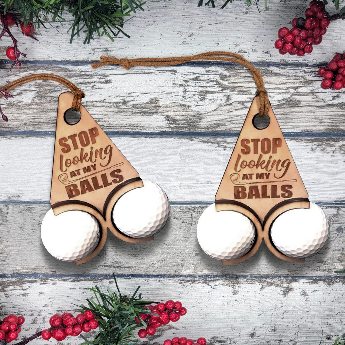 Looking for the perfect golf gift that’ll get laughs and start conversations? This hilarious golf ball ornament is just what you need! Featuring two realistic golf balls and a cheeky laser-engraved quote – “Stop Looking At My Balls” – it’s the ultimate gag gift for golfers with a sense of humor.