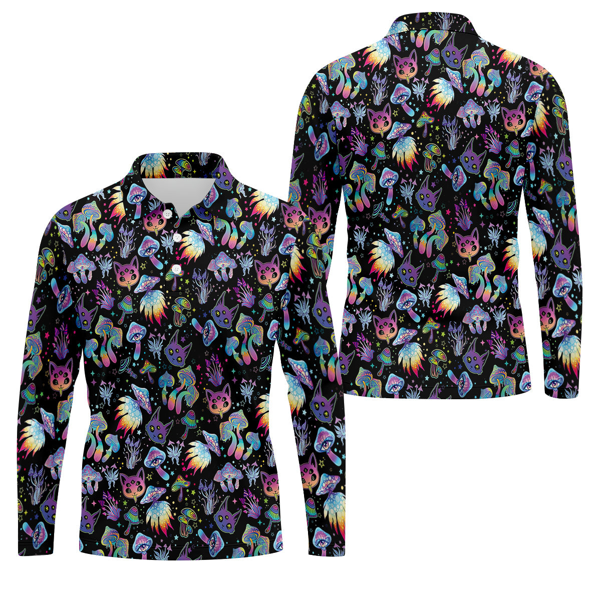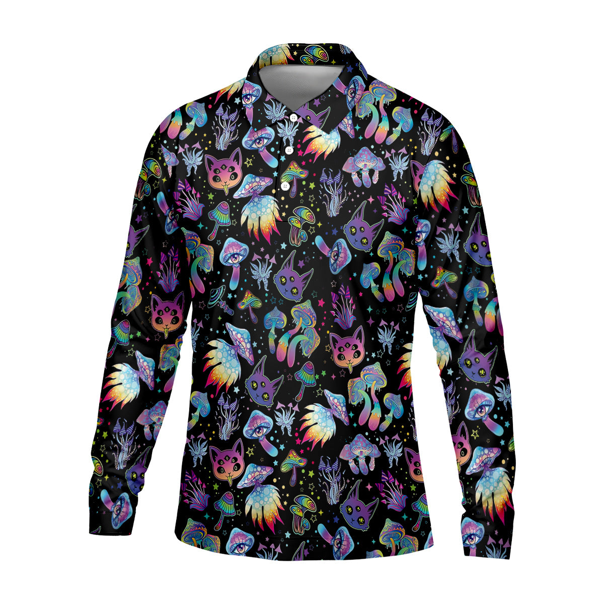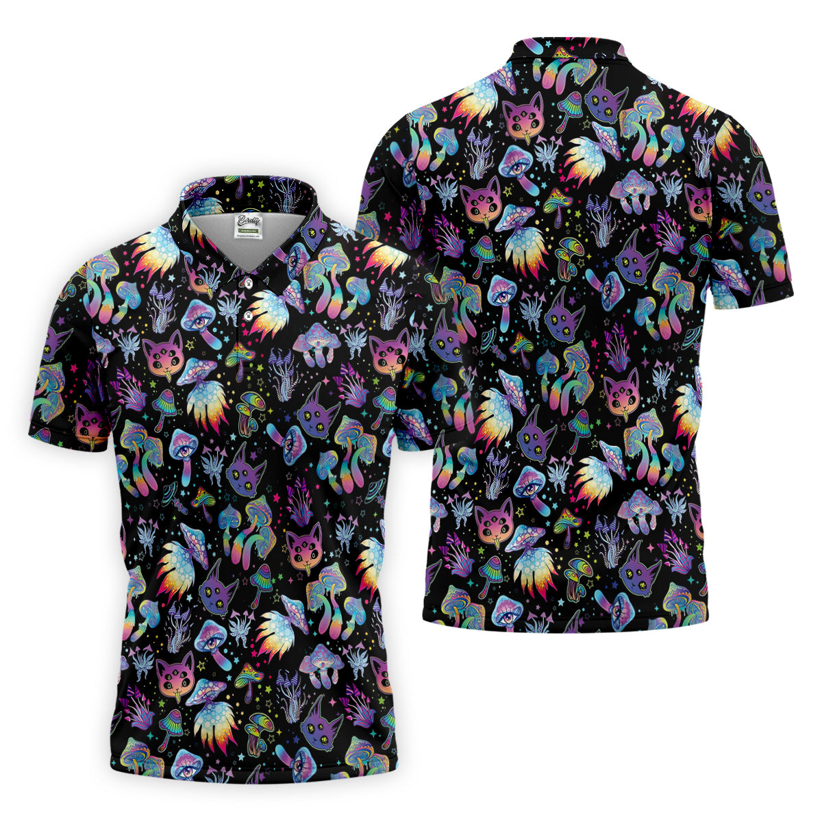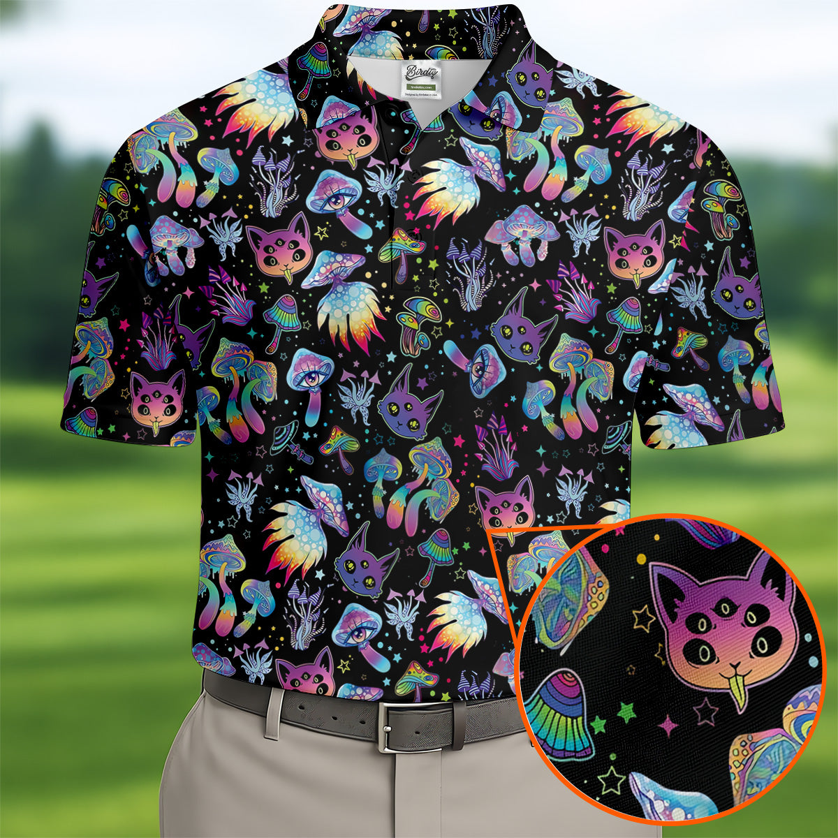 Funny Neon Cat Alien Mushroom Golf Tops For Men, Cute Golf Outfit, Polo Shirts For Men, Golfing Apparel