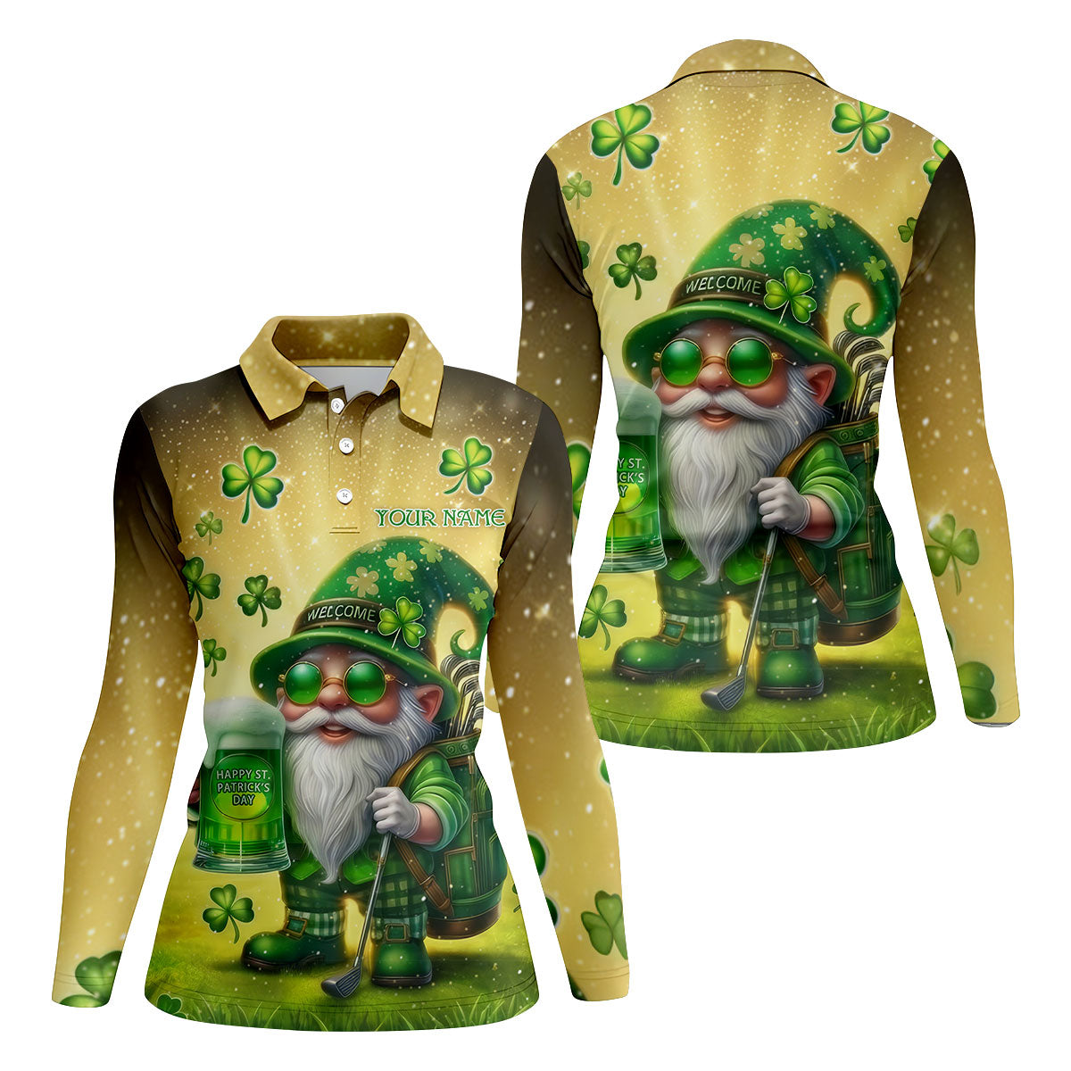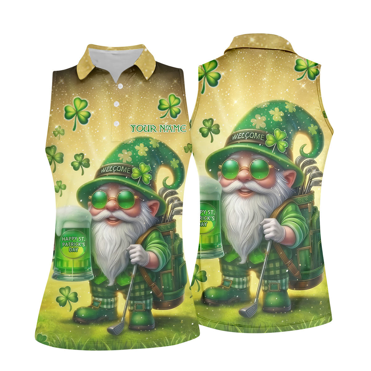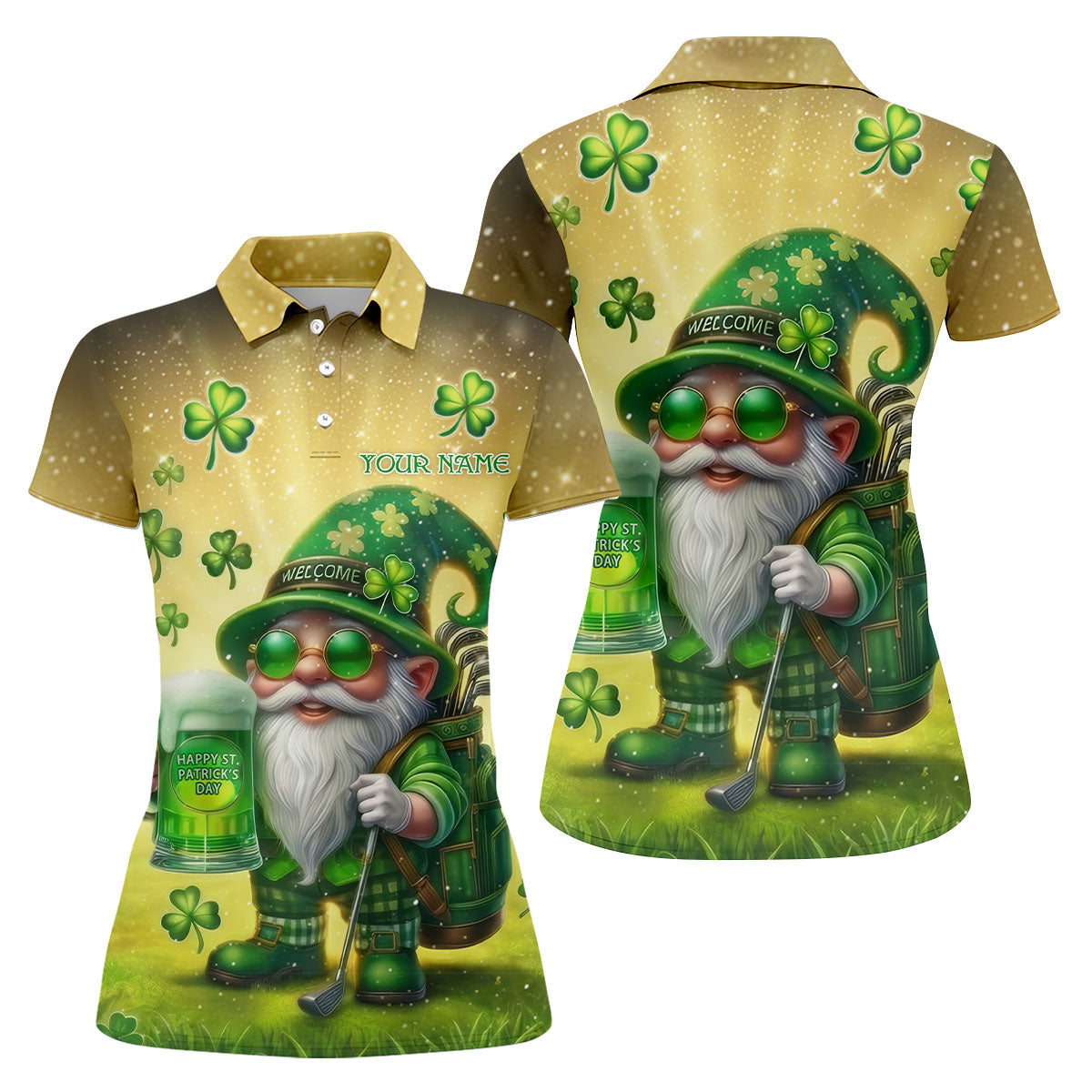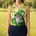 Happy St Patrick's Day Shamrock Gnome Golf And Beer Women's Golf Tops, Ladies Golf Polos