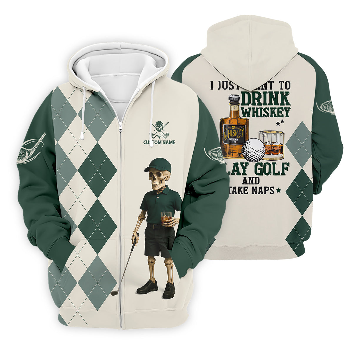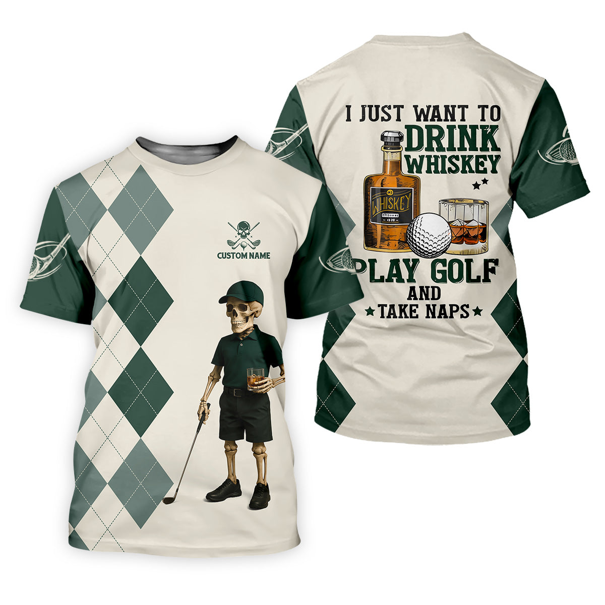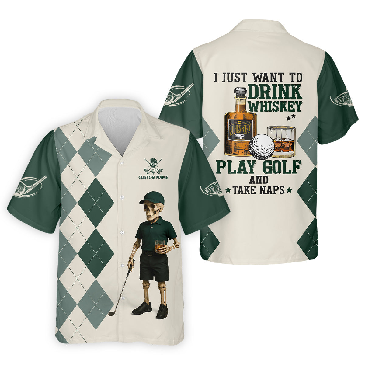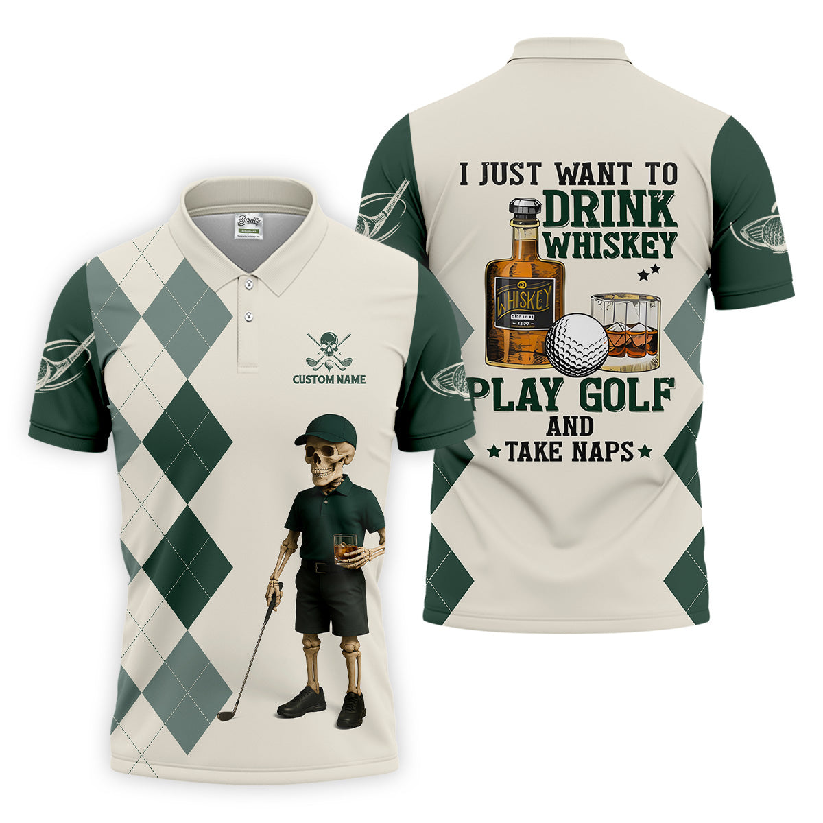 I Just Want To Drink Whiskey Play Golf And Take Naps Funny Skeleton Argyle Golf Shirt, Mens Funny Golf Shirts