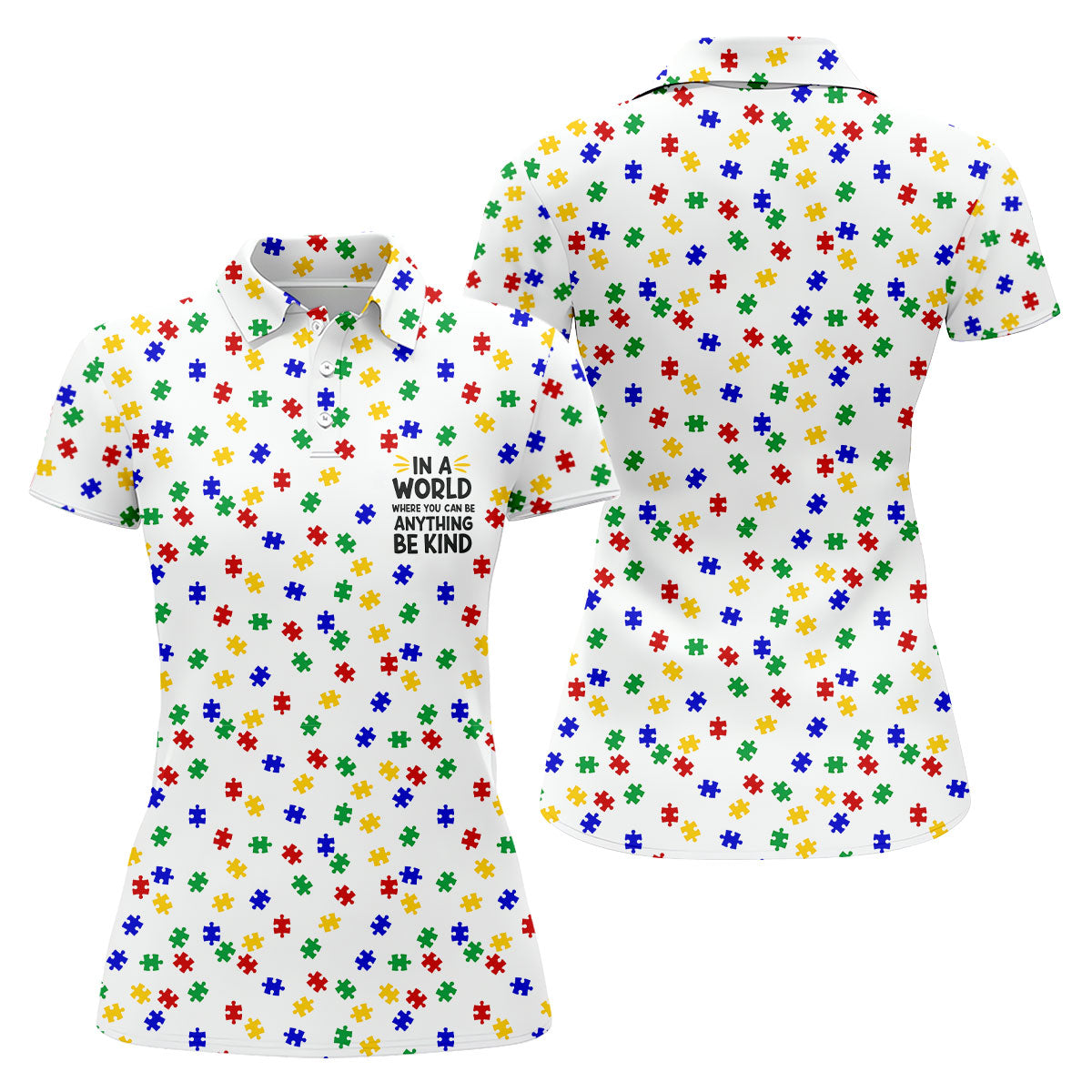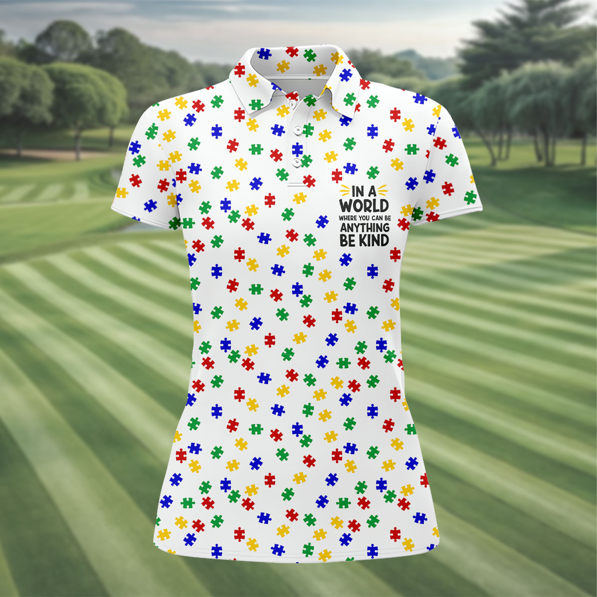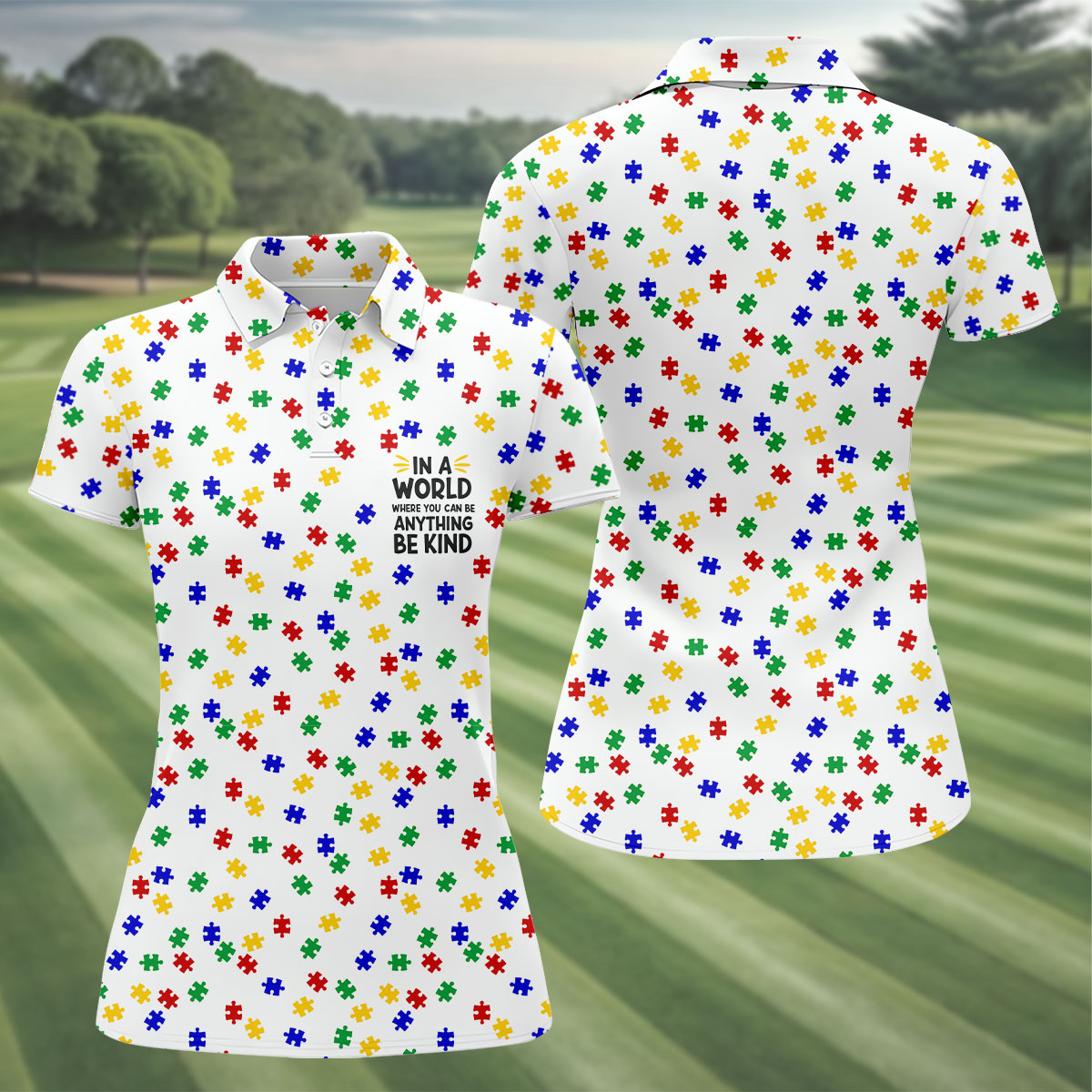 In A World Where You Can Be Anything Be Kind Women's Golf Tops, Autism Awareness Color Ladies Golf Polos