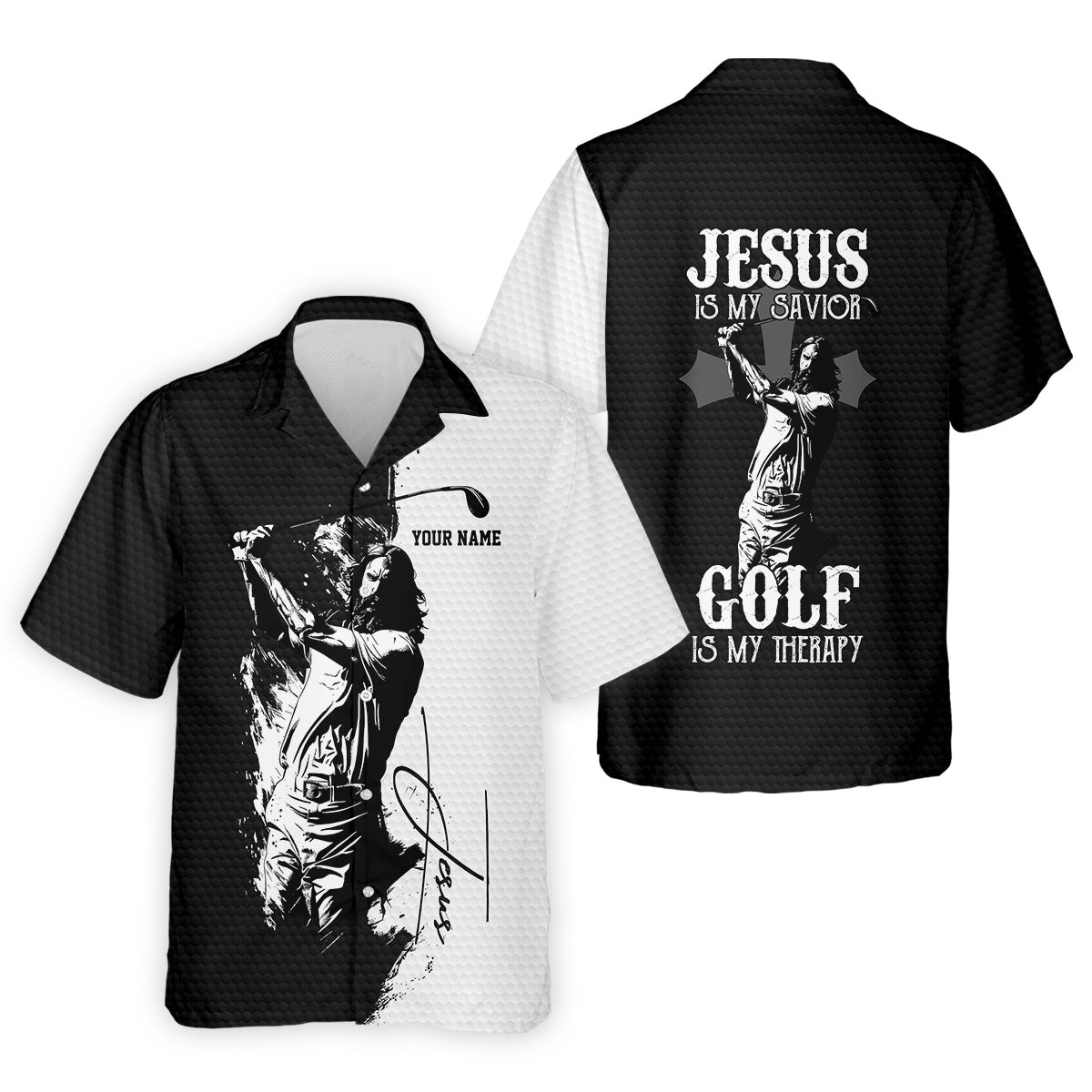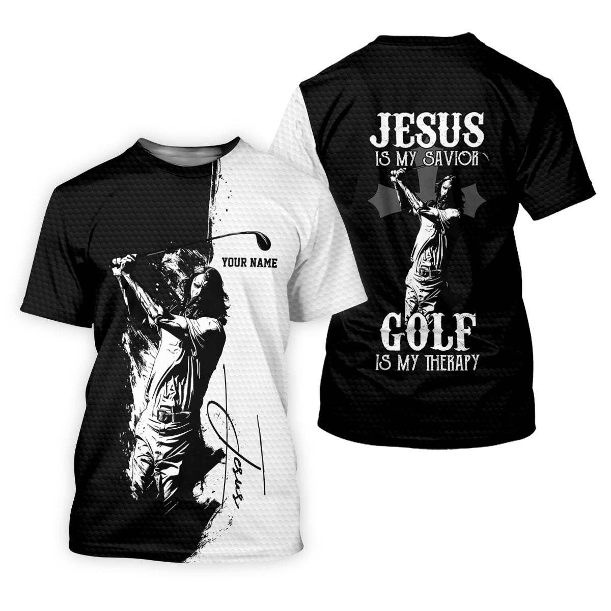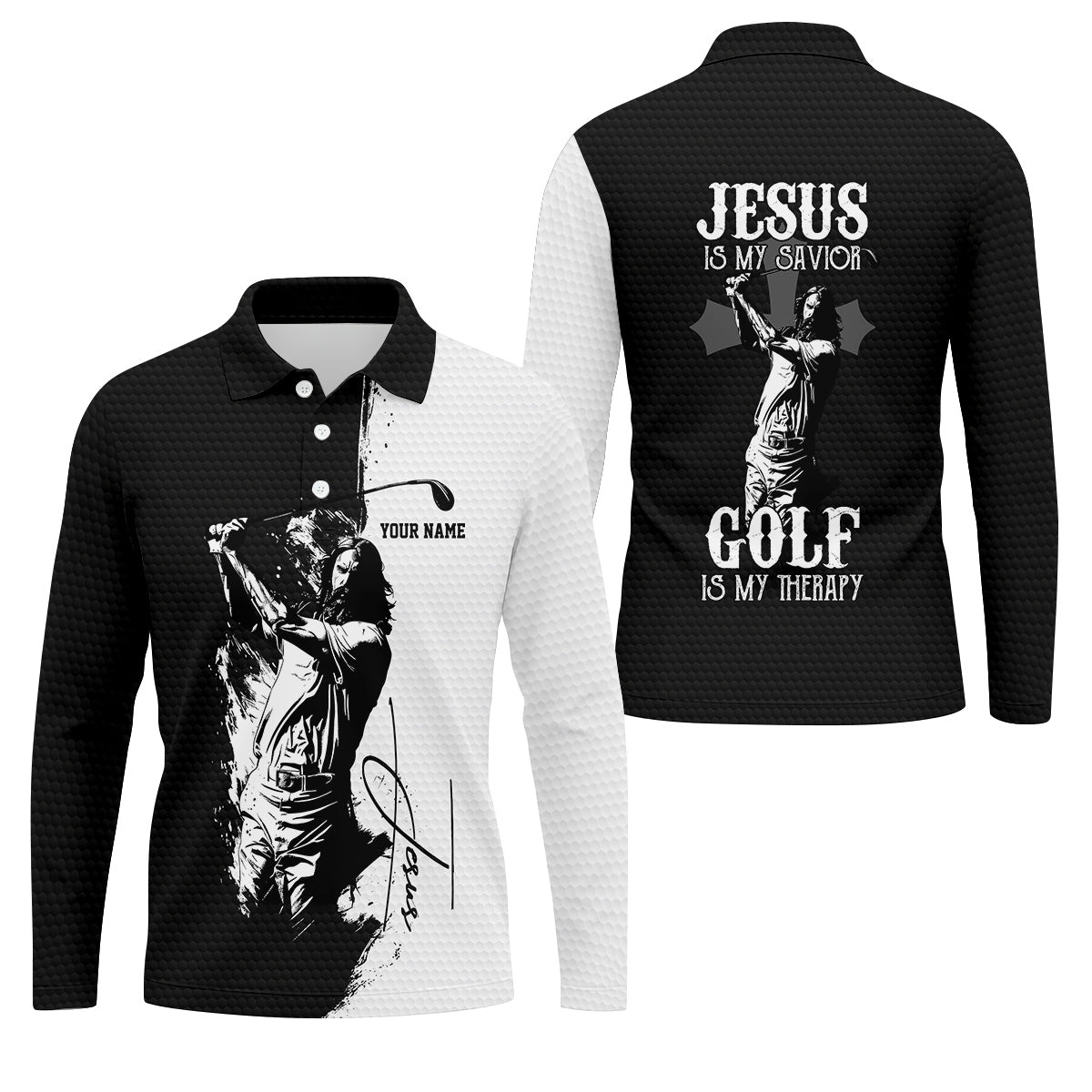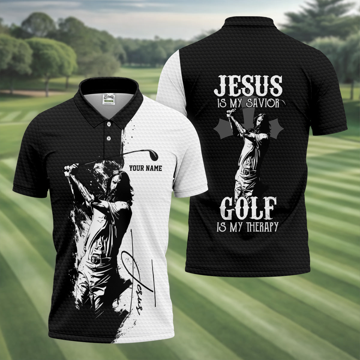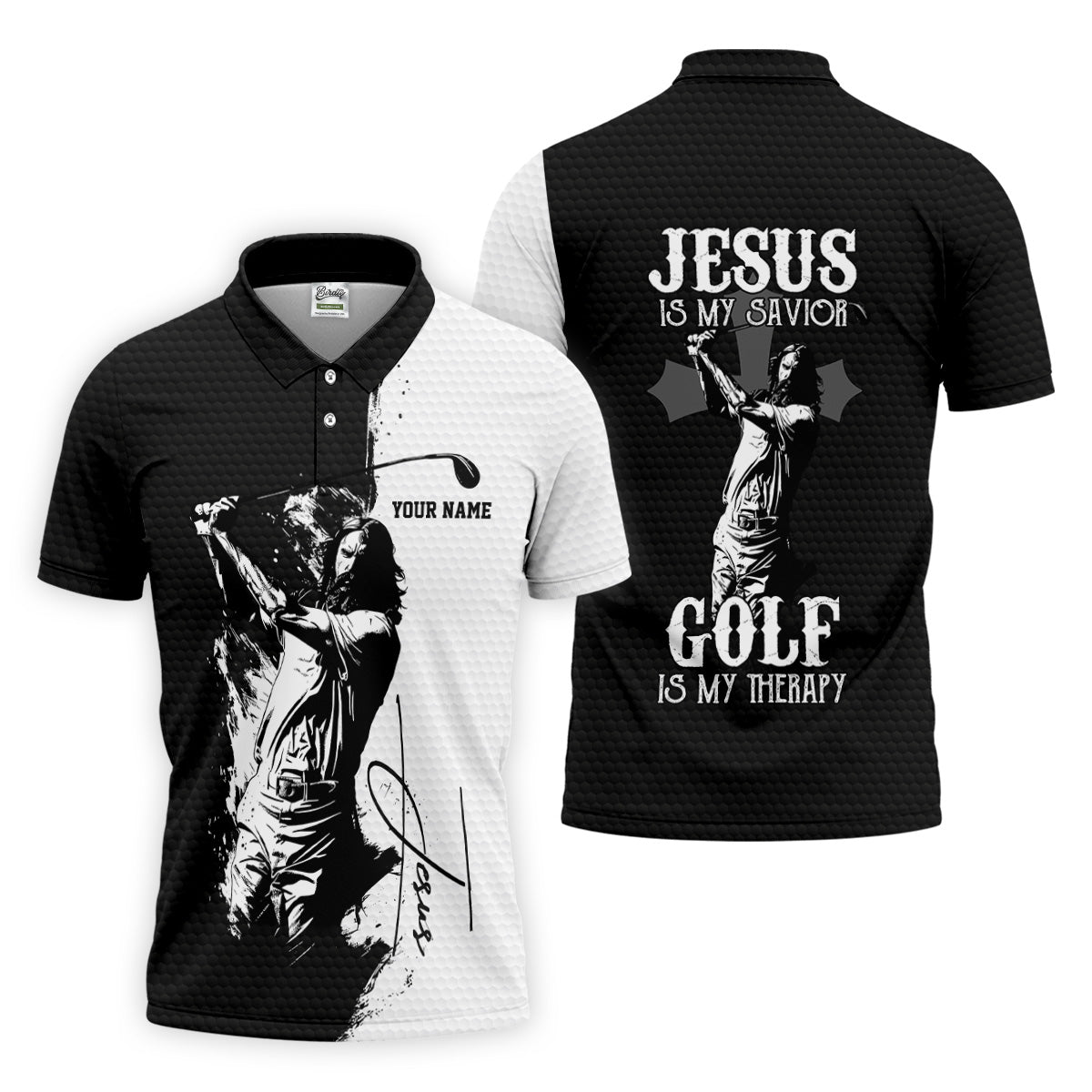 Jesus Is My Savior Golf Is My Therapy Christian Golf Shirt, Black And White Golf Polo, Polo Shirts For Men