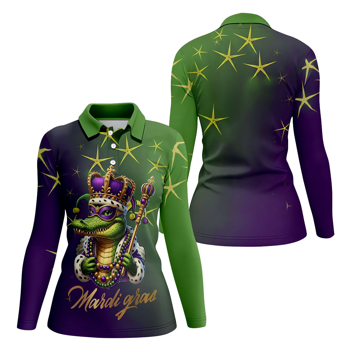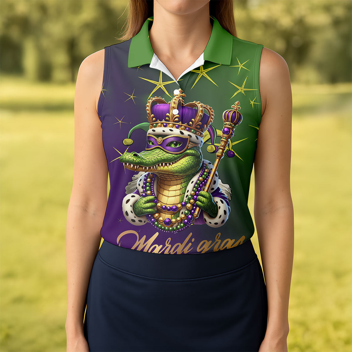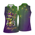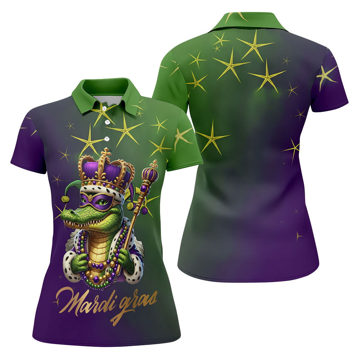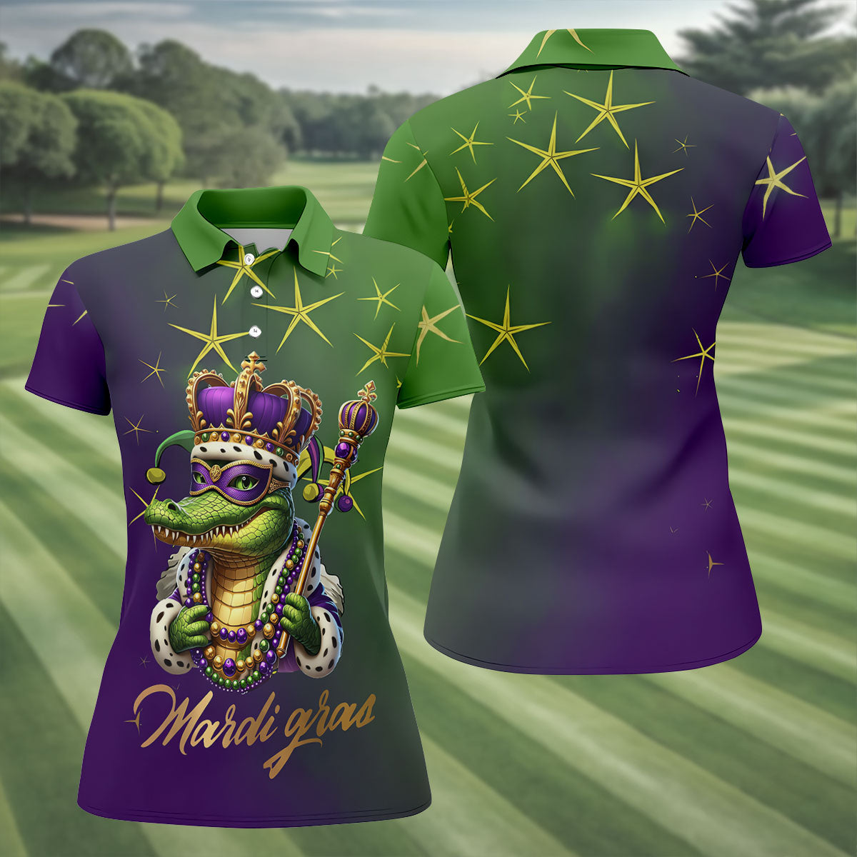Mardi Gras Aligator Crown Mask Purple Green Gold Women's Golf Shirts, Women's Golf Tops, Ladies Golf Shirts