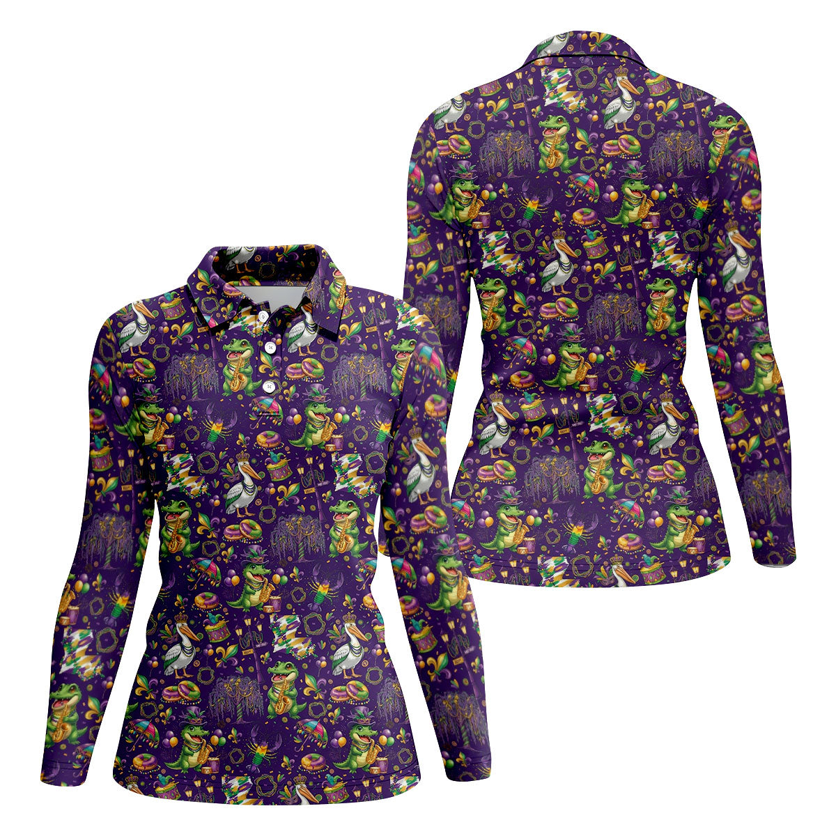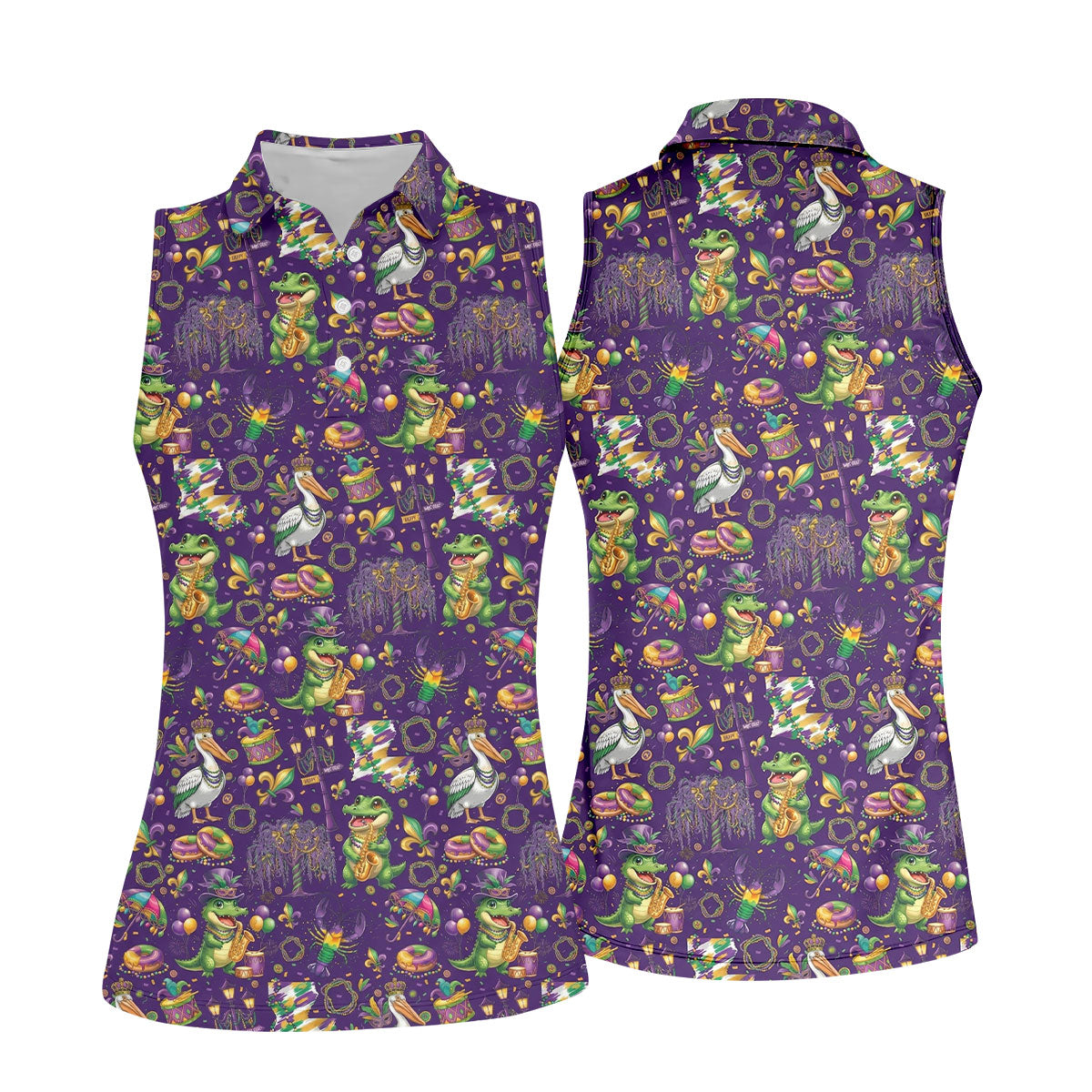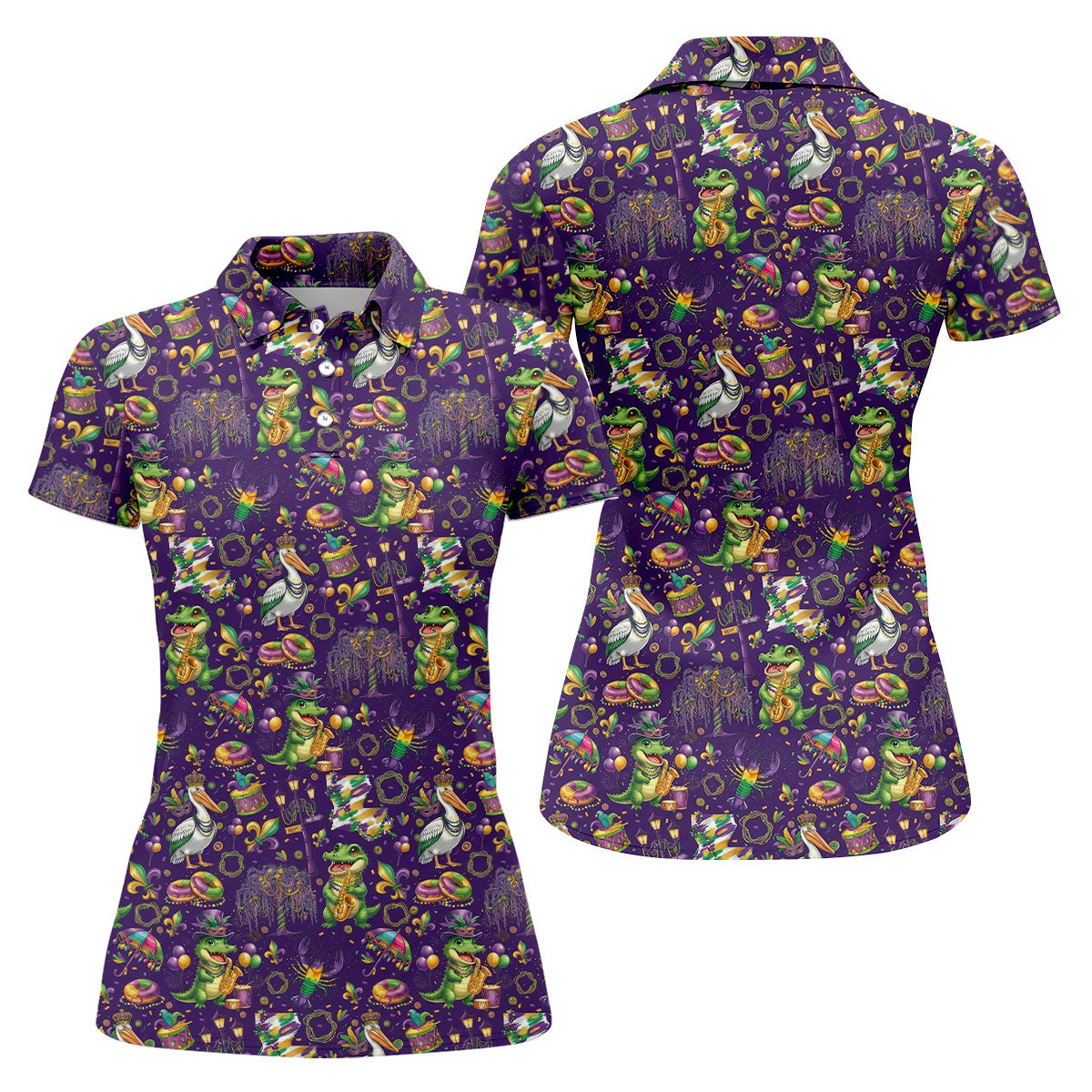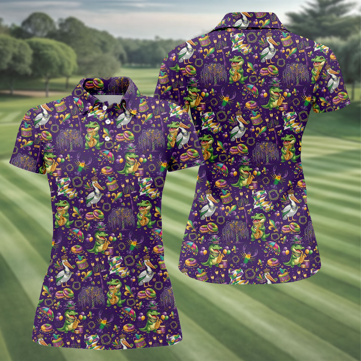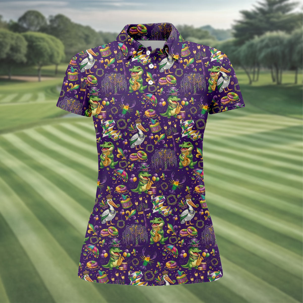 Mardi Gras Fleur De Lis Animal Band Purple Golf Shirt, Women's Golf Shirts, Ladies Golf Polos