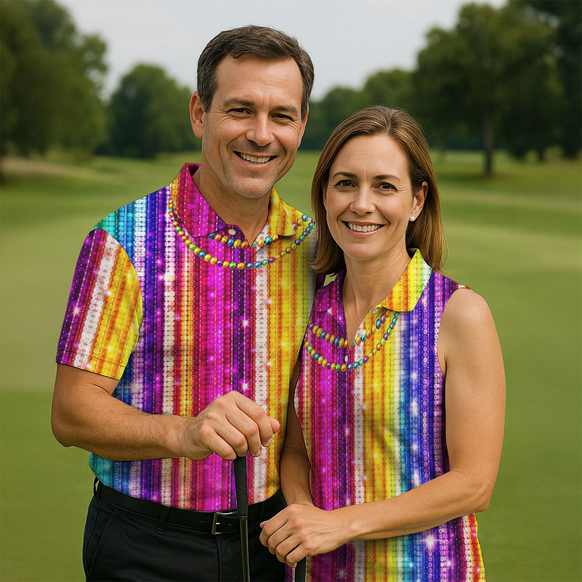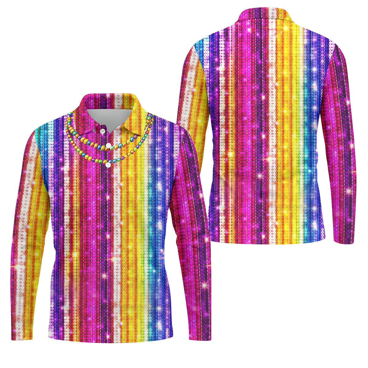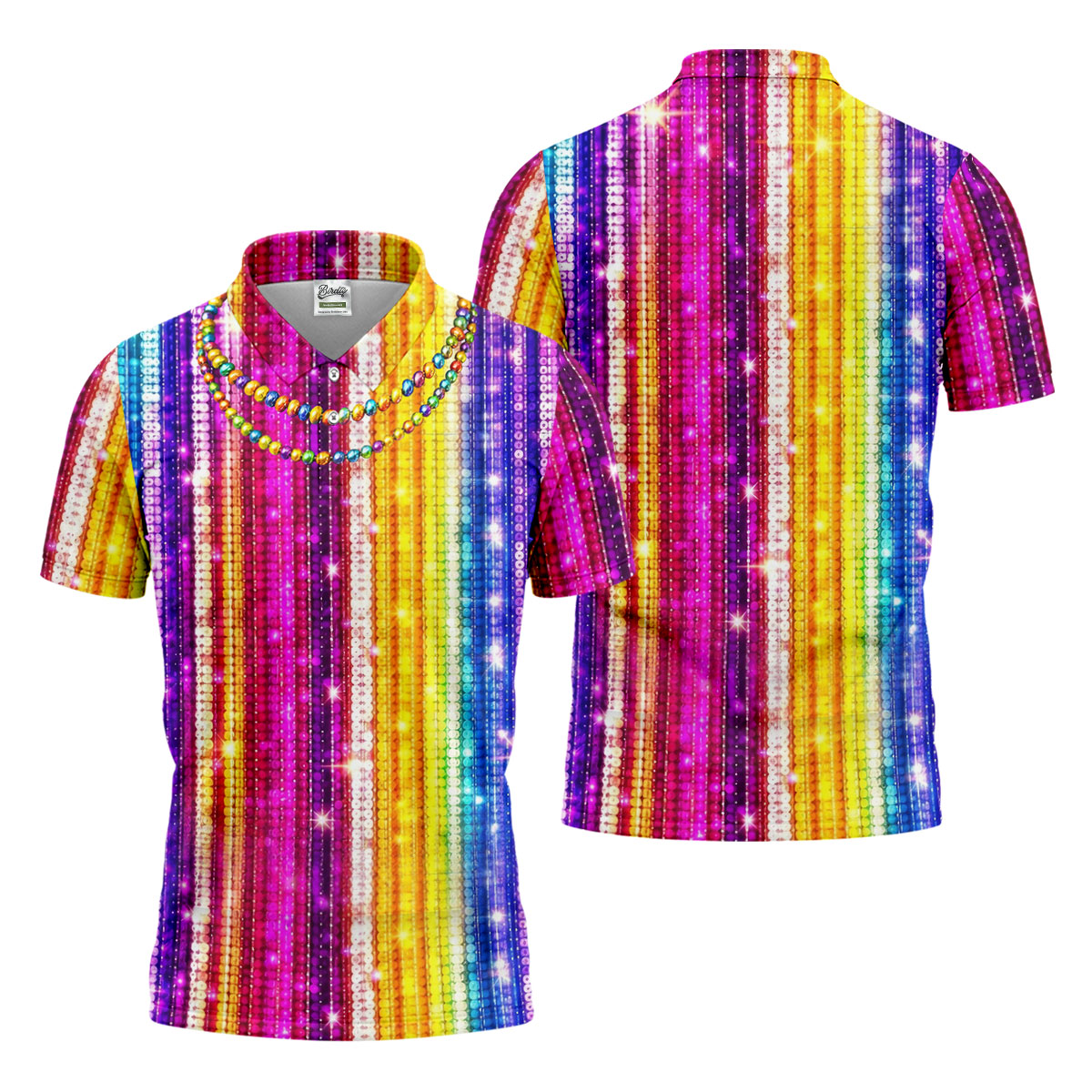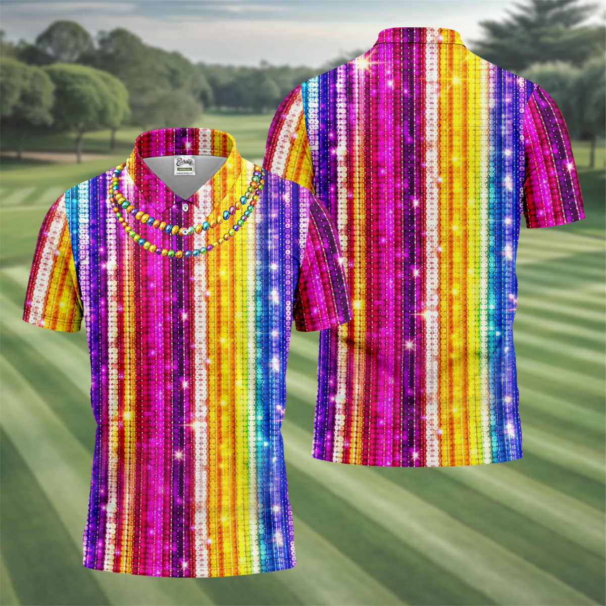 Mardi Gras Sequinned Glitter Print Golf Tops For Men, Polo Shirts For Men, Golf Shirts For Men