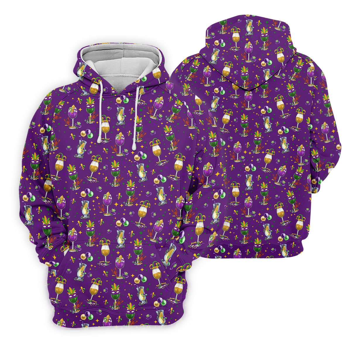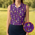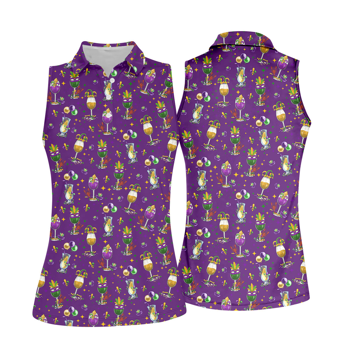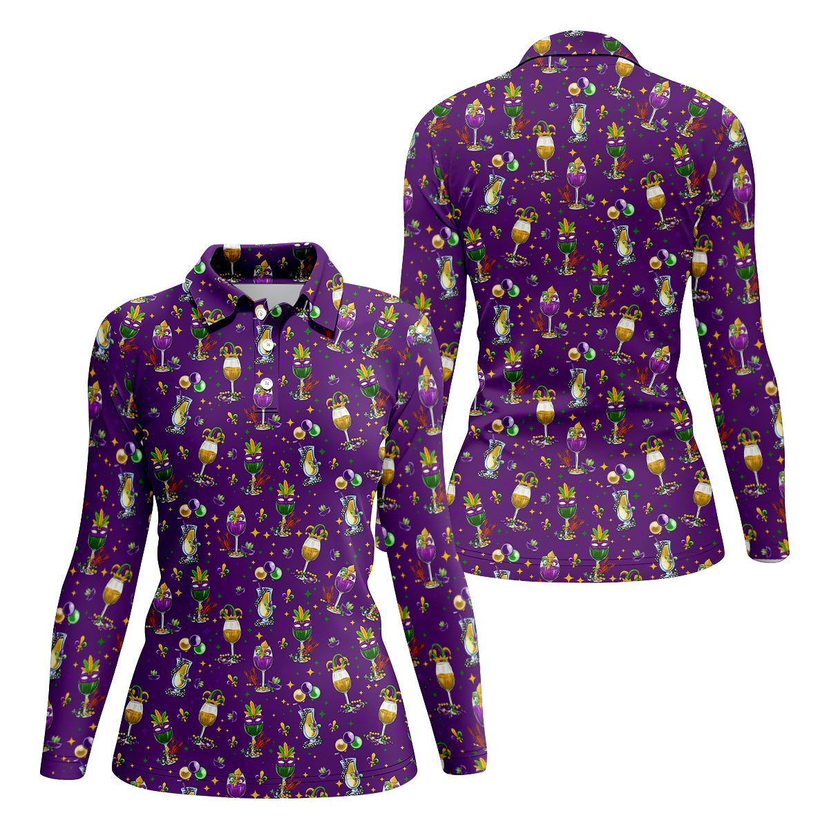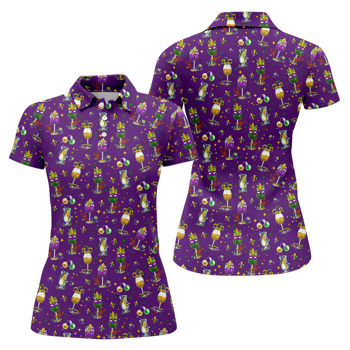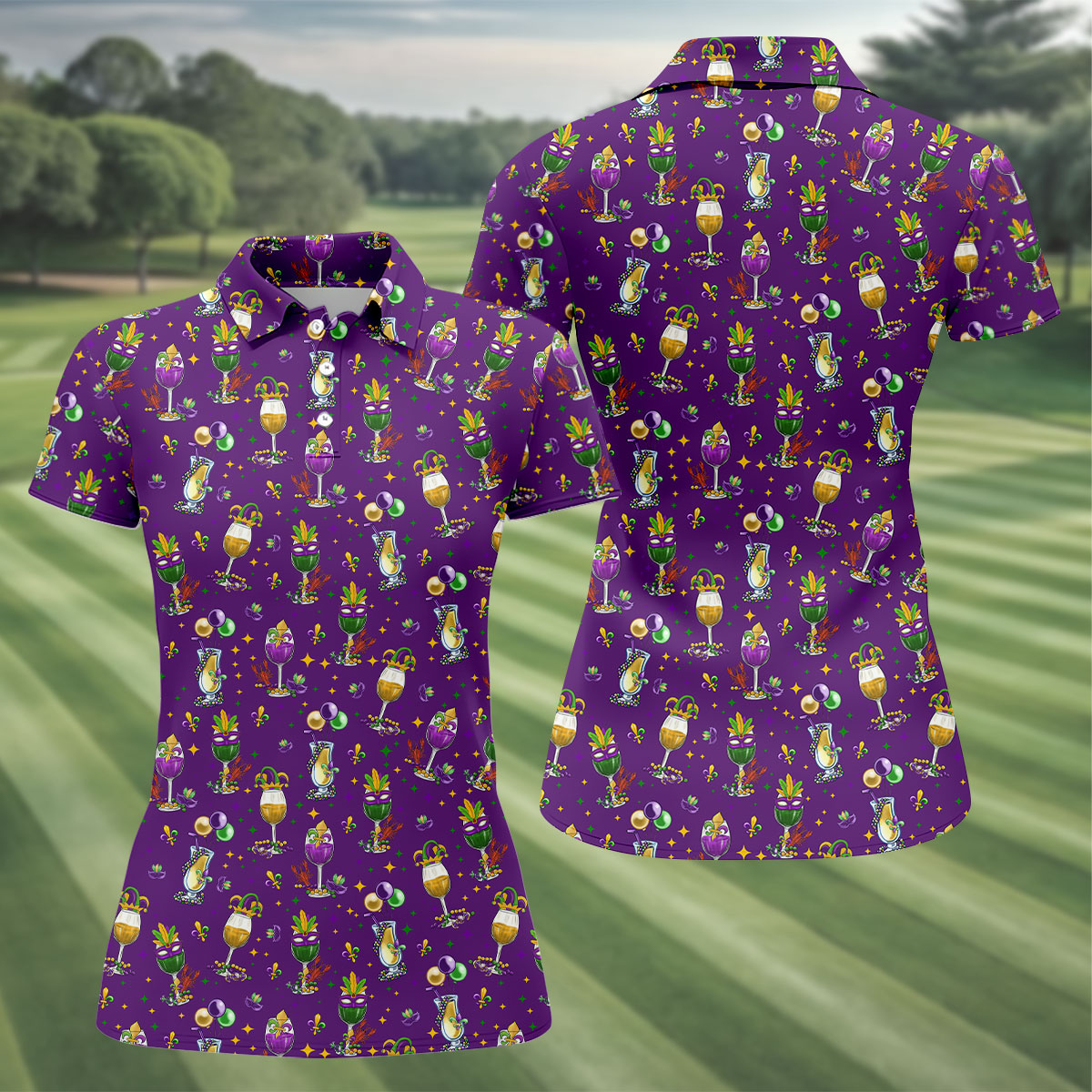 Mardi Gras Wine Glass Beaded Garland Fleur De Lis Purple Golf Shirt, Women's Golf Tops, Ladies Golf Polos