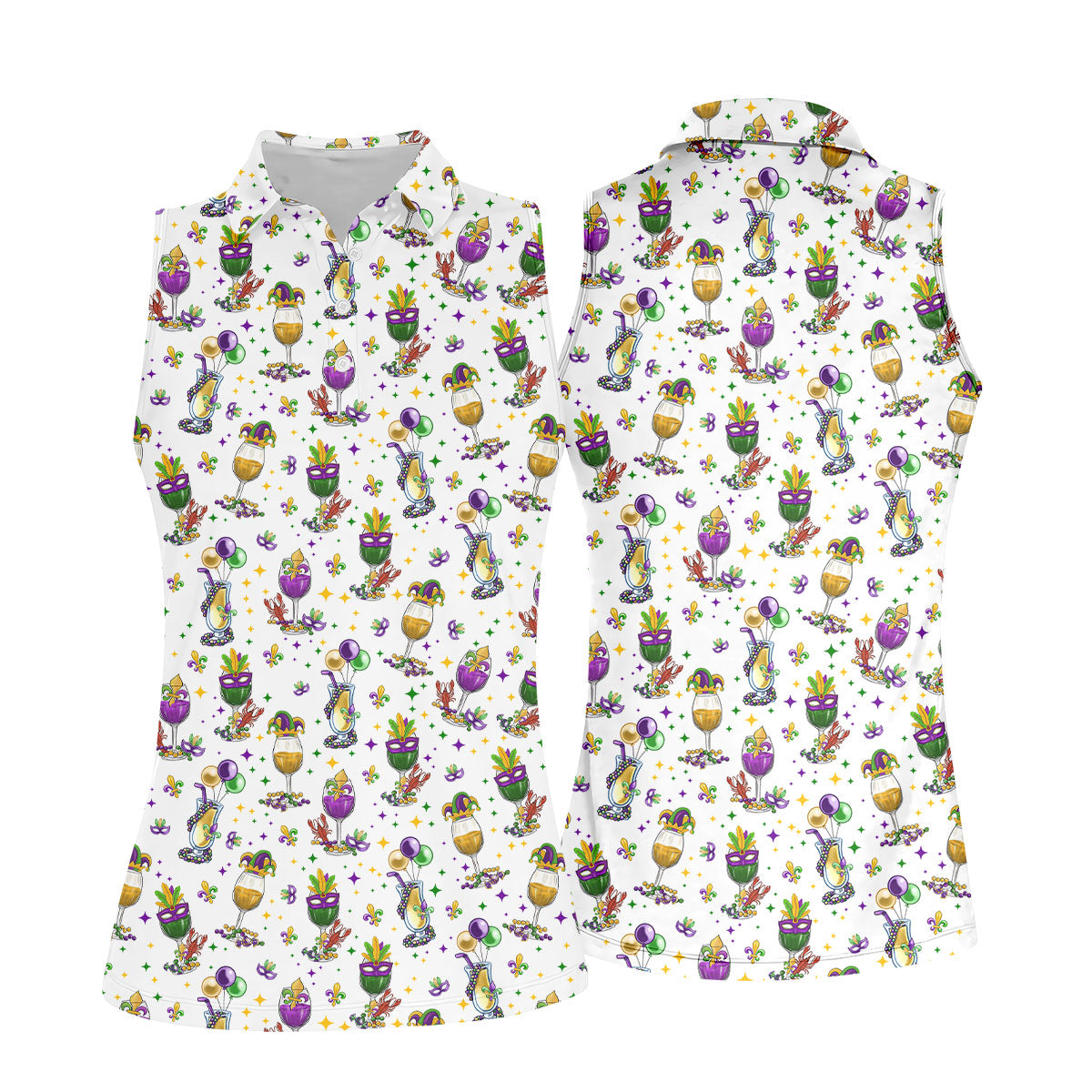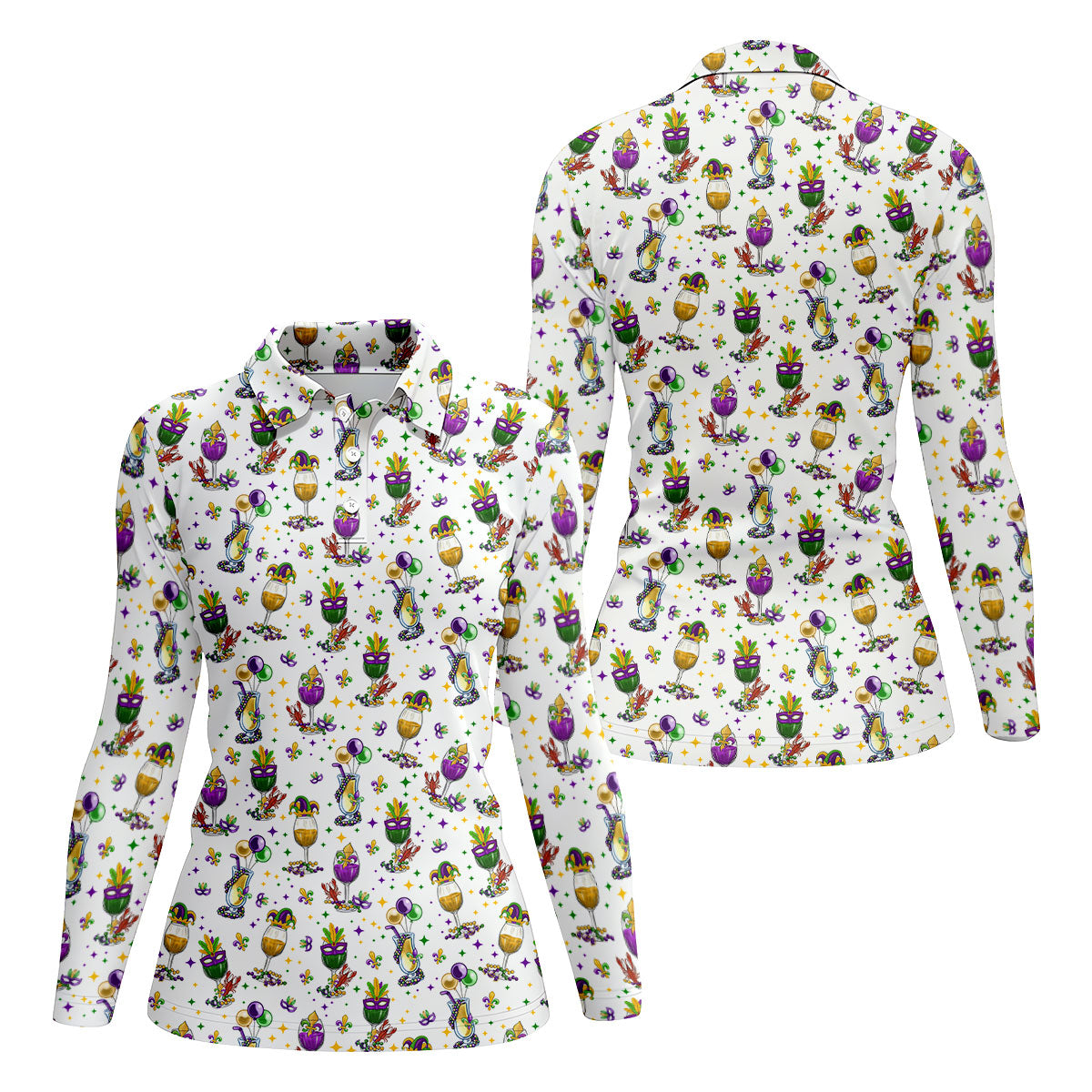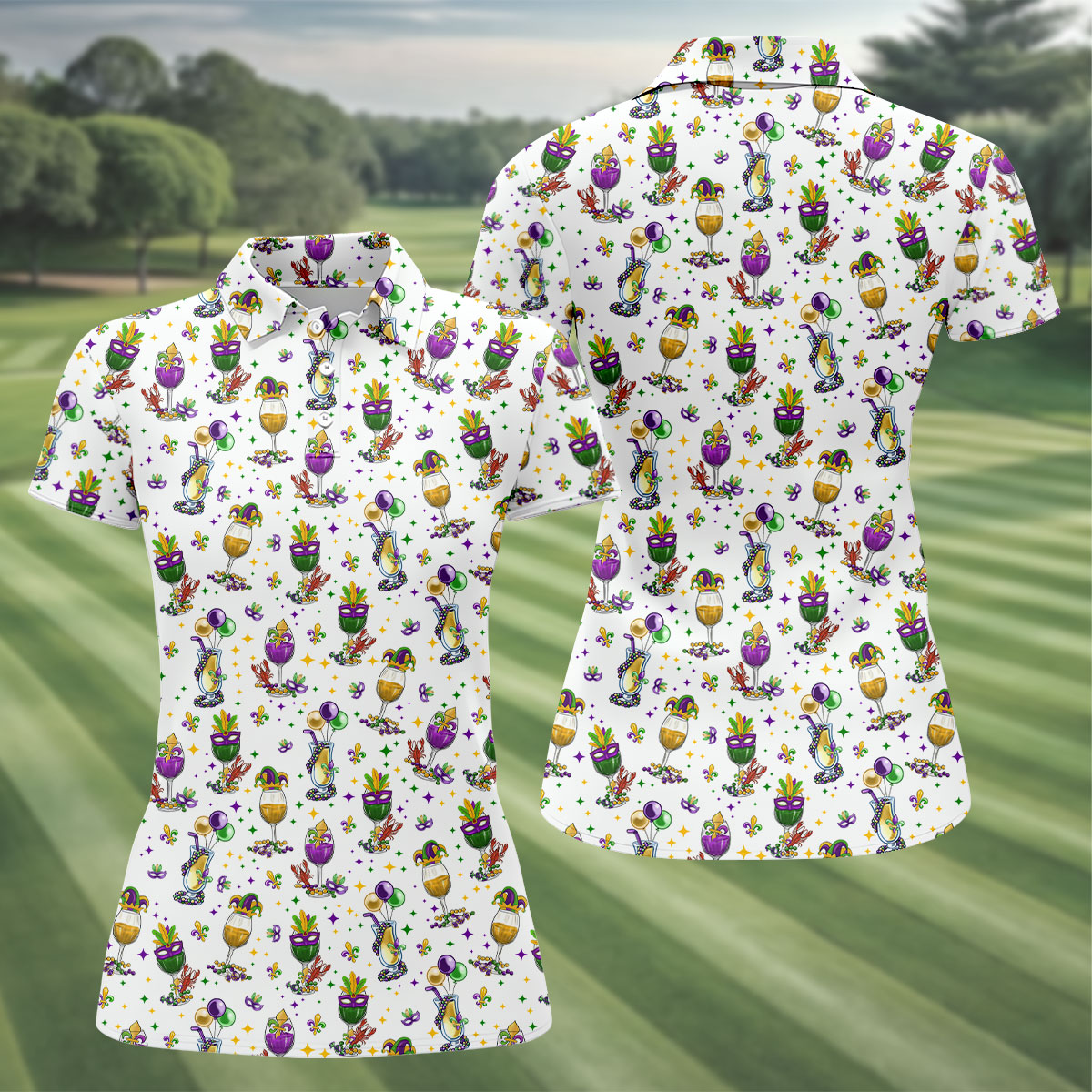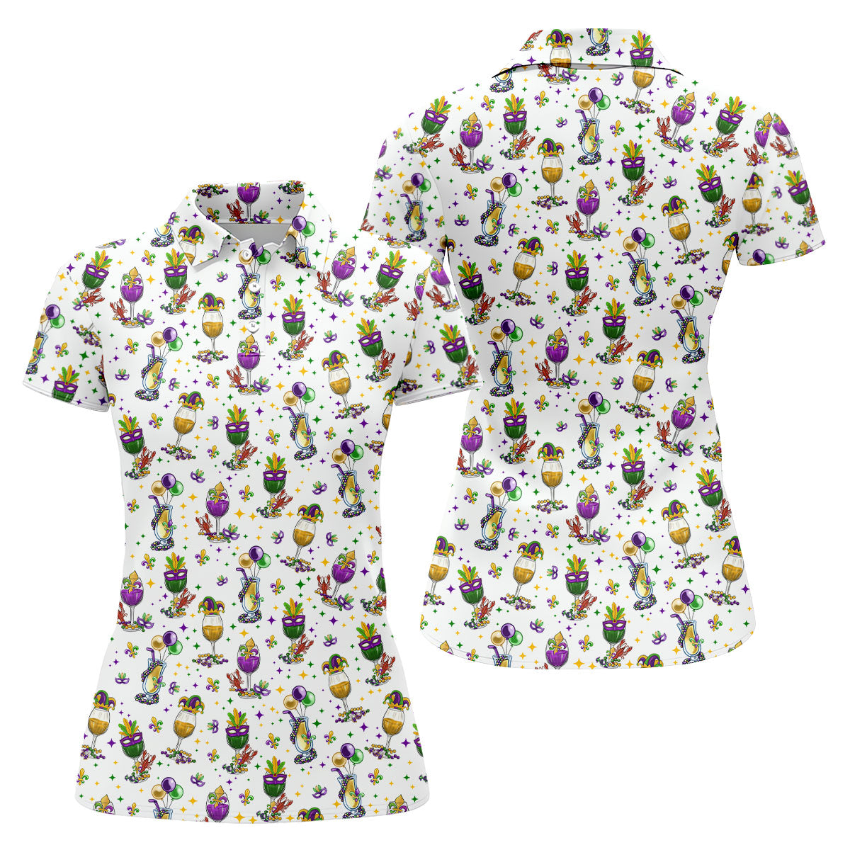 Mardi Gras Wine Glass Beaded Garland Fleur De Lis White Golf Shirt, Women's Golf Tops, Ladies Golf Polos