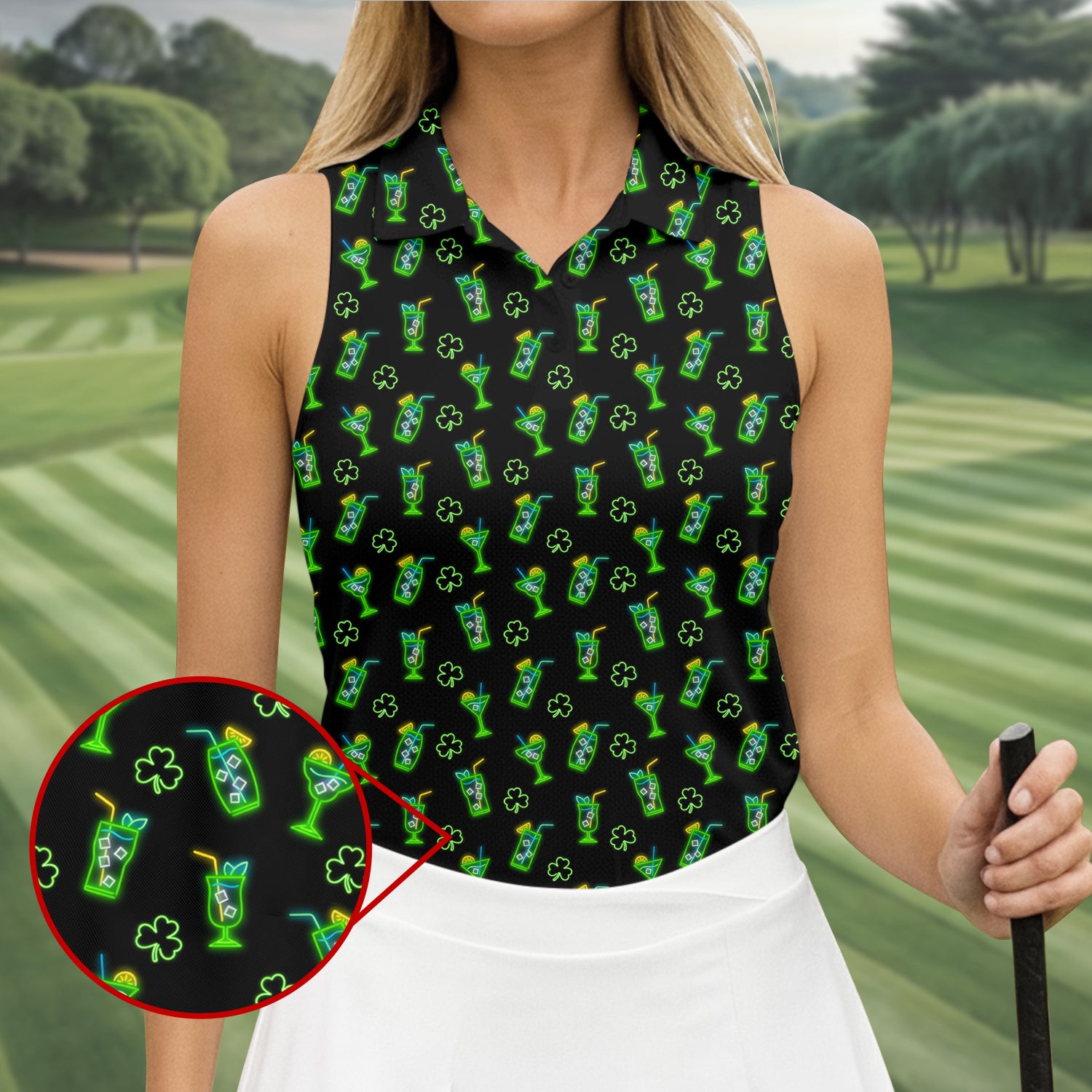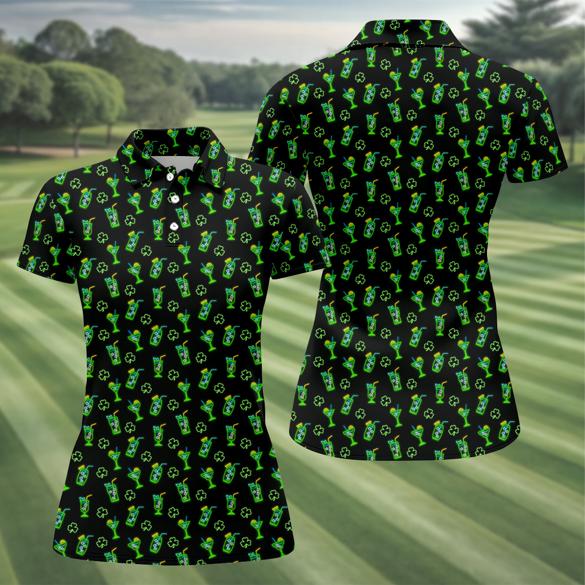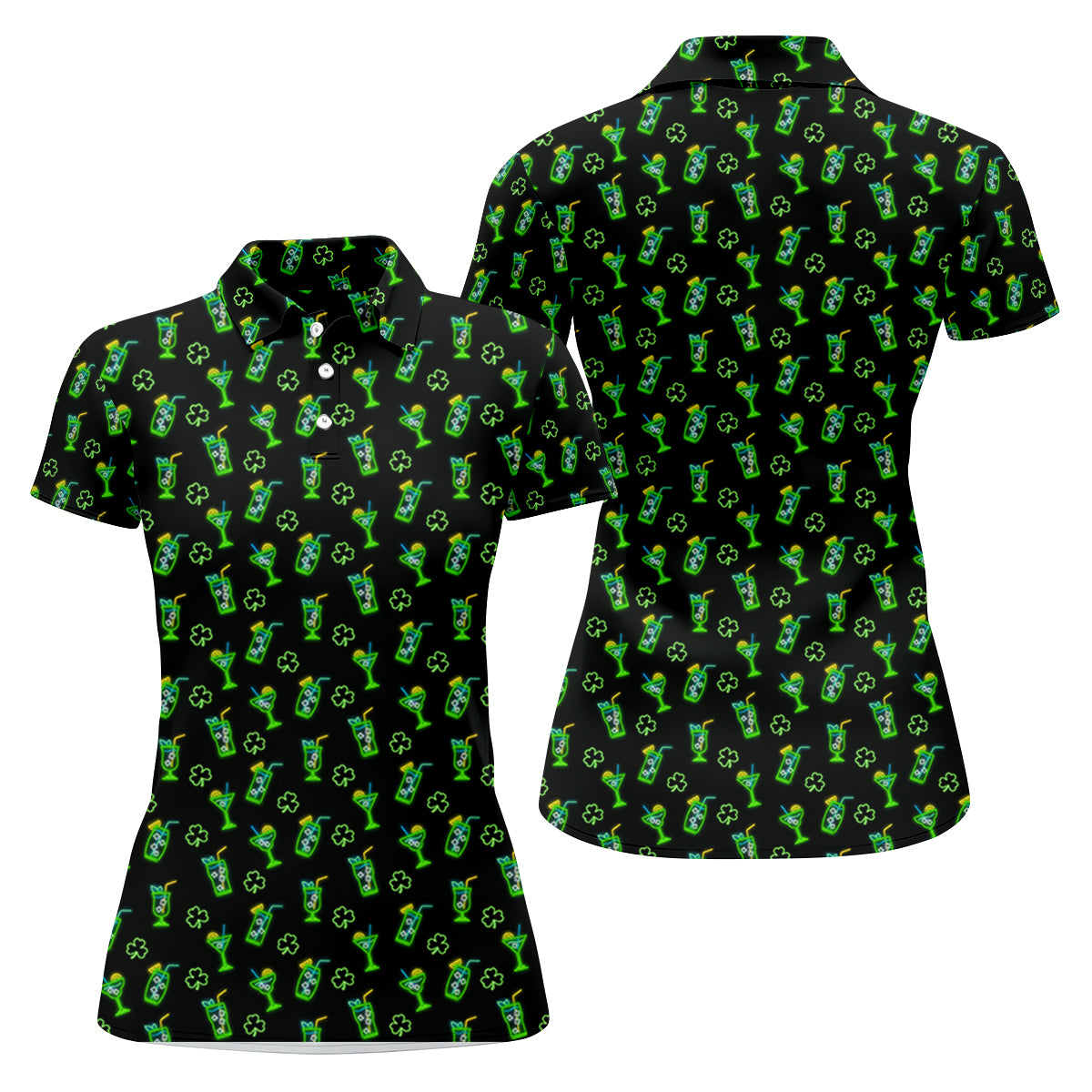 Neon Green Cocktails Three Leaf Clover St Patrick's Day Golf Shirt, Women's Golf Tops, Ladies Golf Shirts